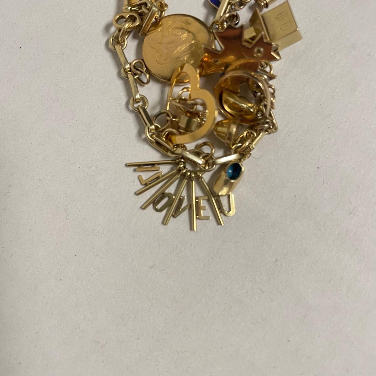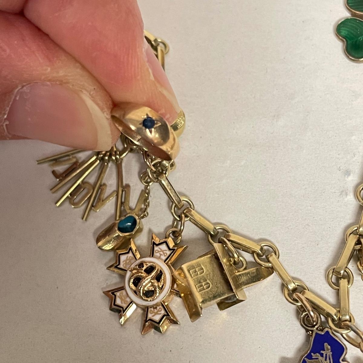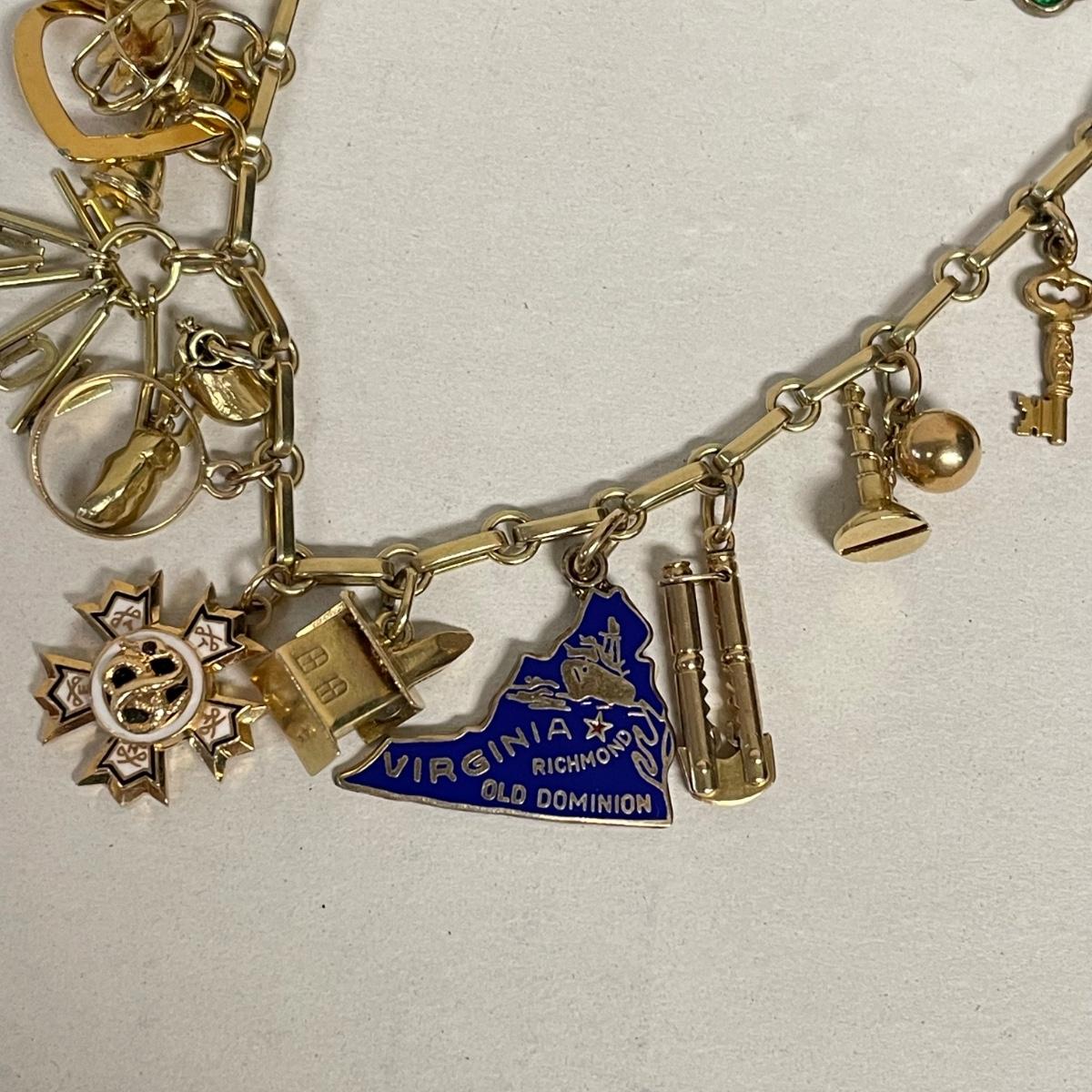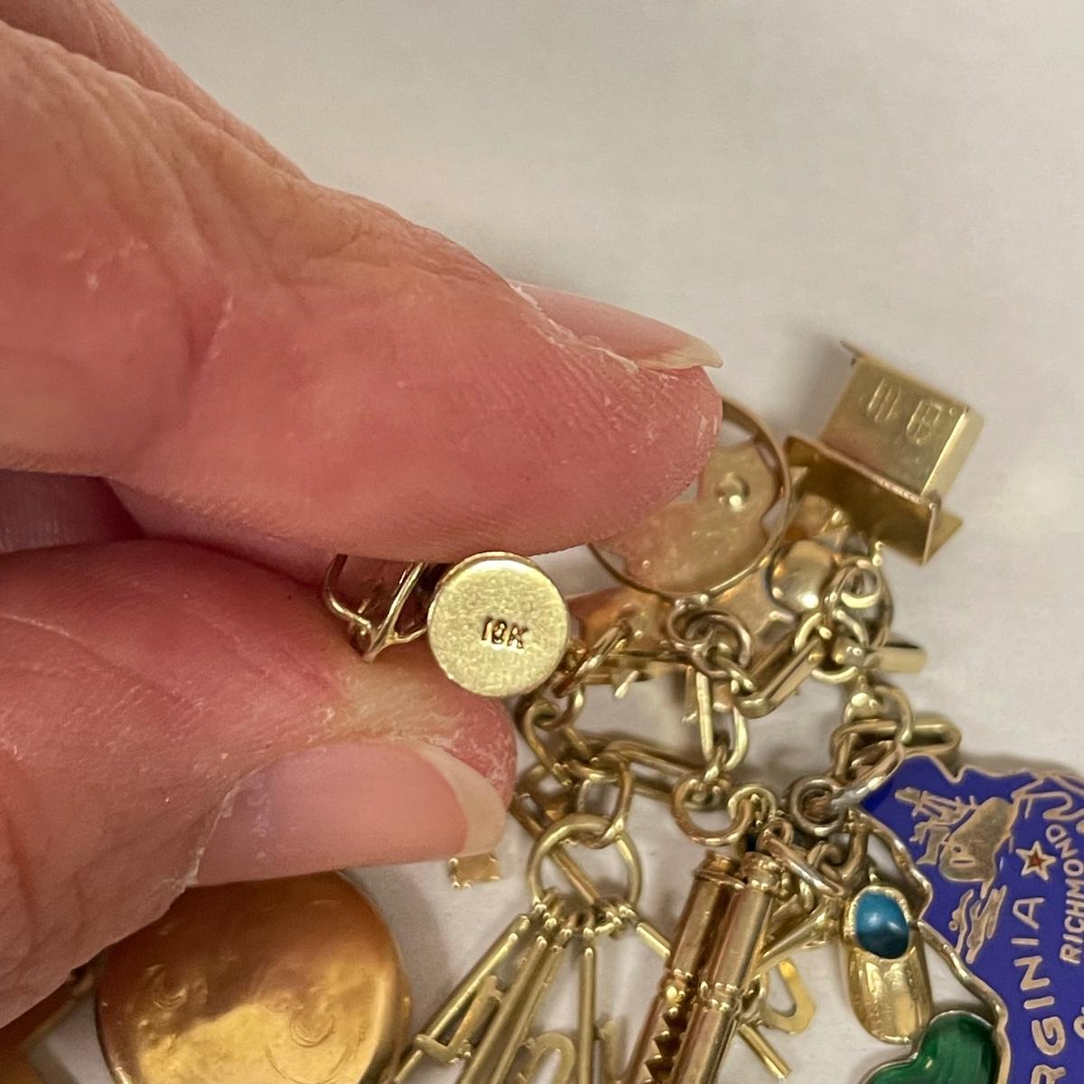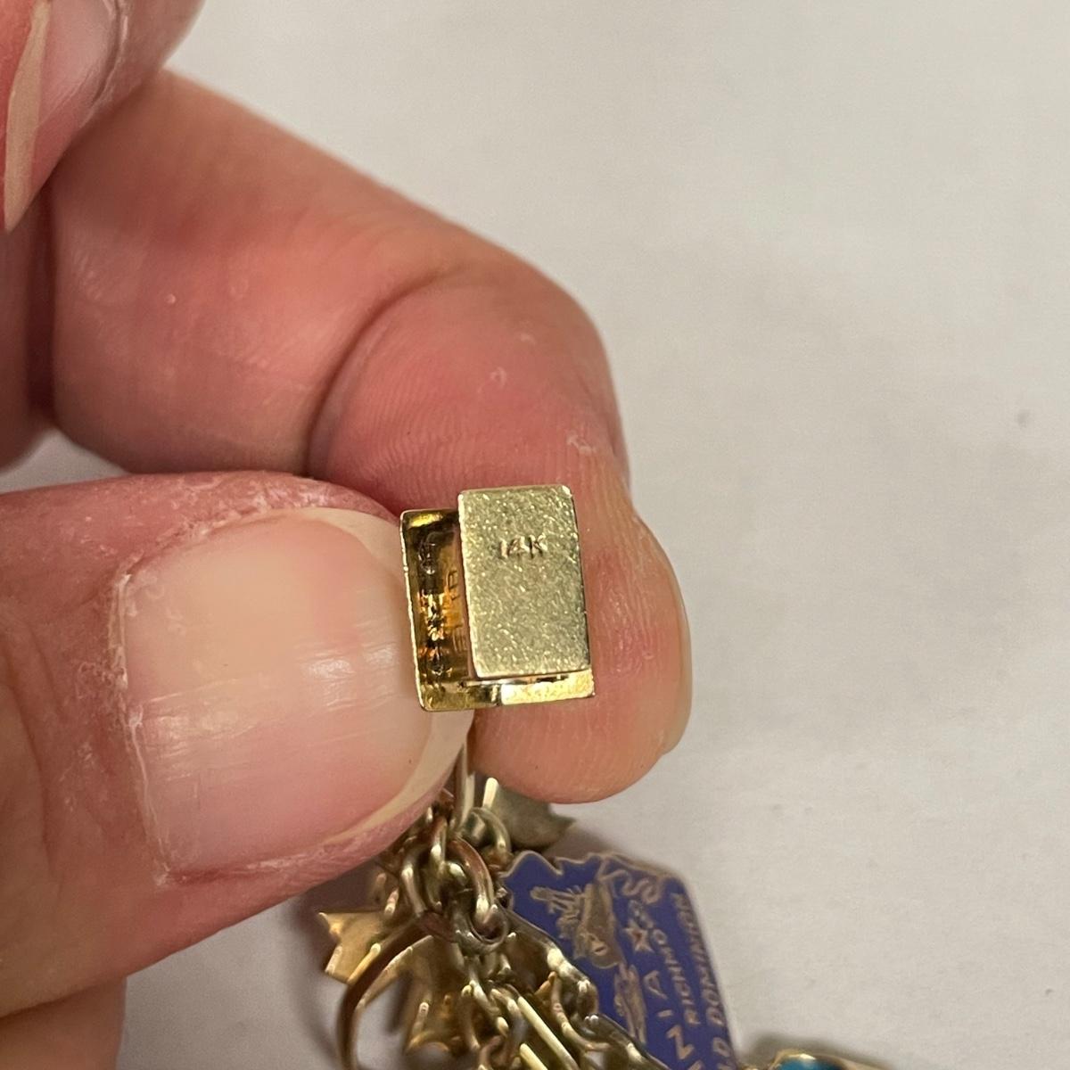 Lot features linked gold bracelet marked 10K by J Bohan with a cobalt blue colored gem in its toggle clasp. The charm bracelet has a spring ring clasp marked 14k and multiple fun and unique charms. Known markings include Sterling on the clover and Virginia charms, 14k on the church and 10k on the desk fan and cross. Lot also includes a shiny silver colored heart & locket charm bracelet that appears to have fresh water pearls. An extra pair of thick round chain pieces and two sets of bangles are also in this collection. See images. Shipping available. All sales are final. No returns or refunds. Please bid accordingly.
