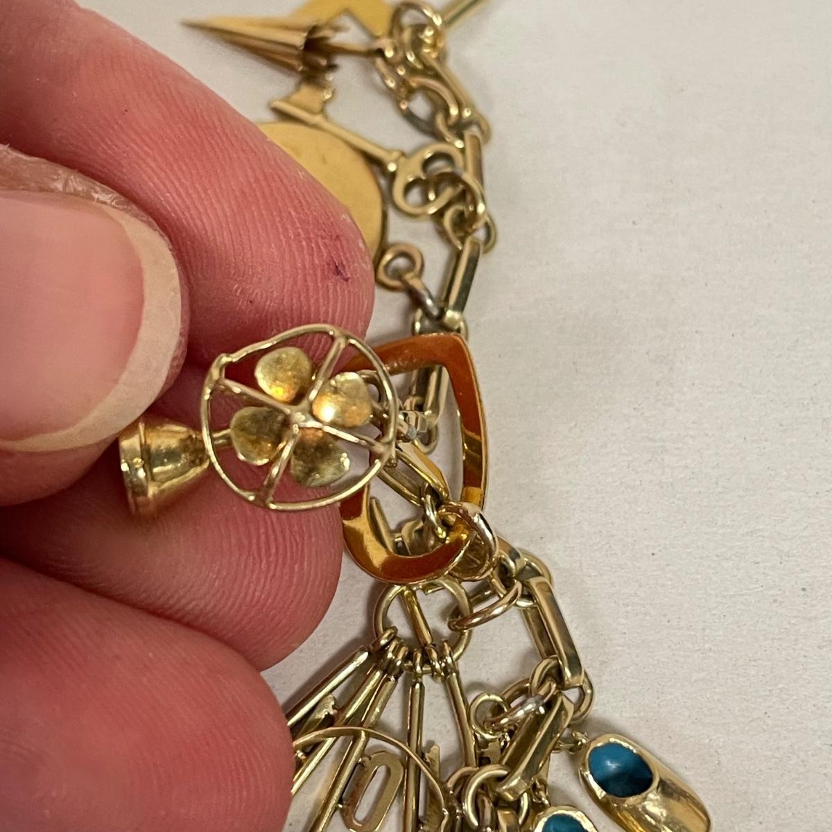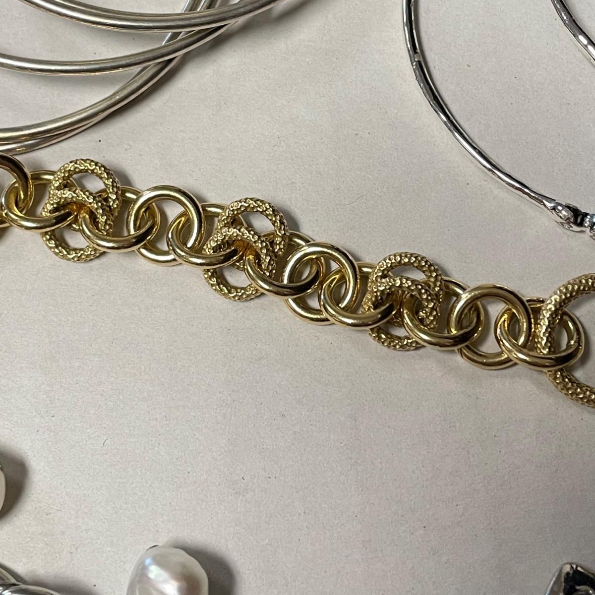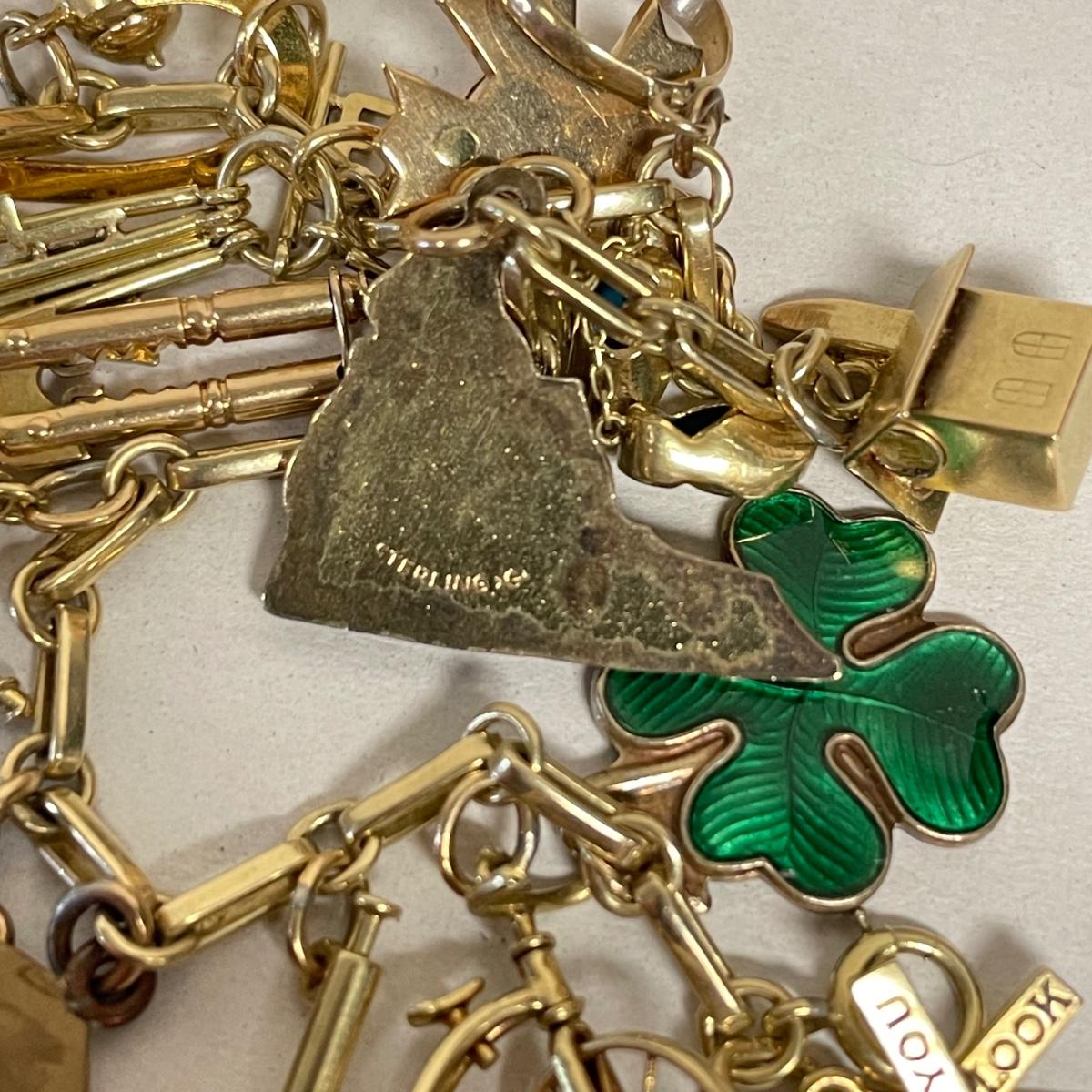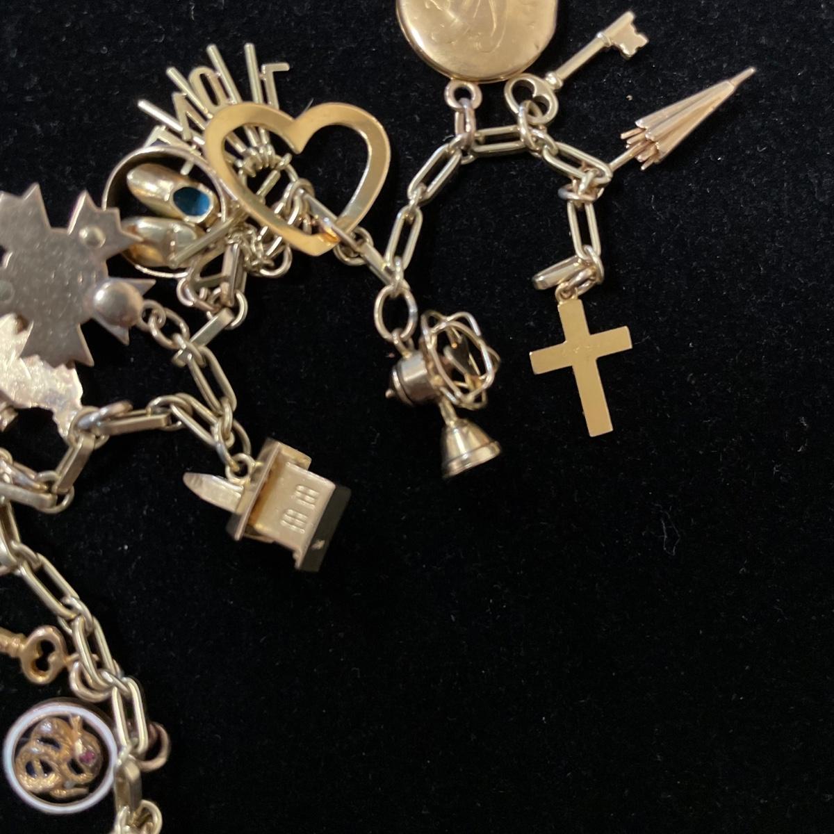 Lot features linked gold bracelet marked 10K by J Bohan with a cobalt blue colored gem in its toggle clasp. The charm bracelet has a spring ring clasp marked 14k and multiple fun and unique charms. Known markings include Sterling on the clover and Virginia charms, 14k on the church and 10k on the desk fan and cross. Lot also includes a shiny silver colored heart & locket charm bracelet that appears to have fresh water pearls. An extra pair of thick round chain pieces and two sets of bangles are also in this collection. See images. Shipping available. All sales are final. No returns or refunds. Please bid accordingly.