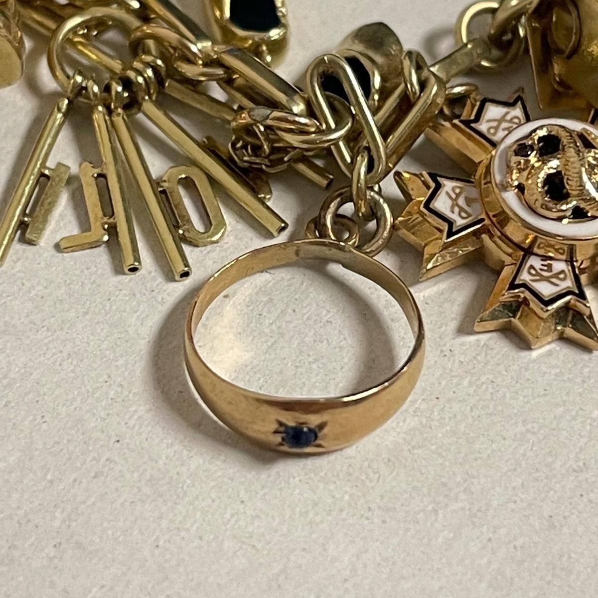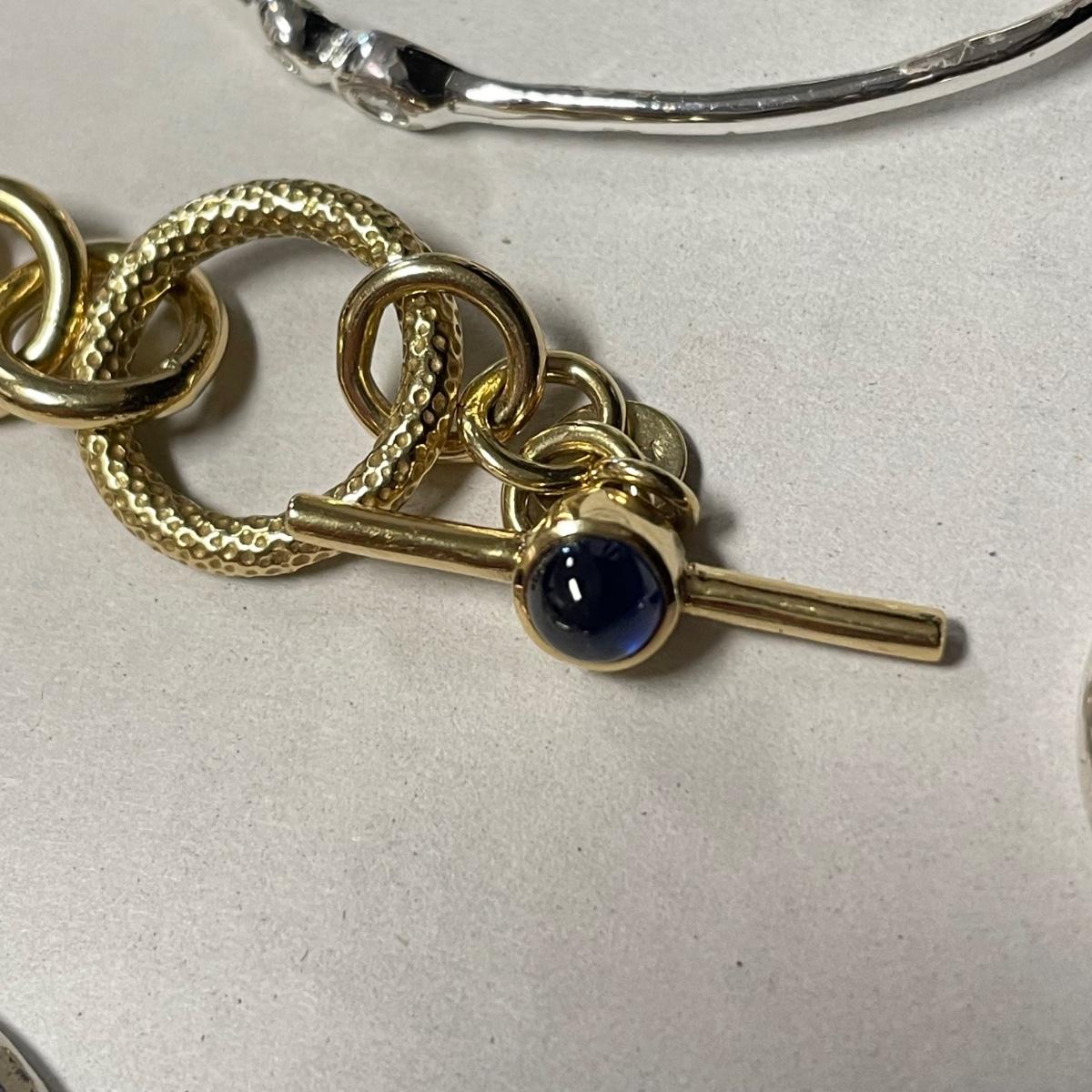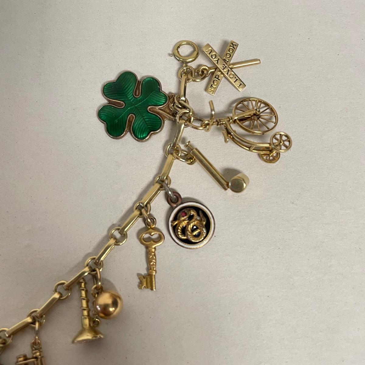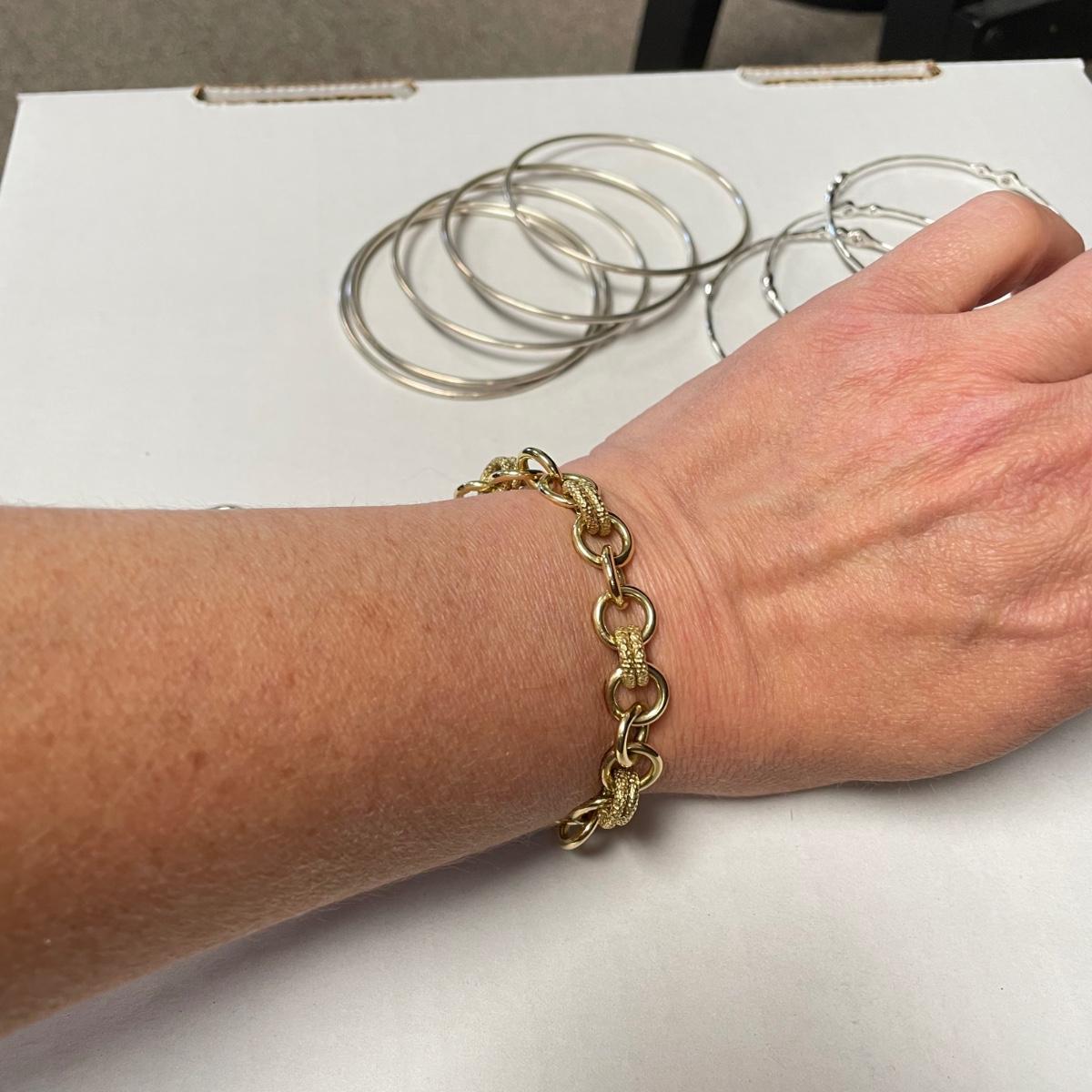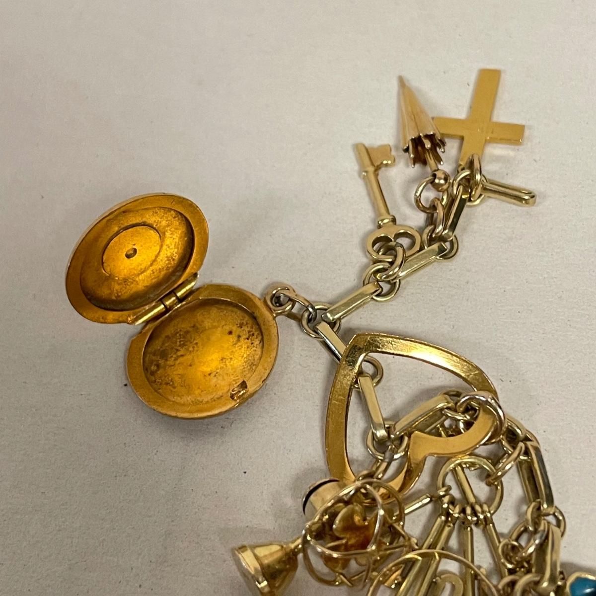 Lot features linked gold bracelet marked 10K by J Bohan with a cobalt blue colored gem in its toggle clasp. The charm bracelet has a spring ring clasp marked 14k and multiple fun and unique charms. Known markings include Sterling on the clover and Virginia charms, 14k on the church and 10k on the desk fan and cross. Lot also includes a shiny silver colored heart & locket charm bracelet that appears to have fresh water pearls. An extra pair of thick round chain pieces and two sets of bangles are also in this collection. See images. Shipping available. All sales are final. No returns or refunds. Please bid accordingly.