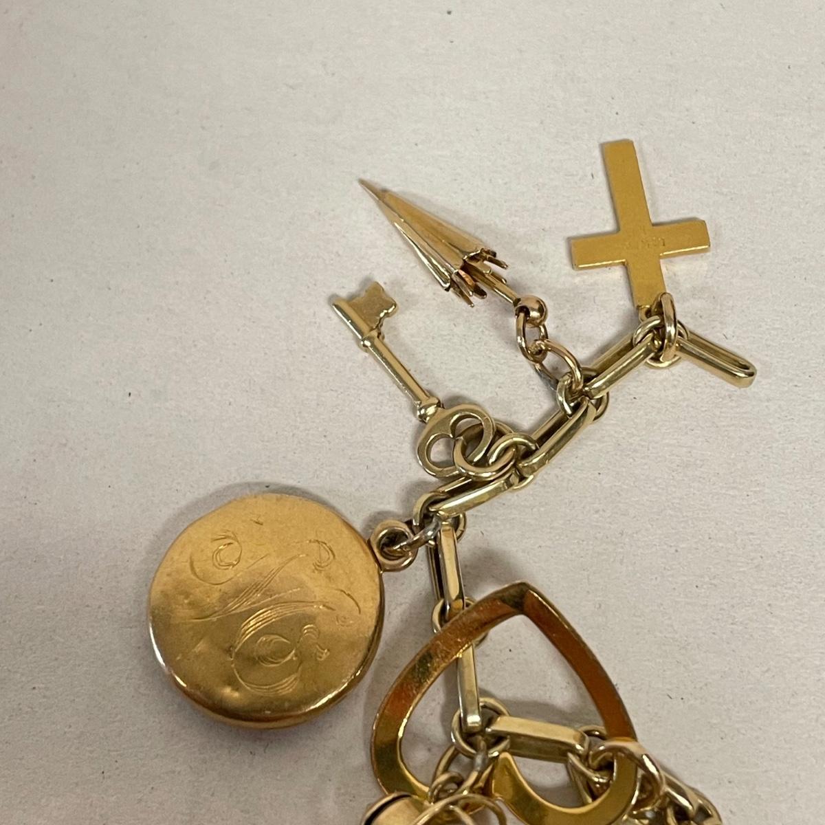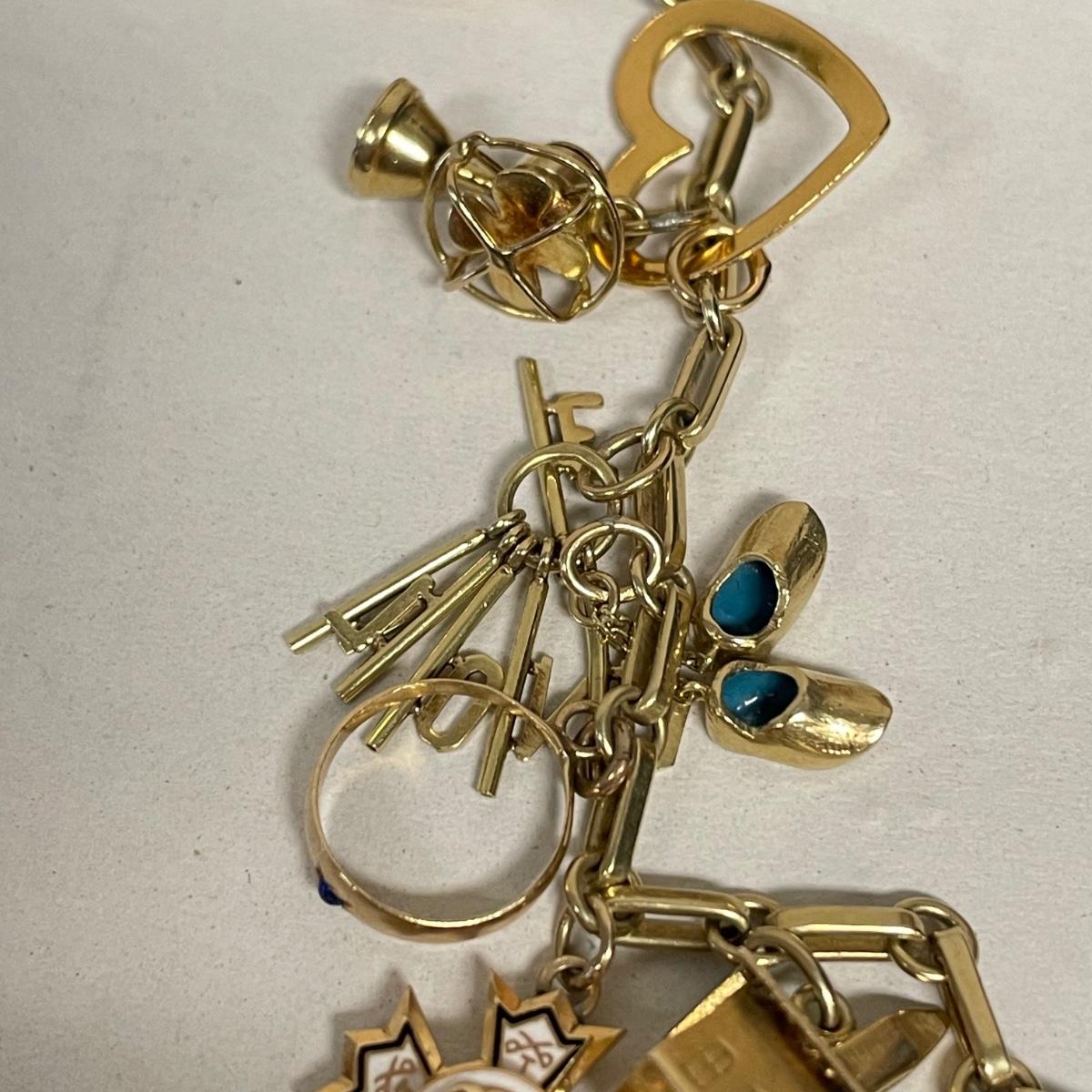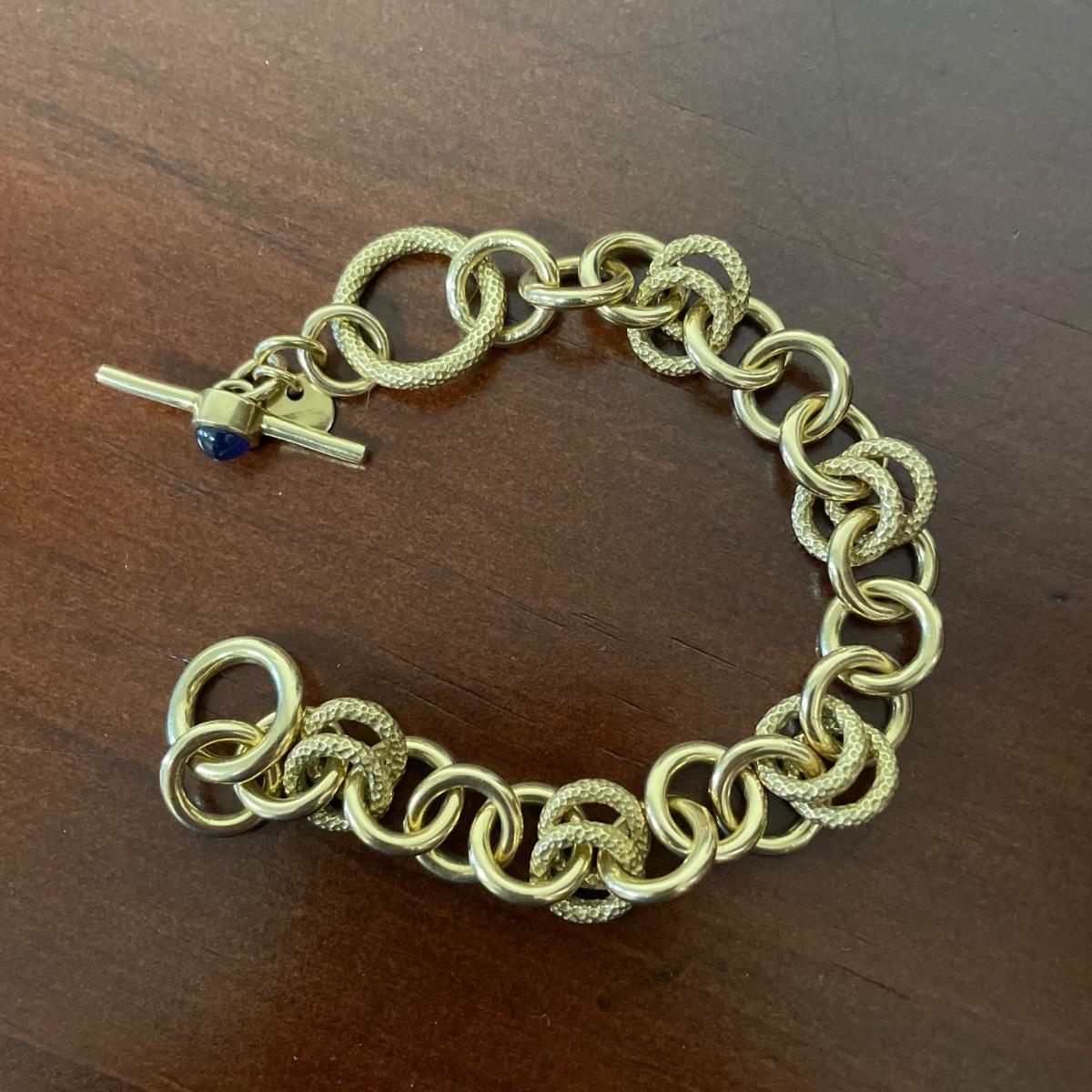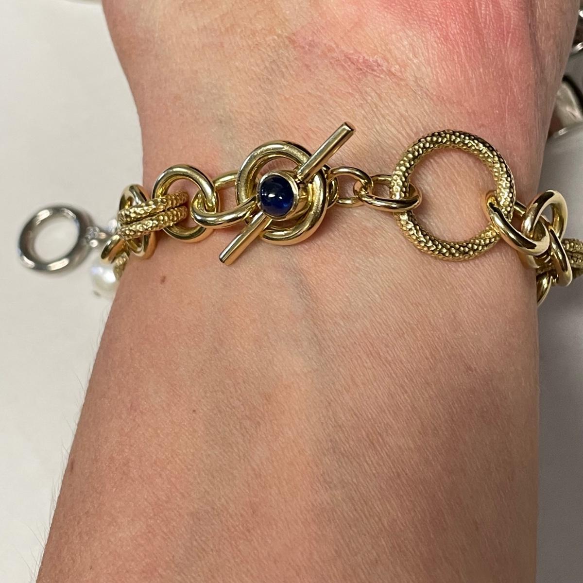 Lot features linked gold bracelet marked 10K by J Bohan with a cobalt blue colored gem in its toggle clasp. The charm bracelet has a spring ring clasp marked 14k and multiple fun and unique charms. Known markings include Sterling on the clover and Virginia charms, 14k on the church and 10k on the desk fan and cross. Lot also includes a shiny silver colored heart & locket charm bracelet that appears to have fresh water pearls. An extra pair of thick round chain pieces and two sets of bangles are also in this collection. See images. Shipping available. All sales are final. No returns or refunds. Please bid accordingly.