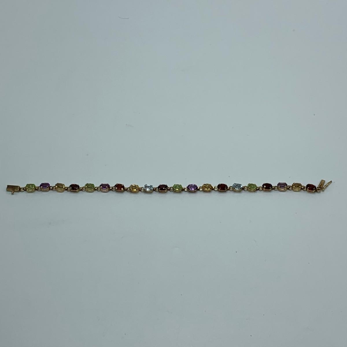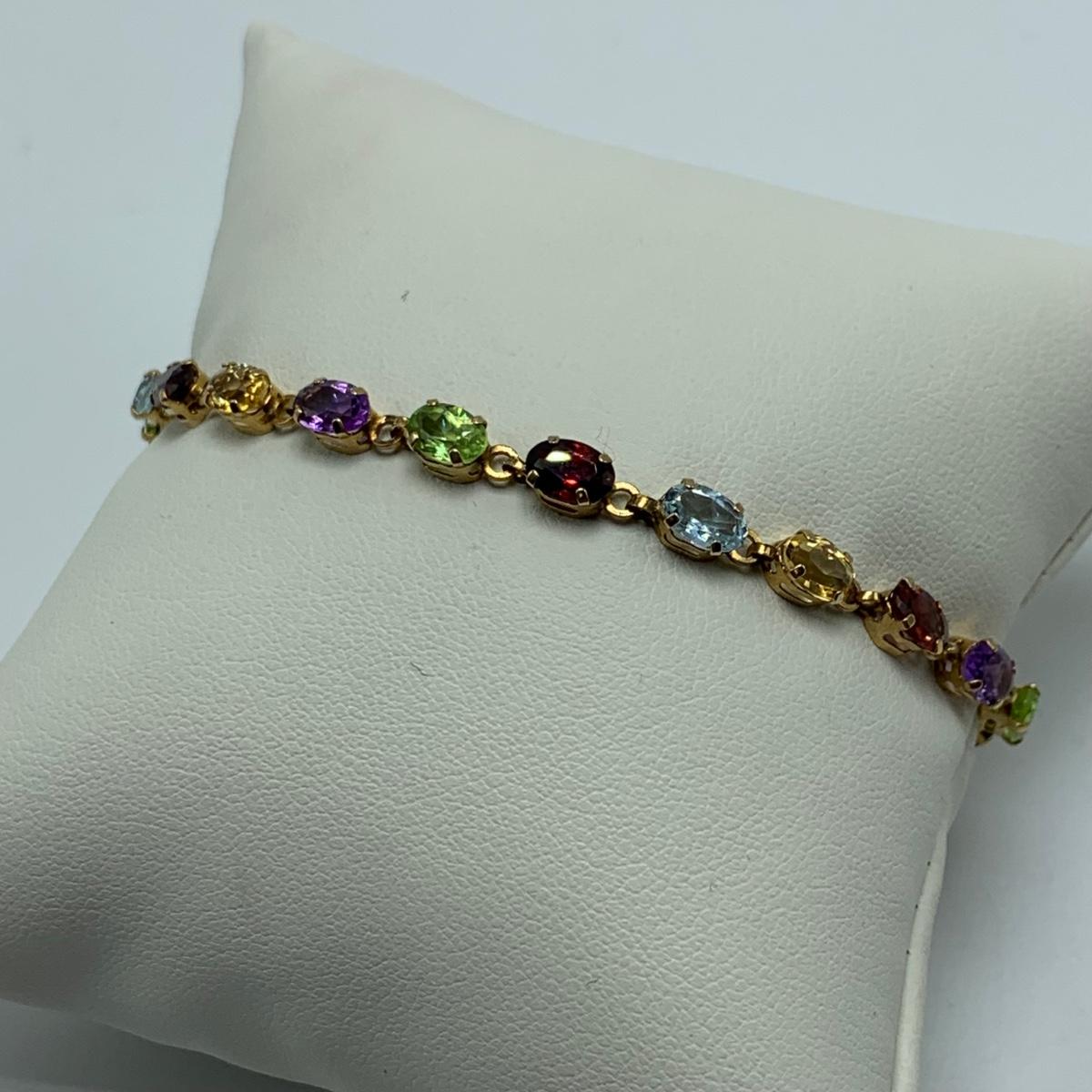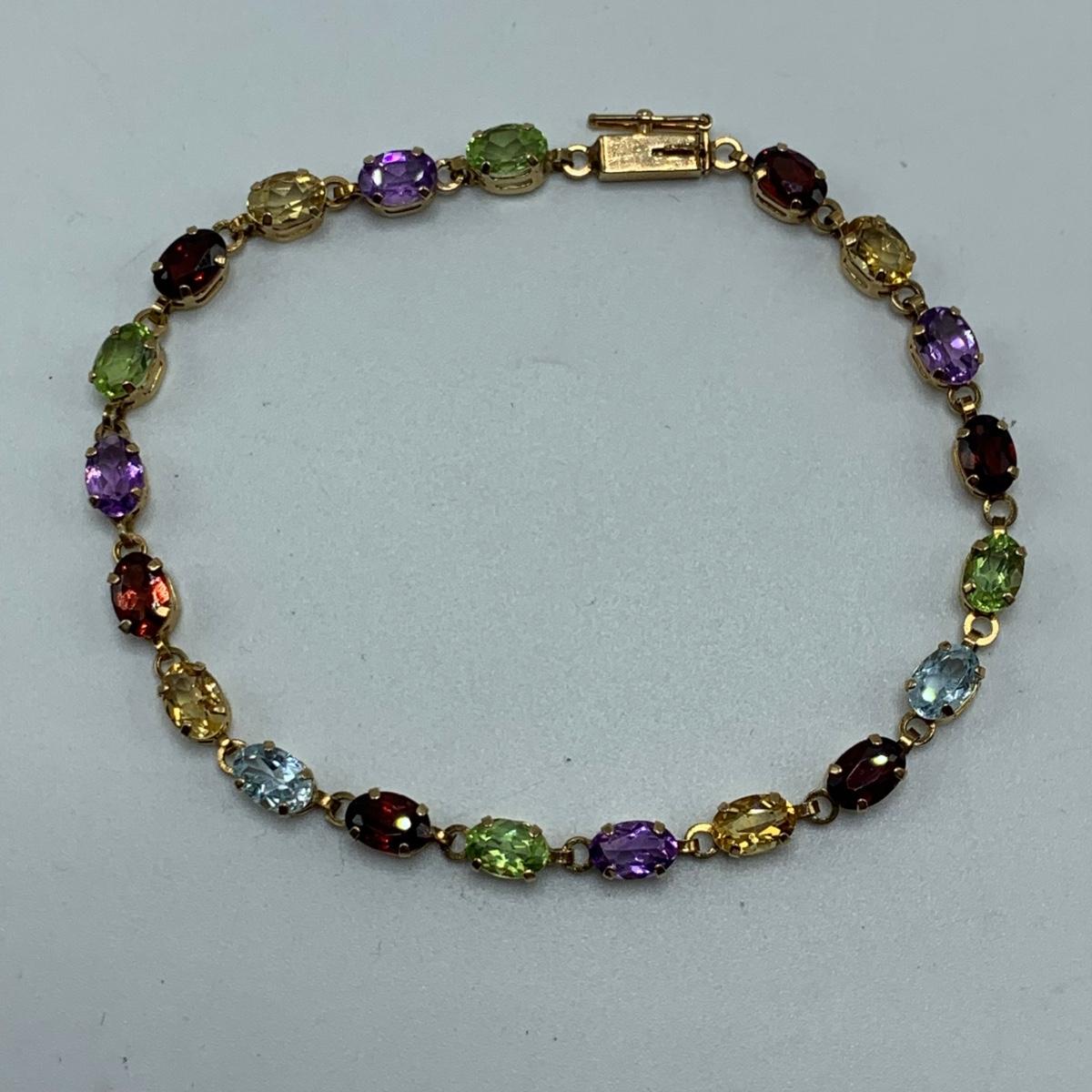 A bracelet with multi-colored gemstones. Bracelet is stamped “˜10K’. Bracelet is 7.5”Comes with a case.