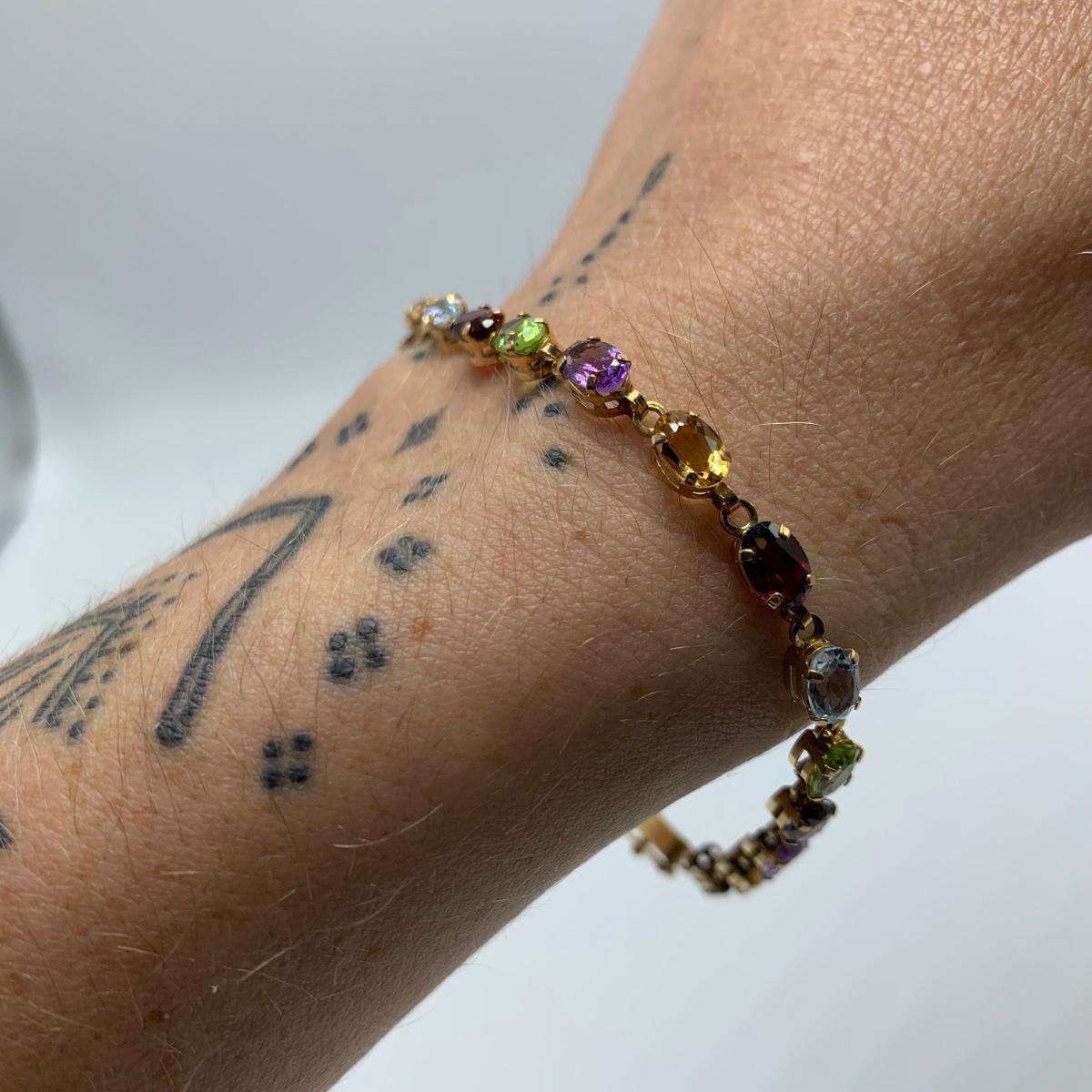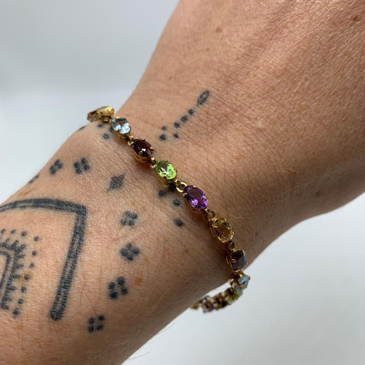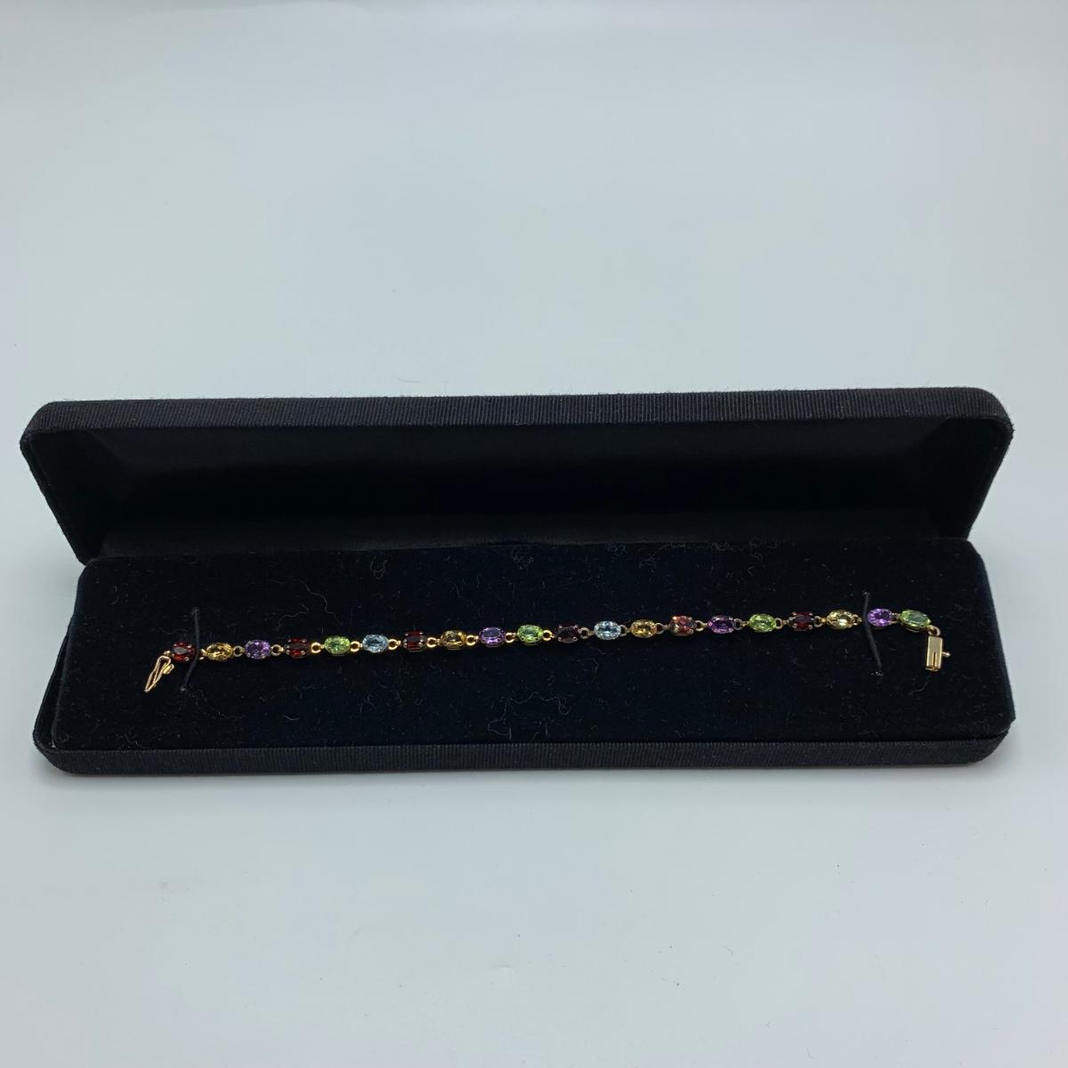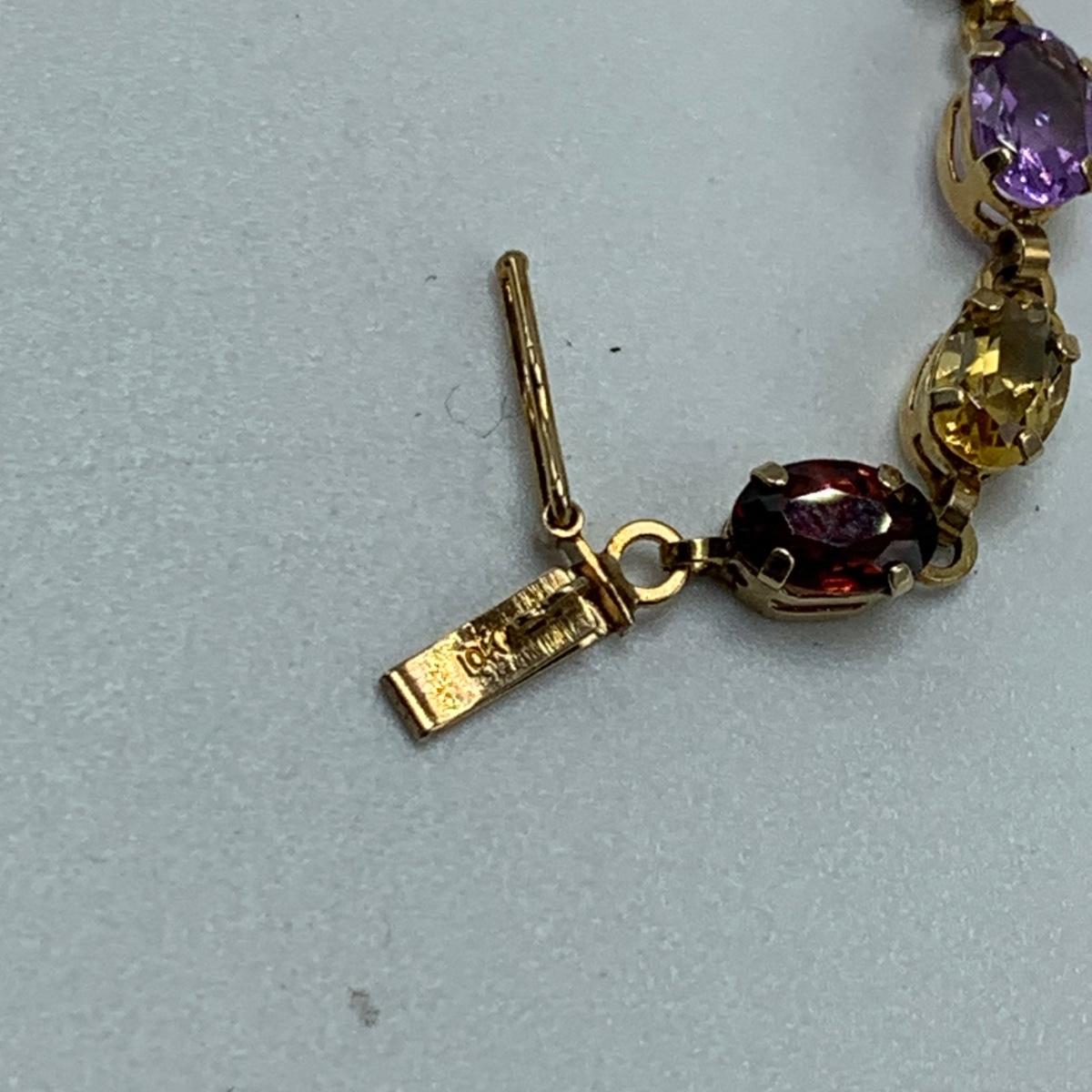 A bracelet with multi-colored gemstones. Bracelet is stamped “˜10K’. Bracelet is 7.5”Comes with a case.