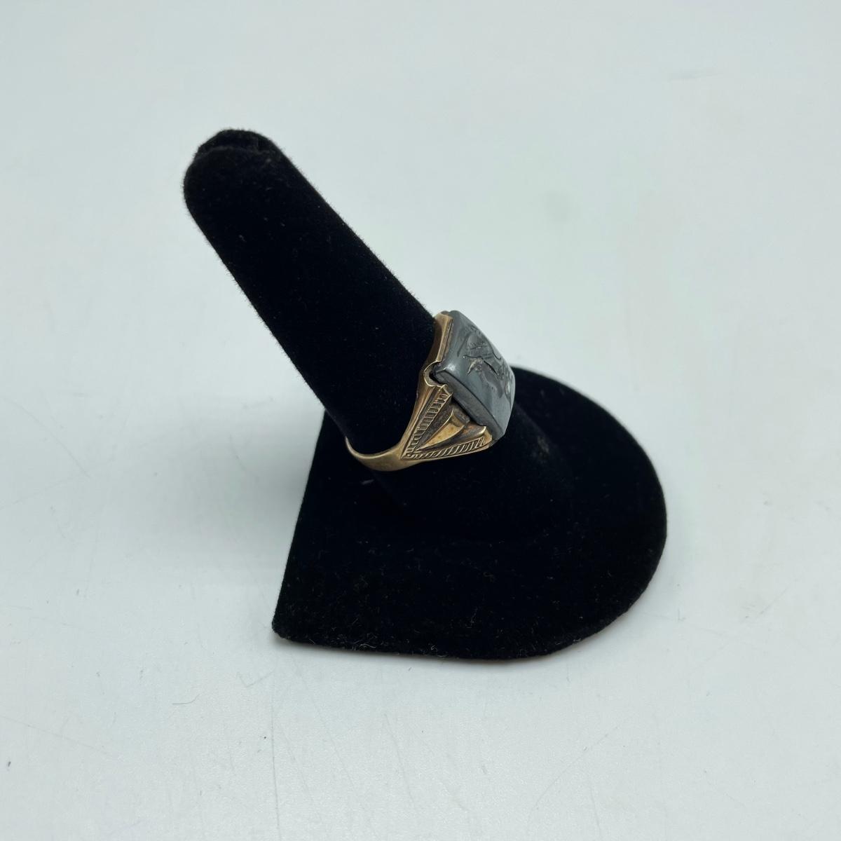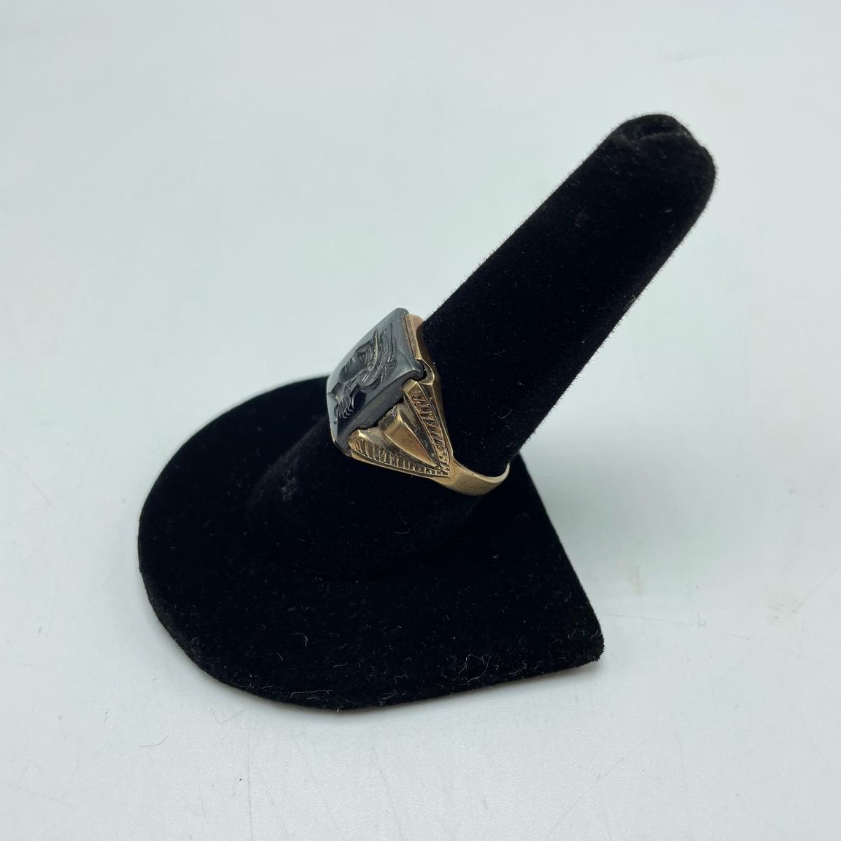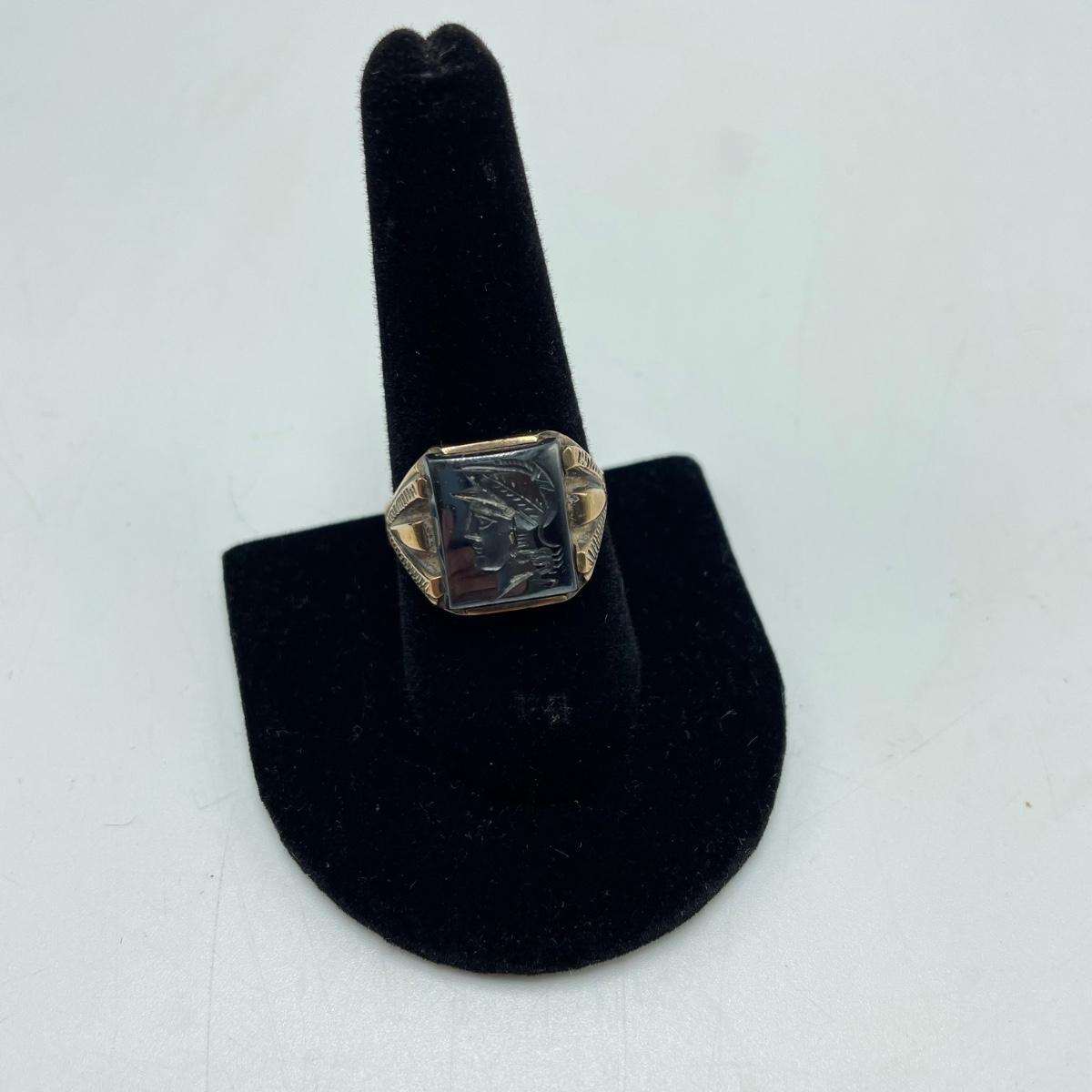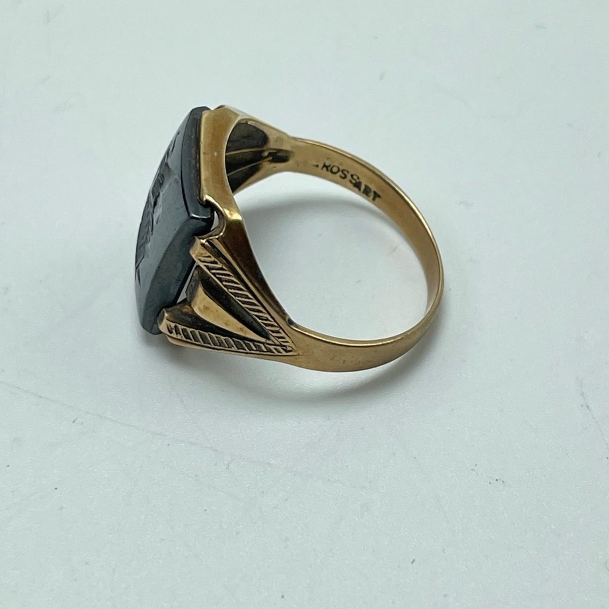 Ring marked Moss Art and 10K has a lightweight carved centerpiece that appears to be hematite. See images. Shipping available.