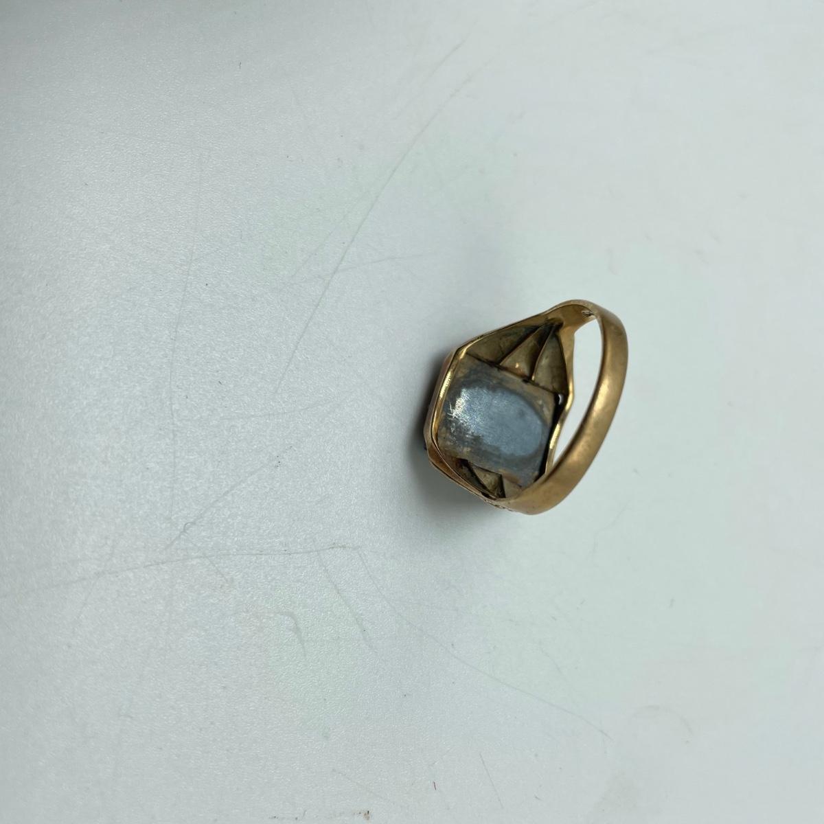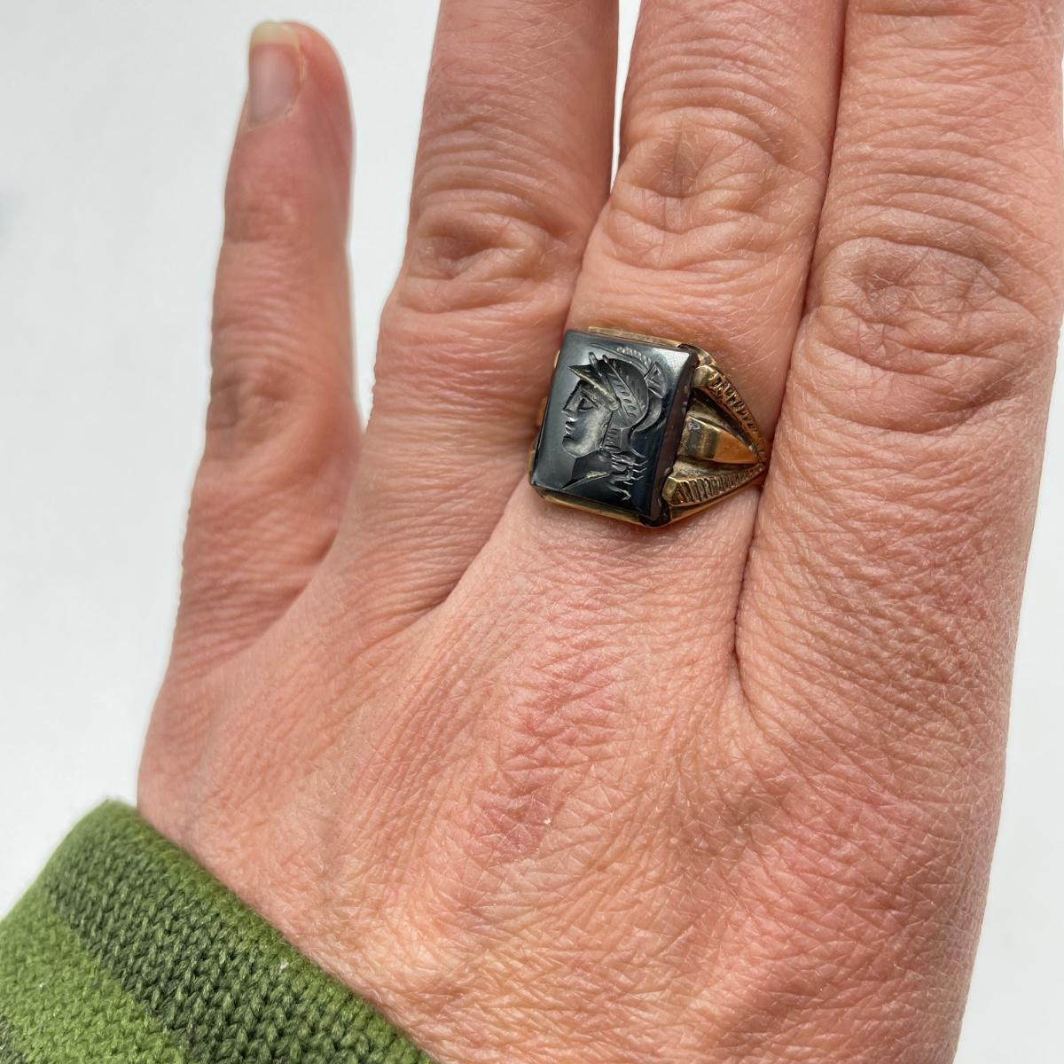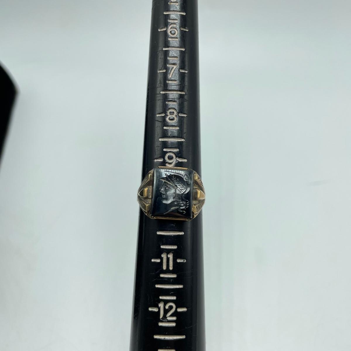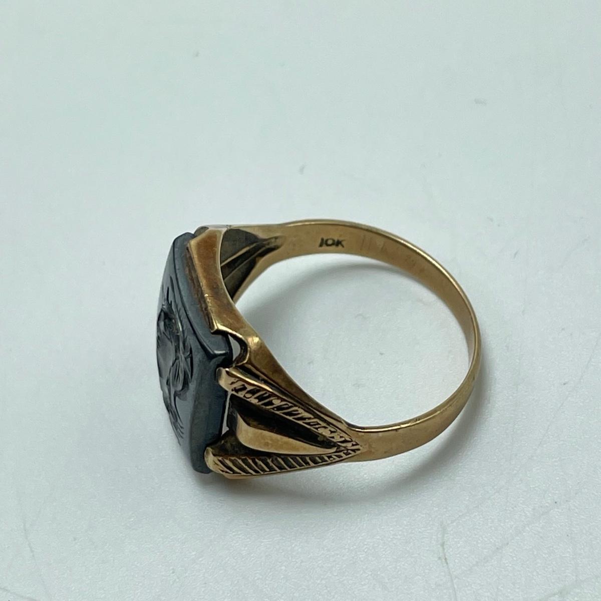 Ring marked Moss Art and 10K has a lightweight carved centerpiece that appears to be hematite. See images. Shipping available.