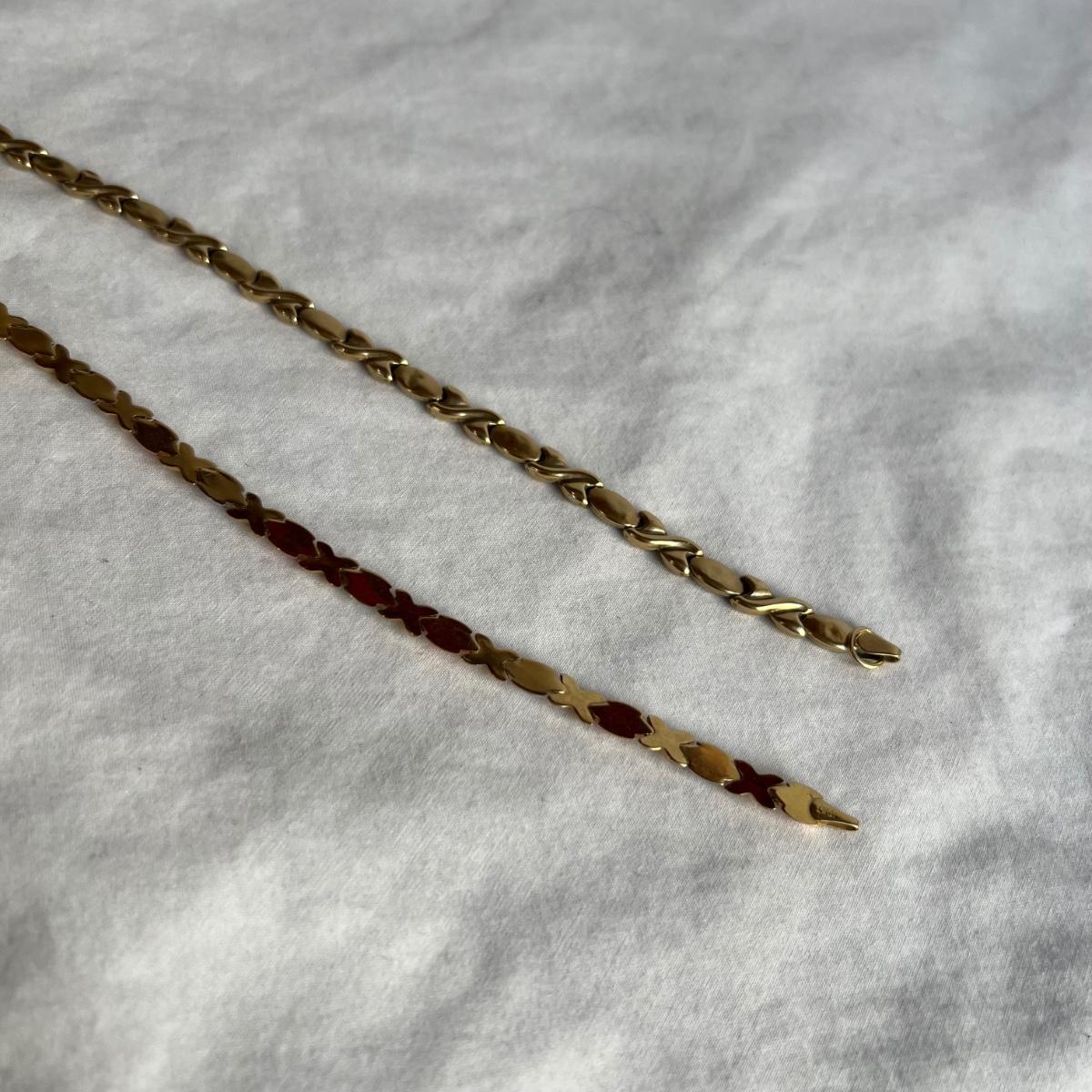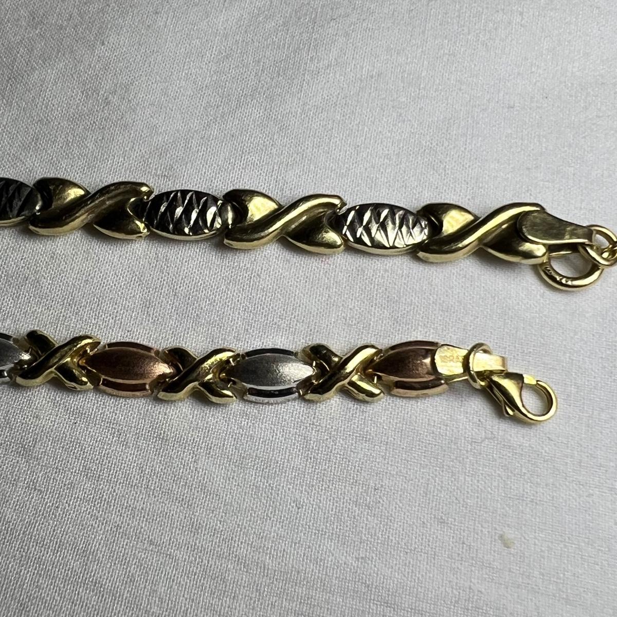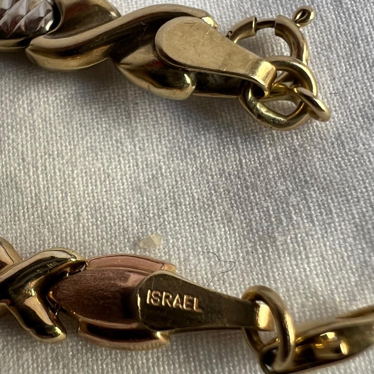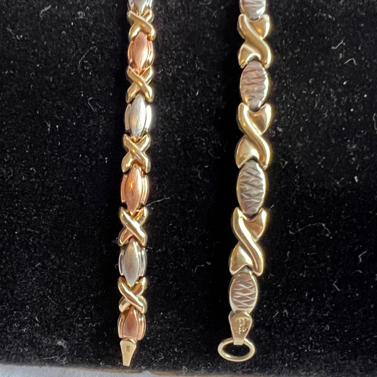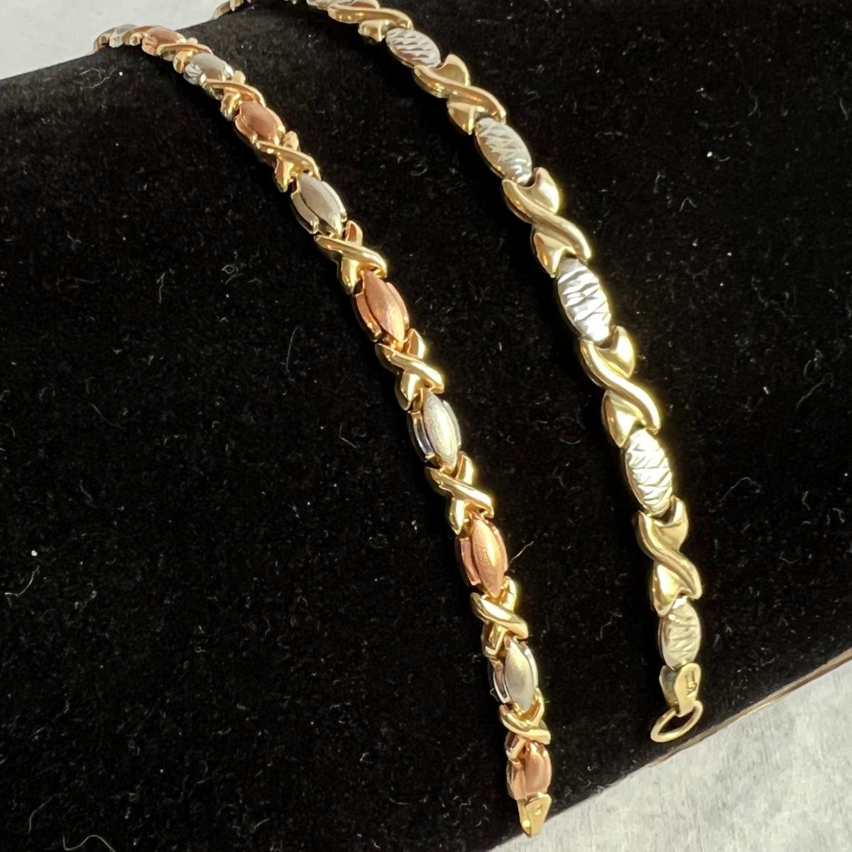 Two bracelets marked 10K. One is tri-colored, the other is all gold on the front, see images. They both measure 7” in total length. All sales are final. No returns or refunds. Please bid accordingly. Starting bid is at or near melt value.