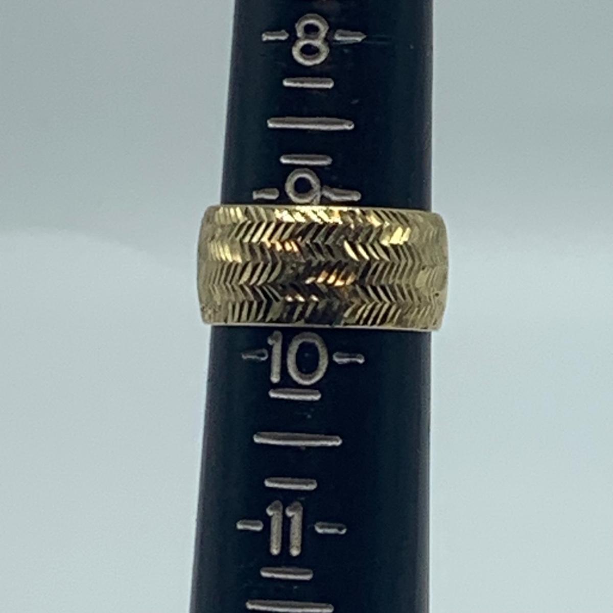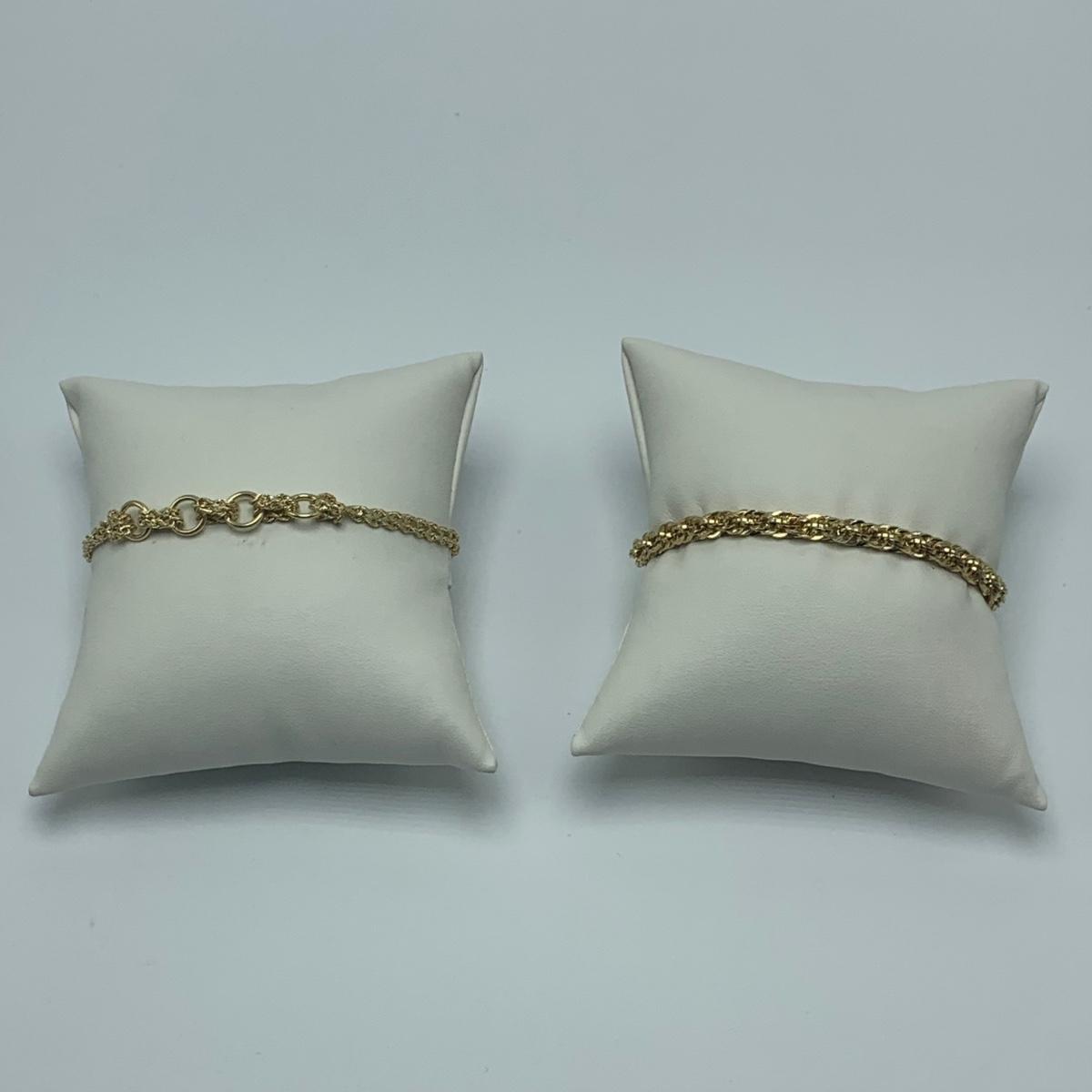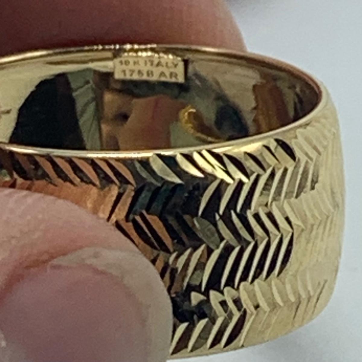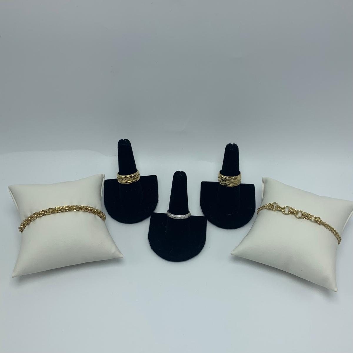 The band rings and two bracelets, all stamped “˜10K’. One ring is white gold and the other items are yellow gold. Both bracelets are 7.5”. Please see photos for all markings found.