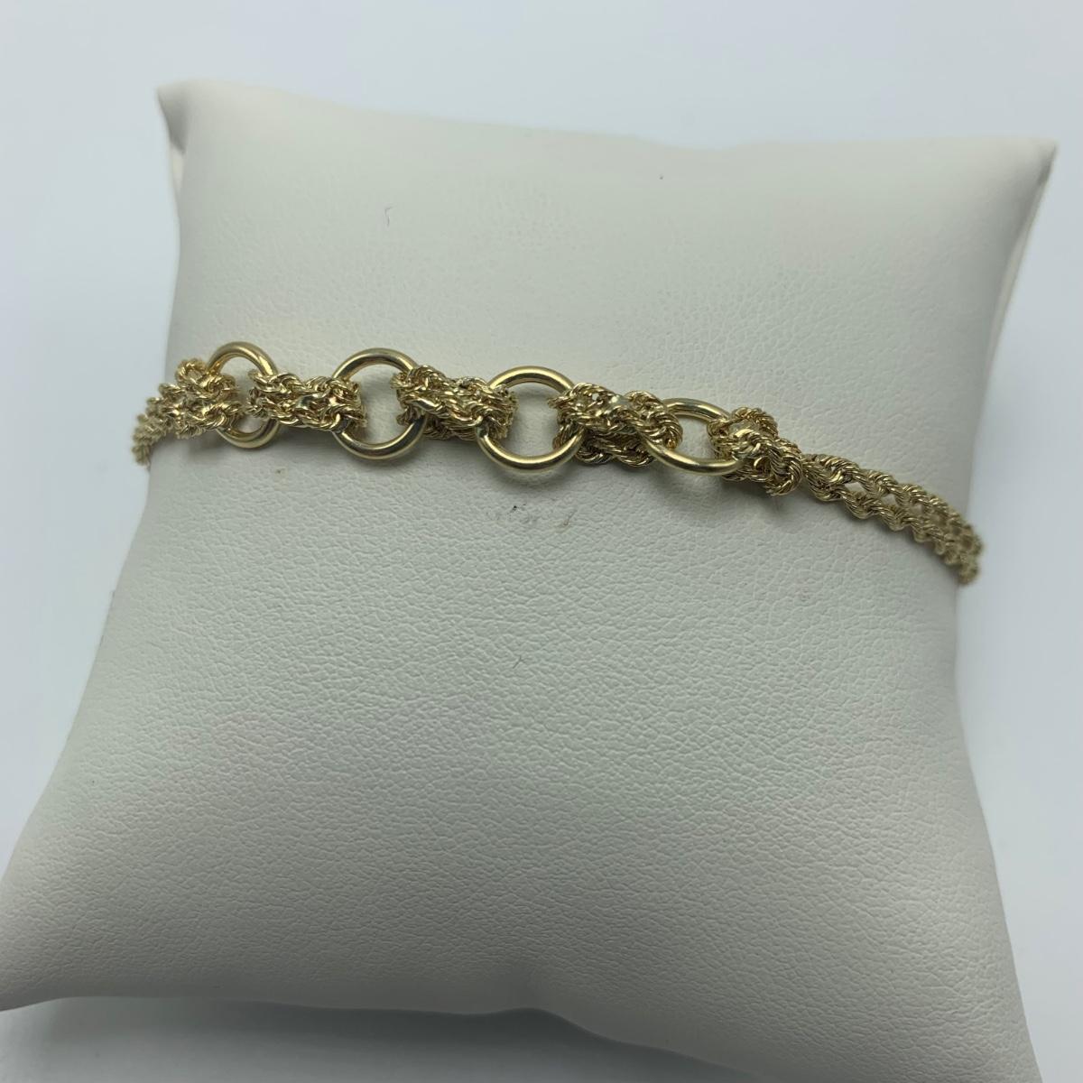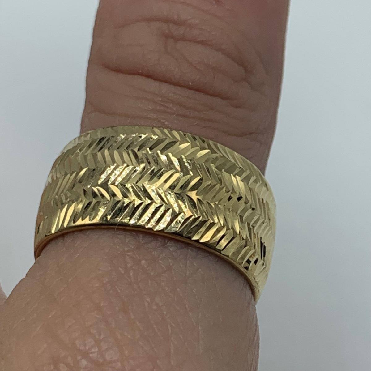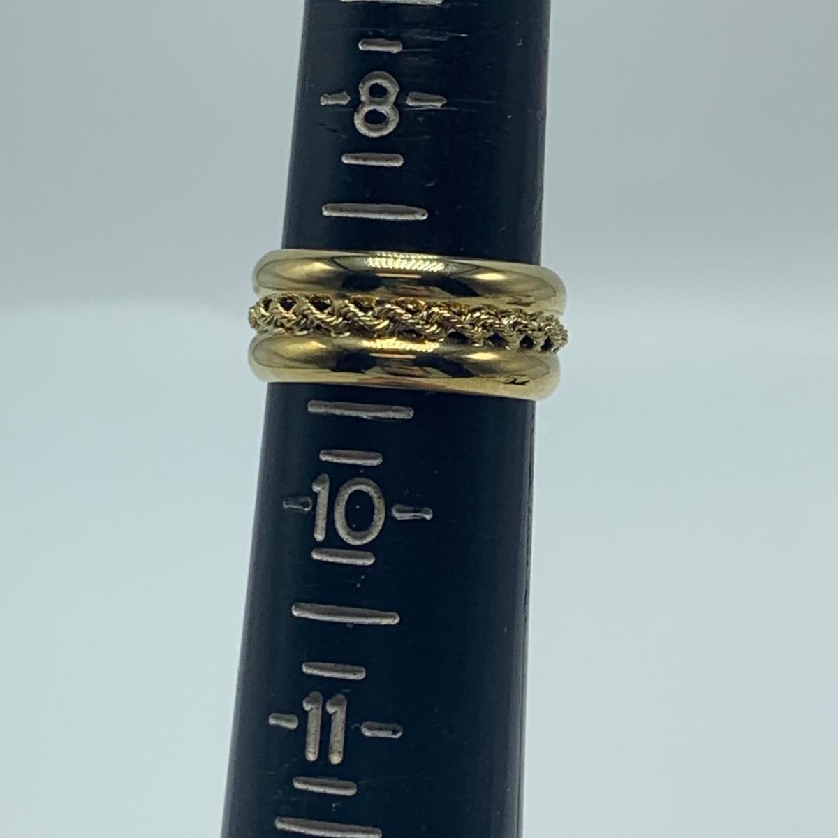 The band rings and two bracelets, all stamped “˜10K’. One ring is white gold and the other items are yellow gold. Both bracelets are 7.5”. Please see photos for all markings found.