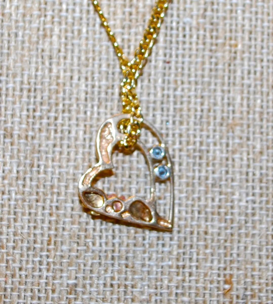10k Gold Filled Blue Topaz Stones & Rose Gold Flower Heart PENDANT (¾" x ¾") on Gold Tone Chain 18" L