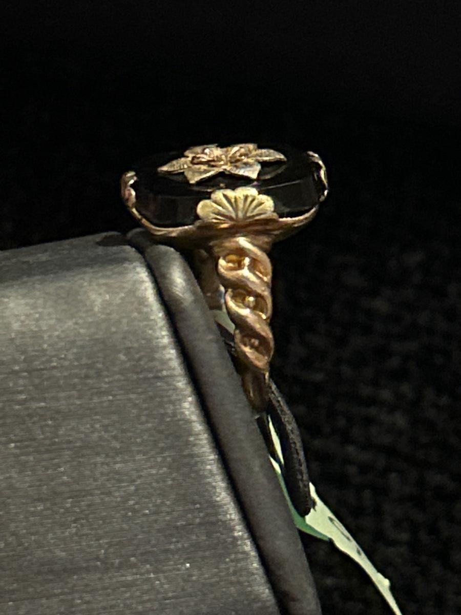 If I had to guess I would say it’s black onyx, but it is a little loose in the mounting.