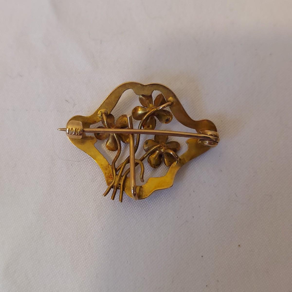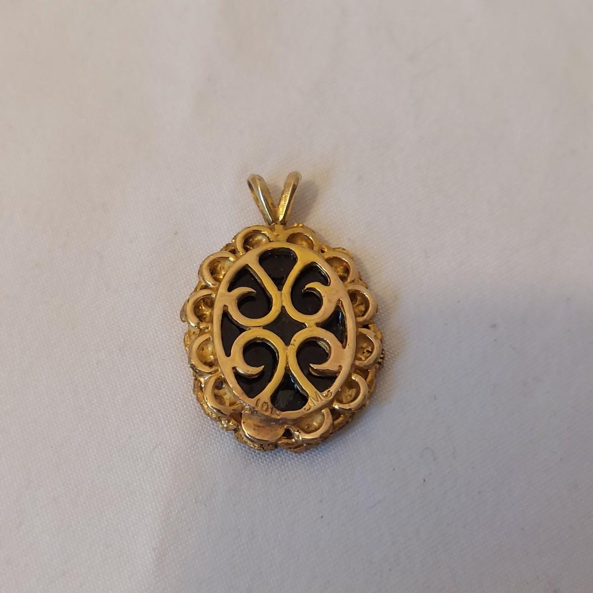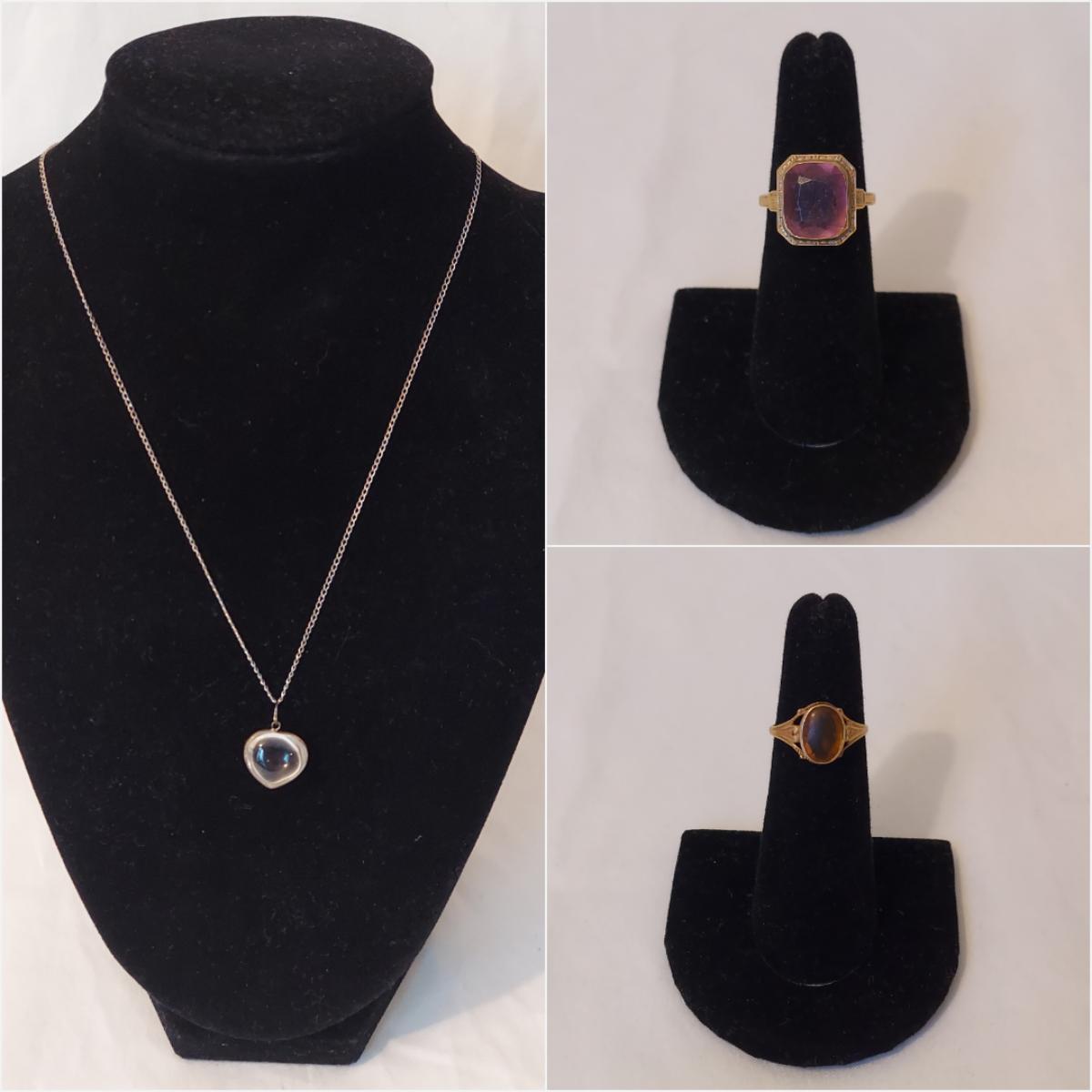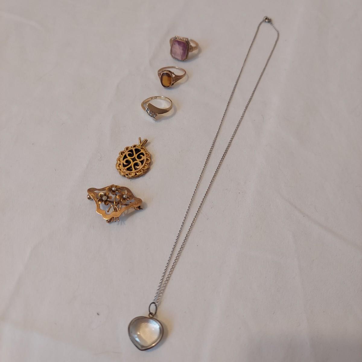 Lot includes three rings, a brooch, a necklace that measures 17.5”L and a pendant that are stamped 10K. No stones were tested. Please see photos for details. All sales are final. No returns or refunds. Please bid accordingly. Shipping available