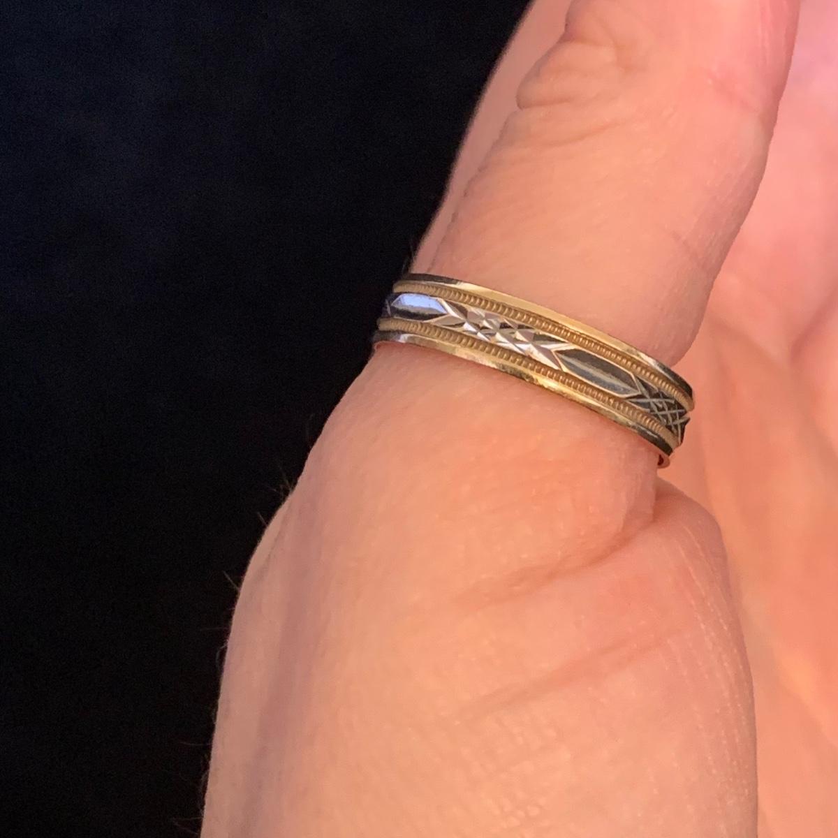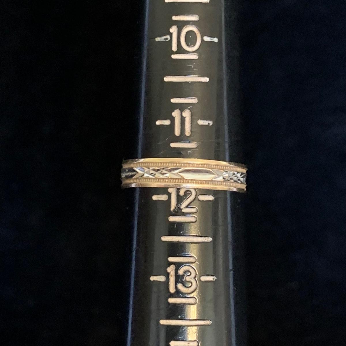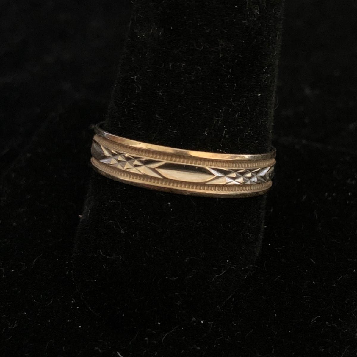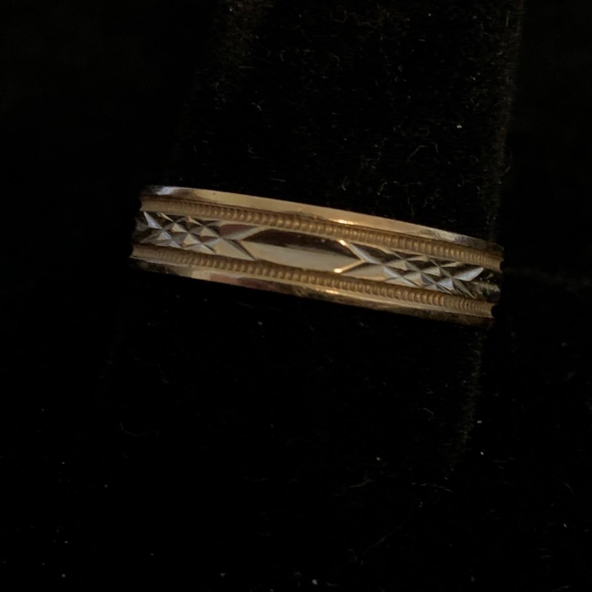 Two toned gold band with diamond shaped pattern is marked “˜10K’. Please see photos for all markings and size details.