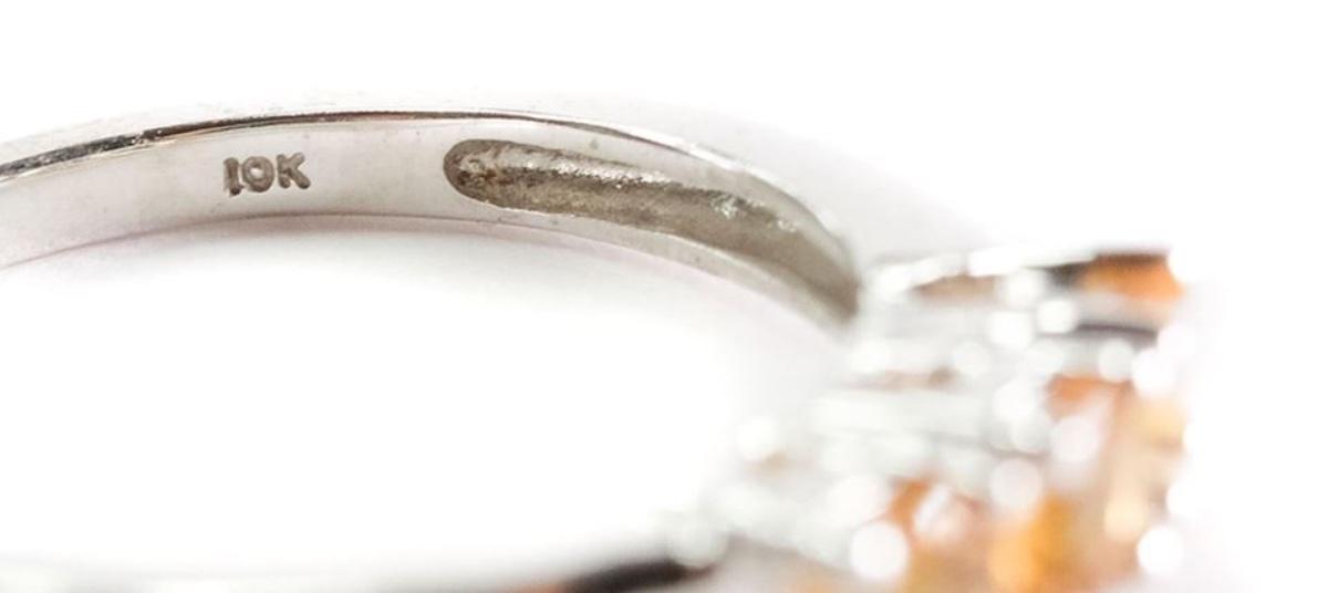 10k white gold diamond having three round brilliant cut citrine amethyst gemstones. Size 7. Stamped 10k. Approx. overall weight 2.8 grams.