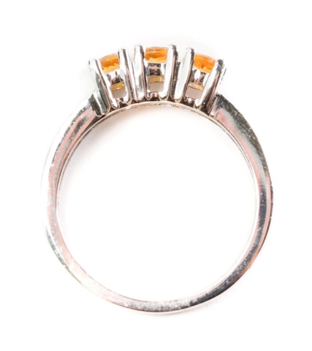 10k white gold diamond having three round brilliant cut citrine amethyst gemstones. Size 7. Stamped 10k. Approx. overall weight 2.8 grams.