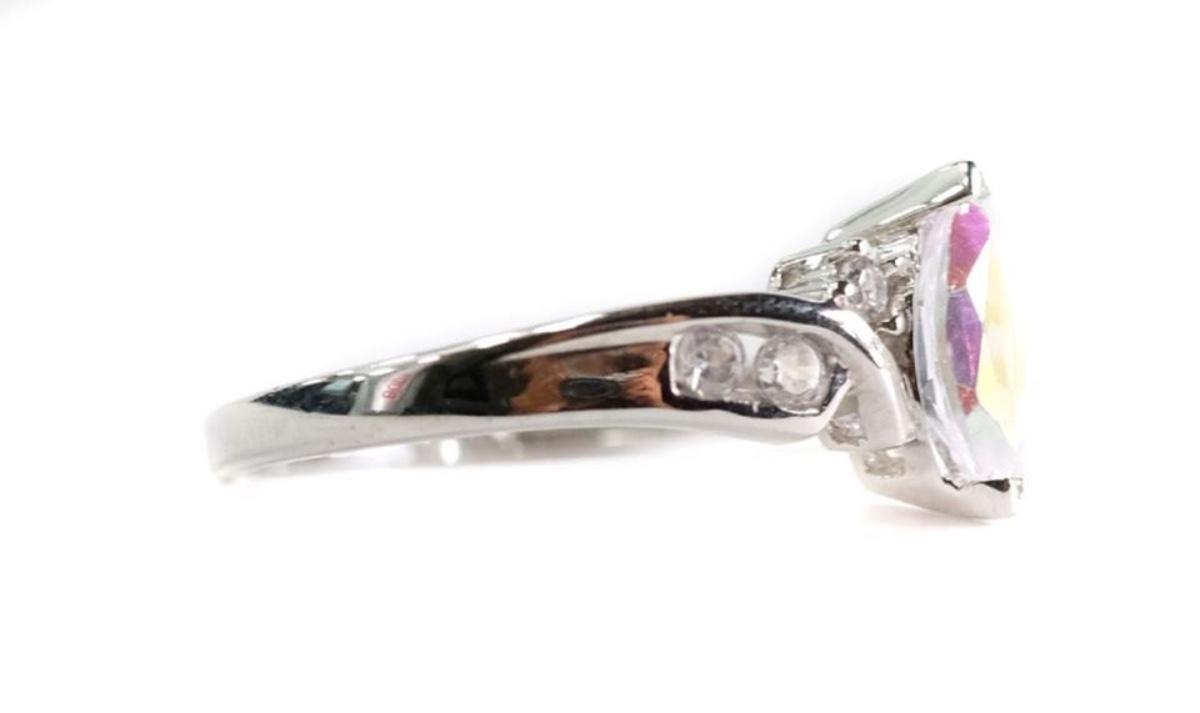10k white gold ring having faceted Mercury Mystic Topaz gemstone flanked to each side by three cubic zirconia gemstones. Ring size 7. Approx. overall weight 1.89 grams.