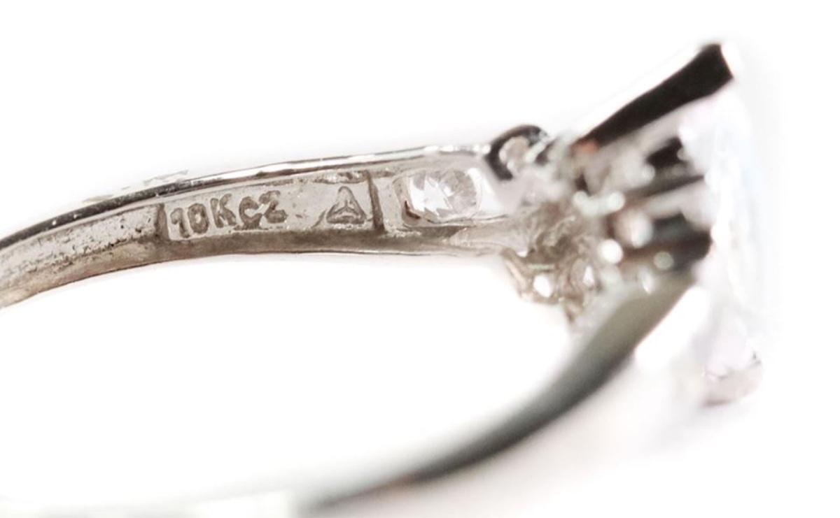 10k white gold ring having faceted Mercury Mystic Topaz gemstone flanked to each side by three cubic zirconia gemstones. Ring size 7. Approx. overall weight 1.89 grams.