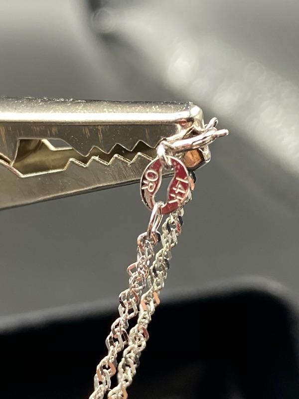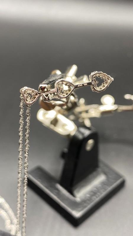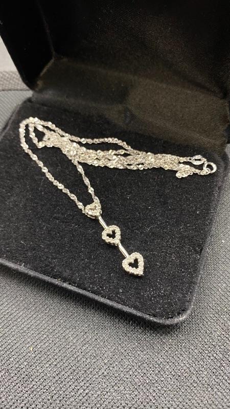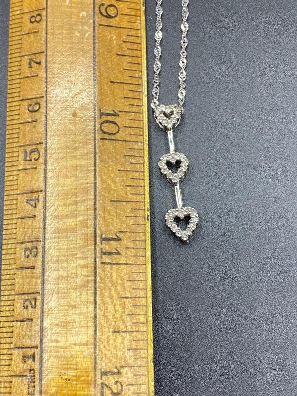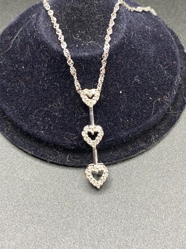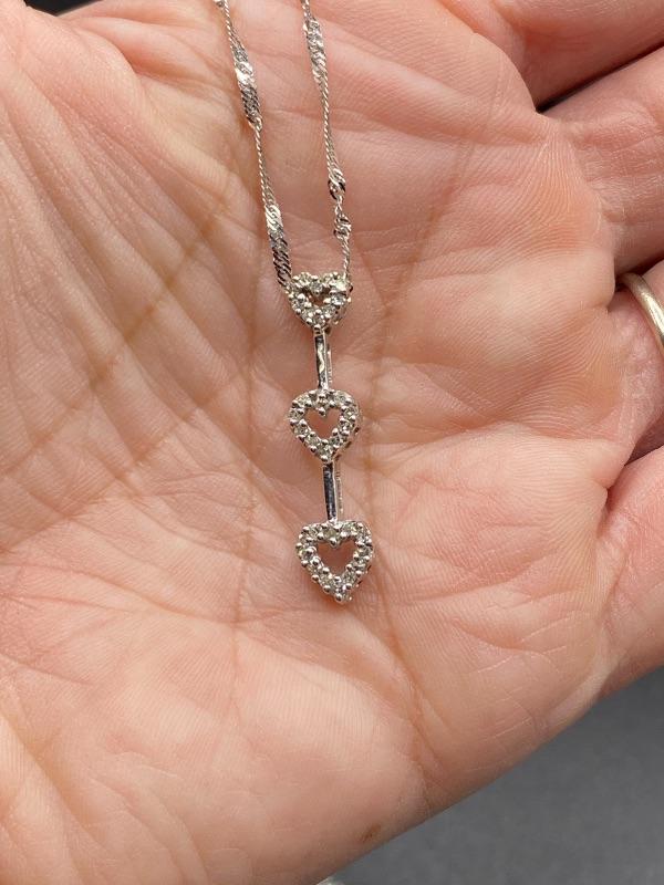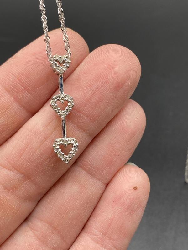 10k & diamond triple heart journey pendant necklace. Twisted link 14k white gold chain with a 10k pendant. Pendant is just over 1" and with the chain at almost 11". Comes in a gift box. Marked on the back of pendant and near the clasp.