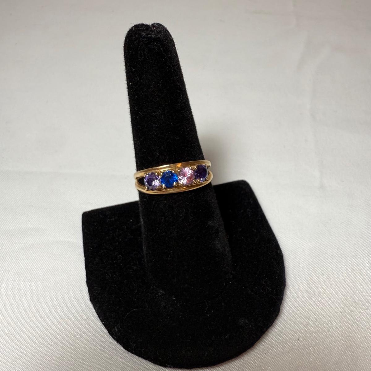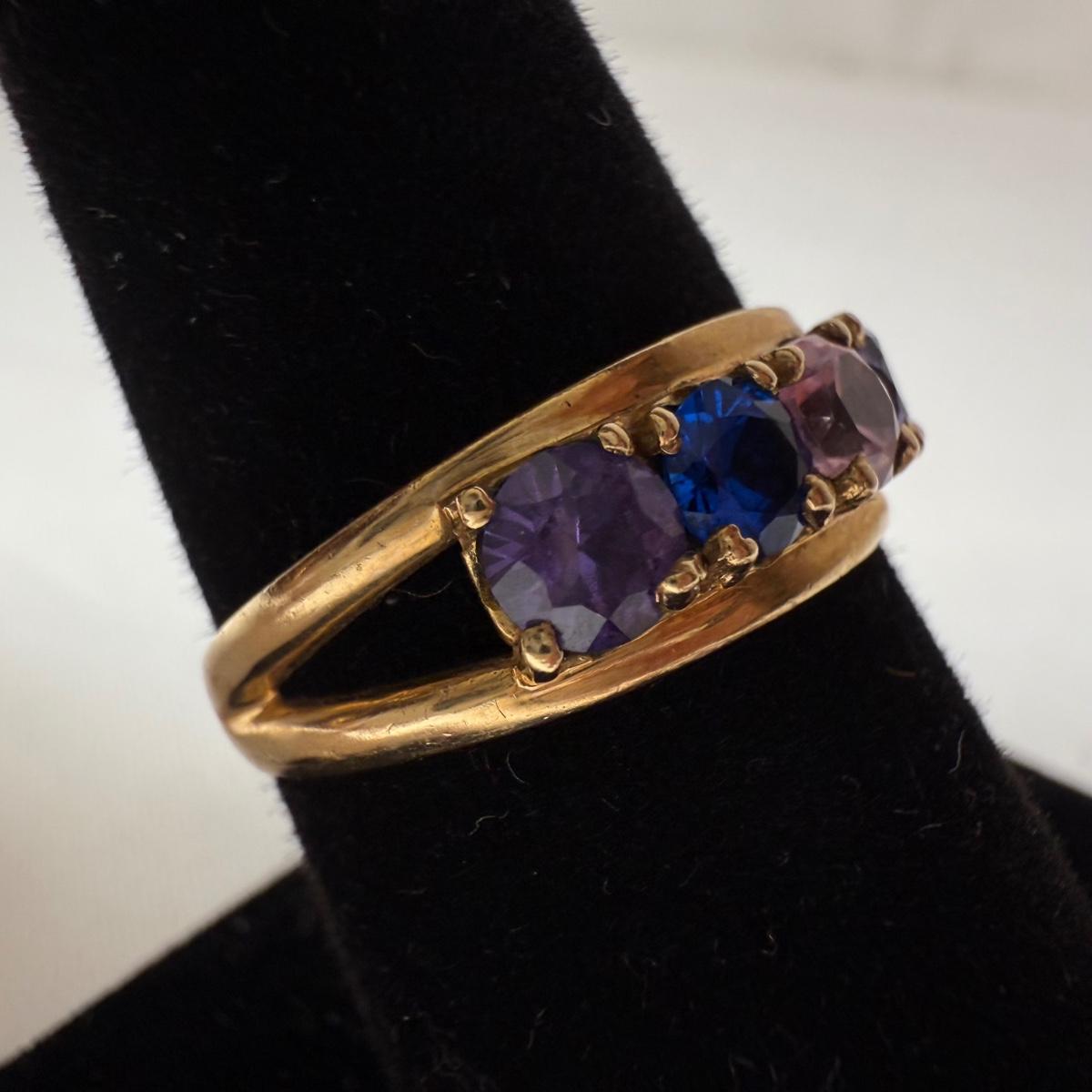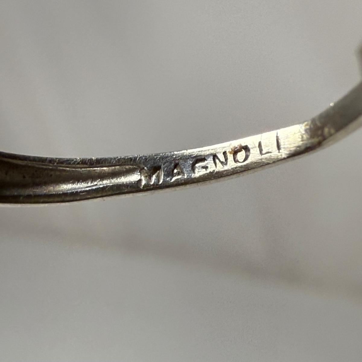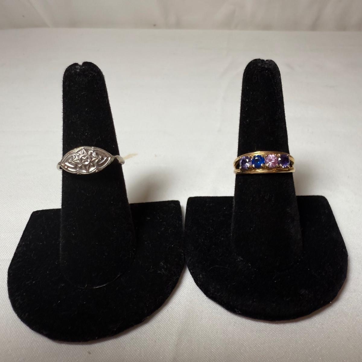 Two distinct 10K rings. One is white gold. It has an embossed design. The band is spilt. It is stamped ‘Magnoli 10K’. It is approximately a size 8. The other is yellow gold with four gemstones. It is stamped ‘10K’ and has another mark, see photos. This one also is approximately size 7-8.