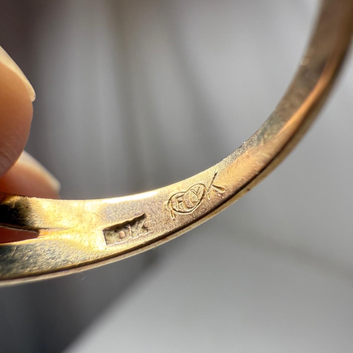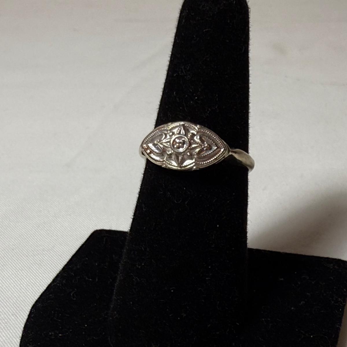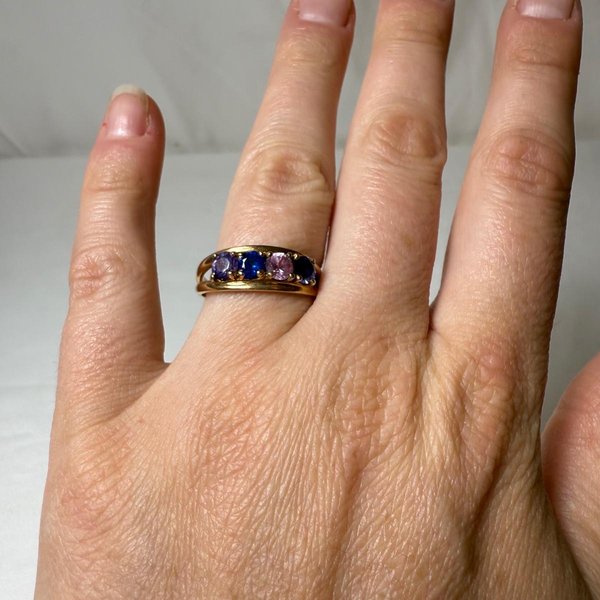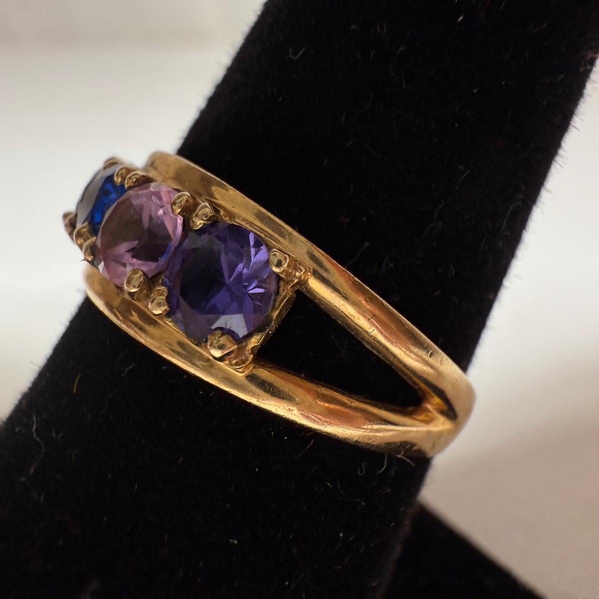 Two distinct 10K rings. One is white gold. It has an embossed design. The band is spilt. It is stamped ‘Magnoli 10K’. It is approximately a size 8. The other is yellow gold with four gemstones. It is stamped ‘10K’ and has another mark, see photos. This one also is approximately size 7-8.
