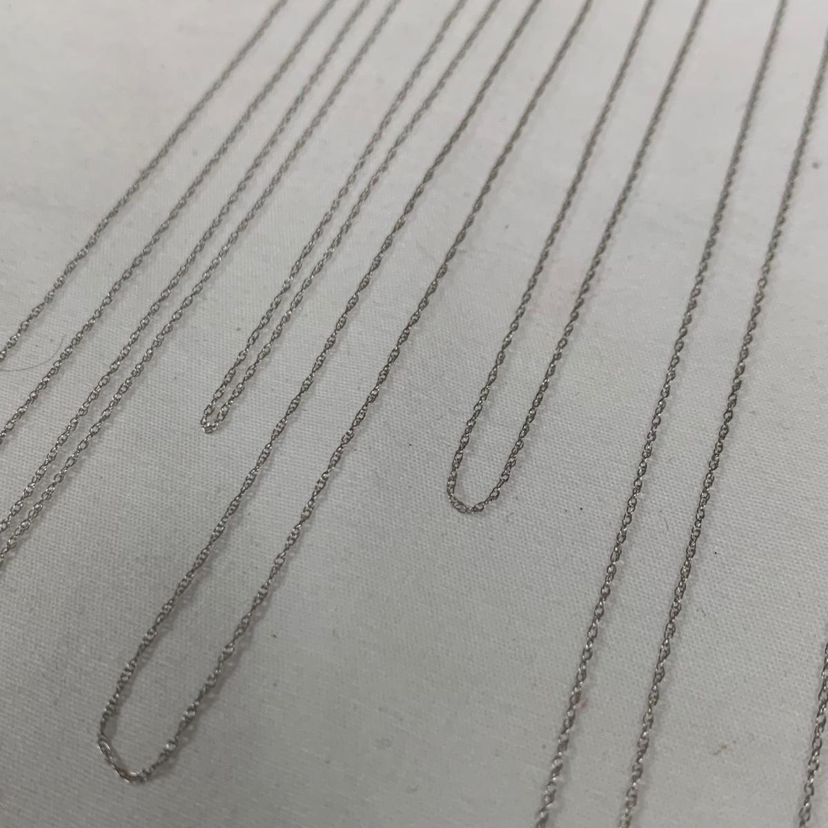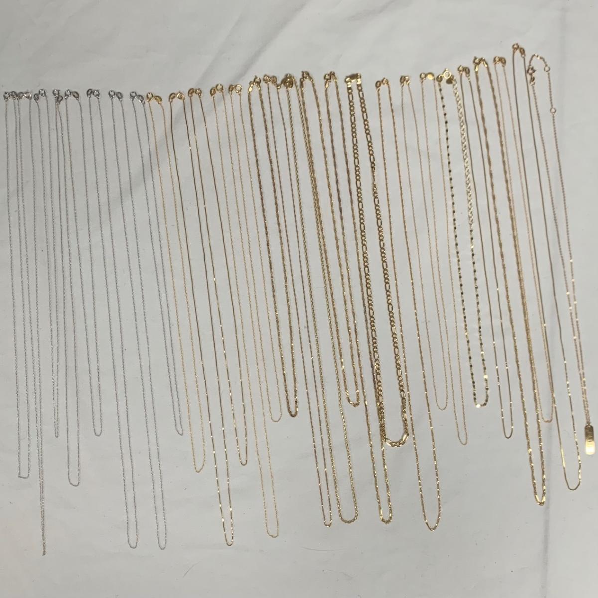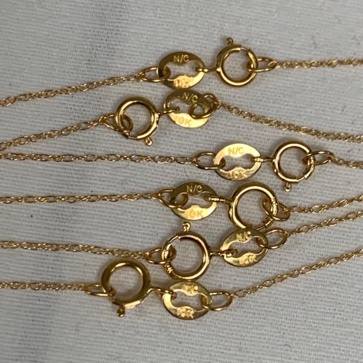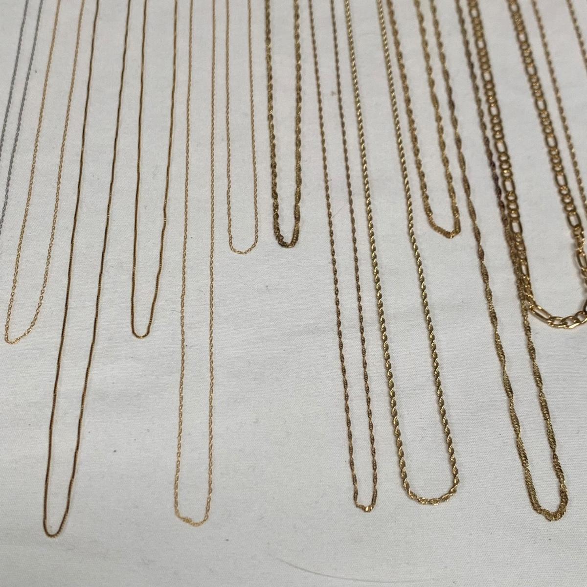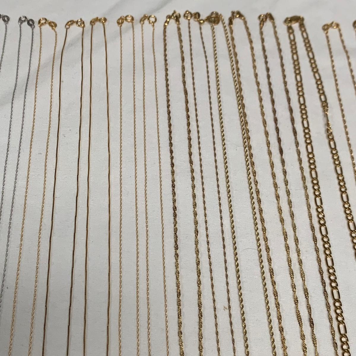 A collection of white and yellow gold chains, all marked “˜10K’, some have other markings as well. There are eight white gold chains and 20 yellow gold chains. The chains are a variety of styles, see photos. One chain has a “˜Faith’ pendant that does not have any mark. The necklaces vary in length from 18” to 24”. Starting bid is at or near melt value. All sales are final. No returns or refunds. Please bid accordingly.