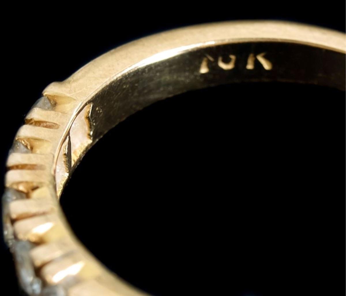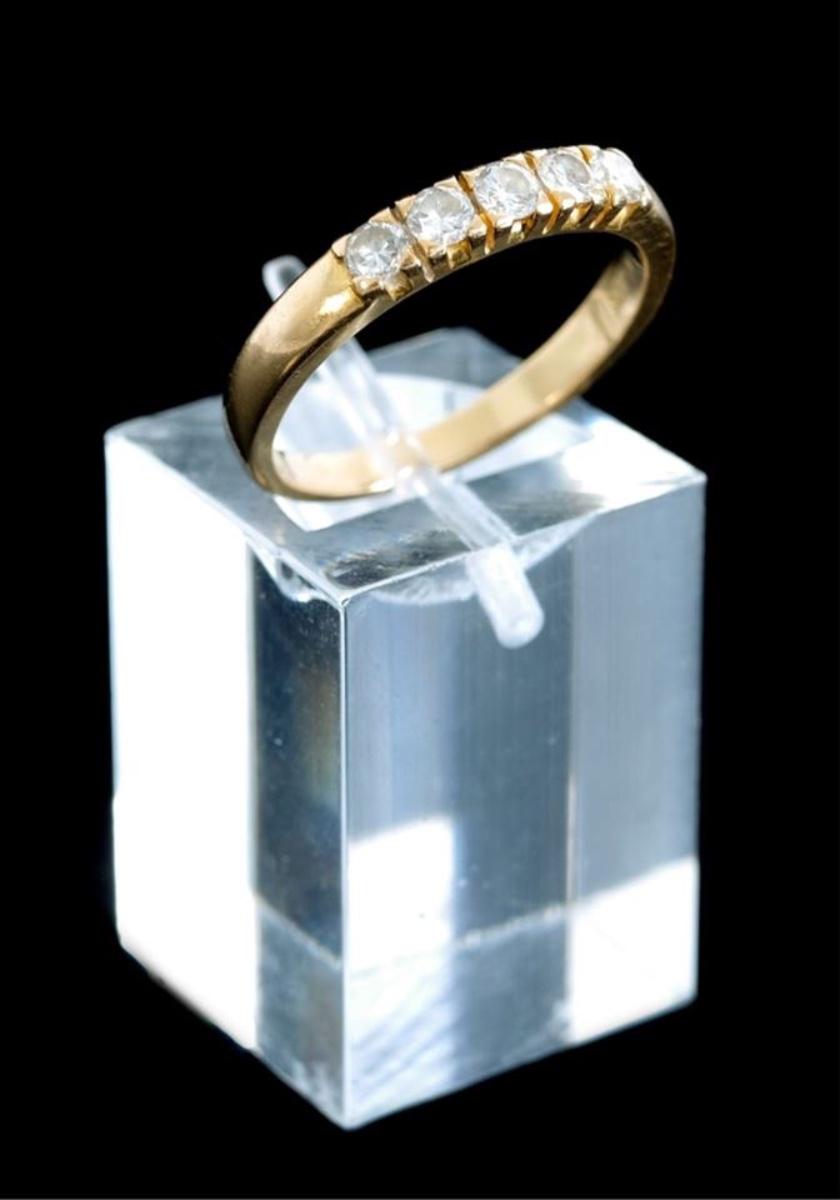 10k yellow gold ring with five round brilliant cut diamonds (0.31ctw, Color: j-k, Clarity: VS1). Ring size 5.5. Stamped 10K. Approx. weight 2.9 grams.