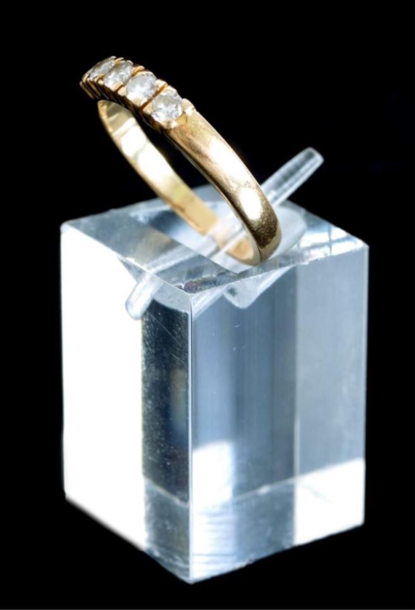 10k yellow gold ring with five round brilliant cut diamonds (0.31ctw, Color: j-k, Clarity: VS1). Ring size 5.5. Stamped 10K. Approx. weight 2.9 grams.