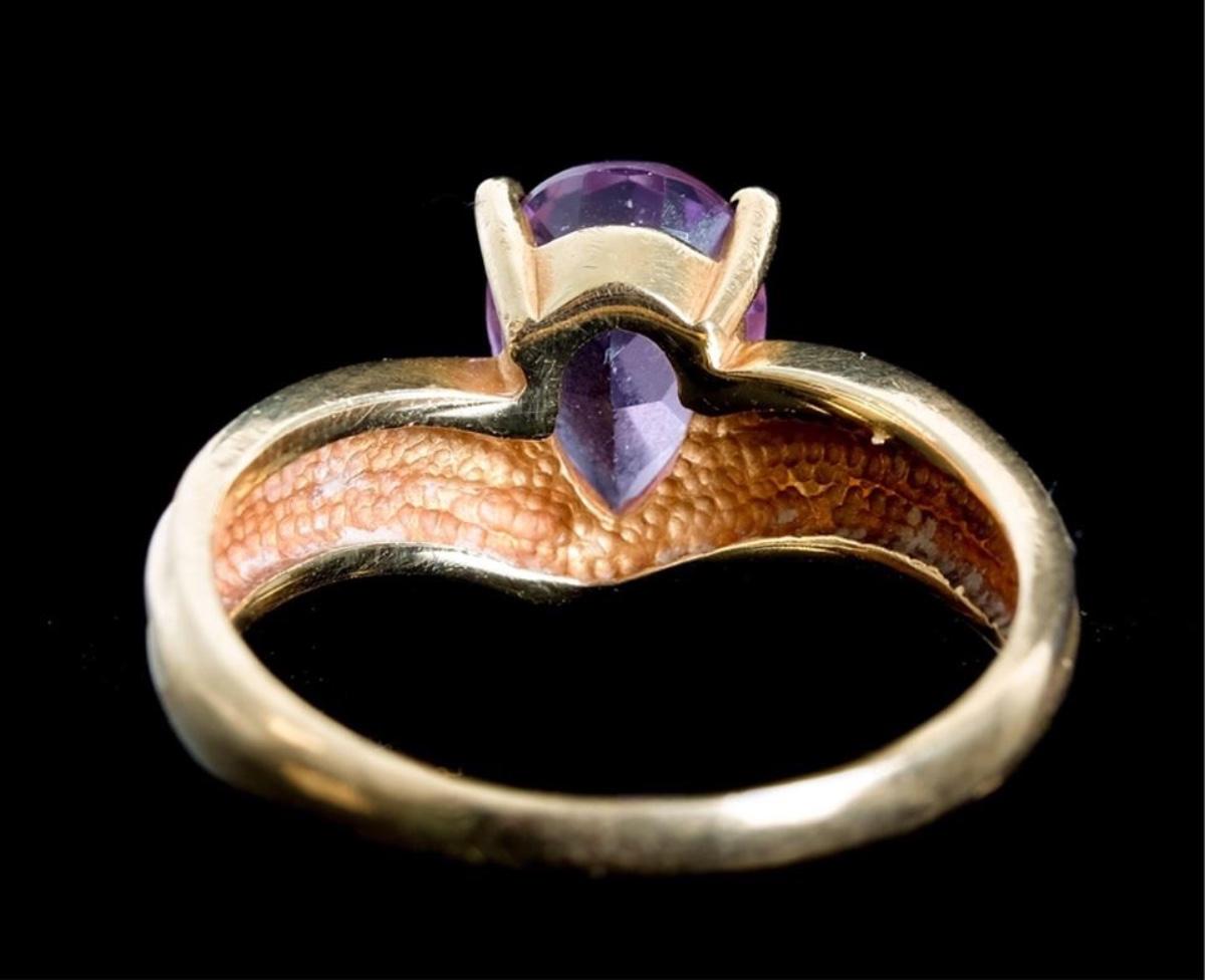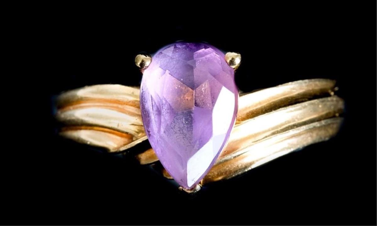 10k yellow gold ring having tear drop shaped amethyst gemstone. Ring size 5 1/2. Stamped 10k. Approx. overall weight 2.37 grams.
