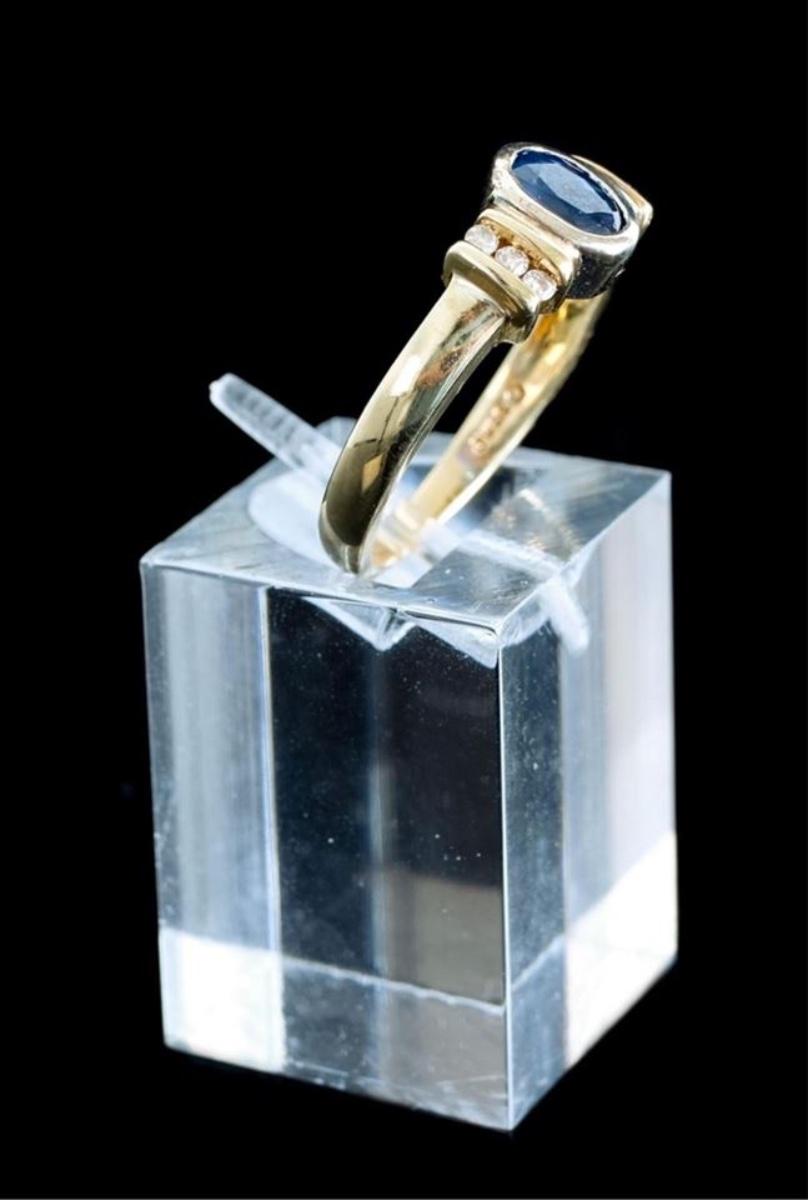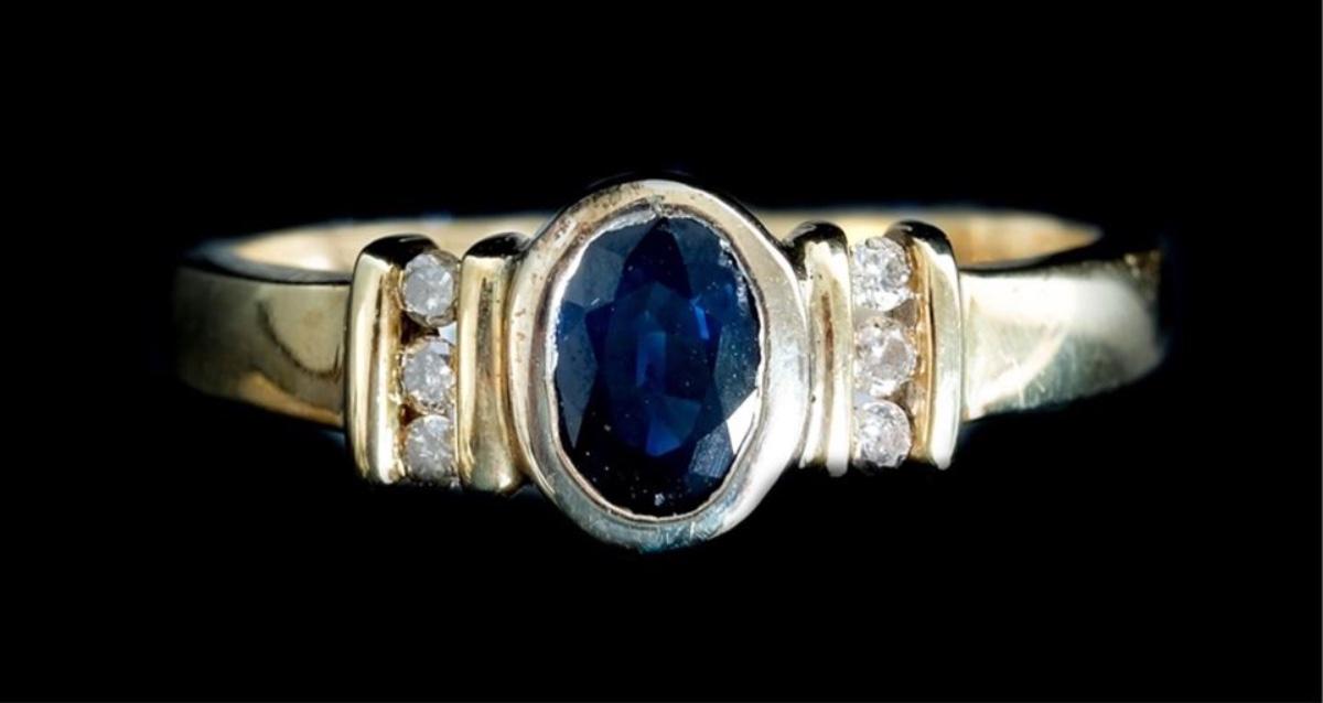 Kay Jewelers 10k yellow gold ring with oval dark blue topaz flanked by round brilliant diamonds. Ring size 7. Stamped 10k JWBR (Kay Jewelers). Approx. overall weight 2.78 grams.