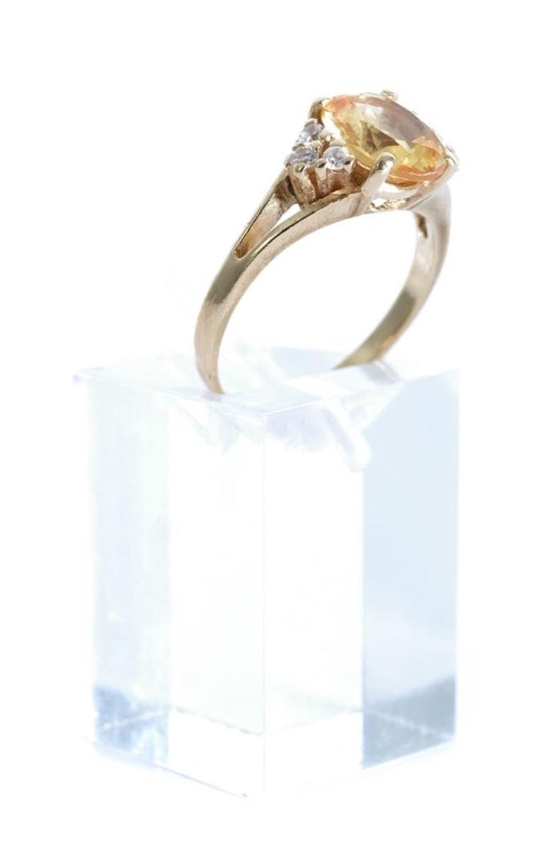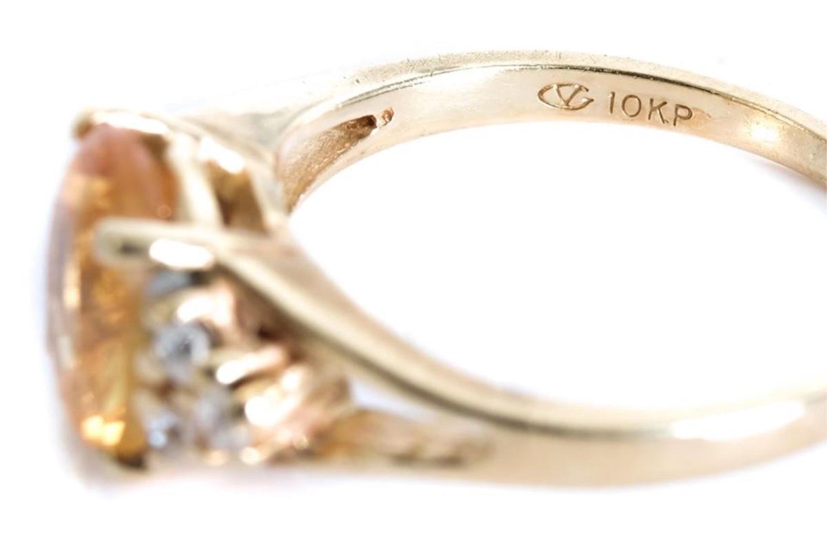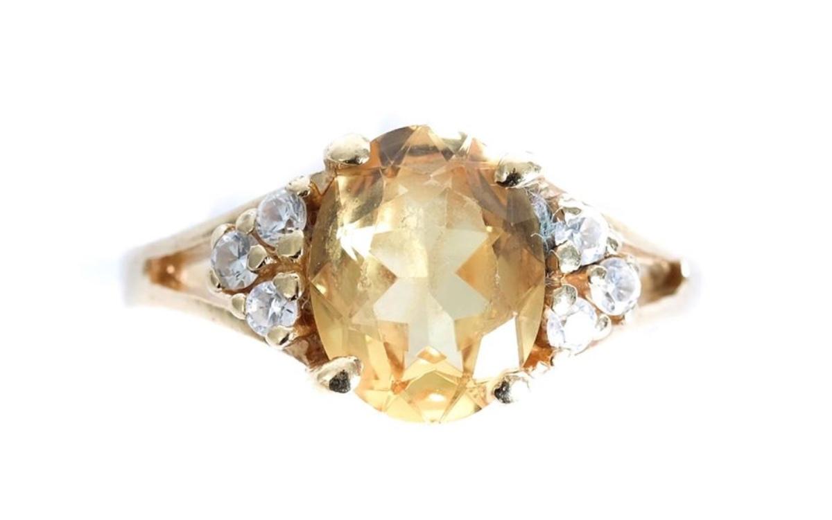 10K yellow gold ring having oval faceted citrine gemstone with round brilliant cut white gemstones. Ring size 6. Stamped 10K. Approx. overall weight 2.98 grams.