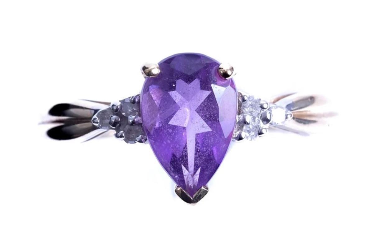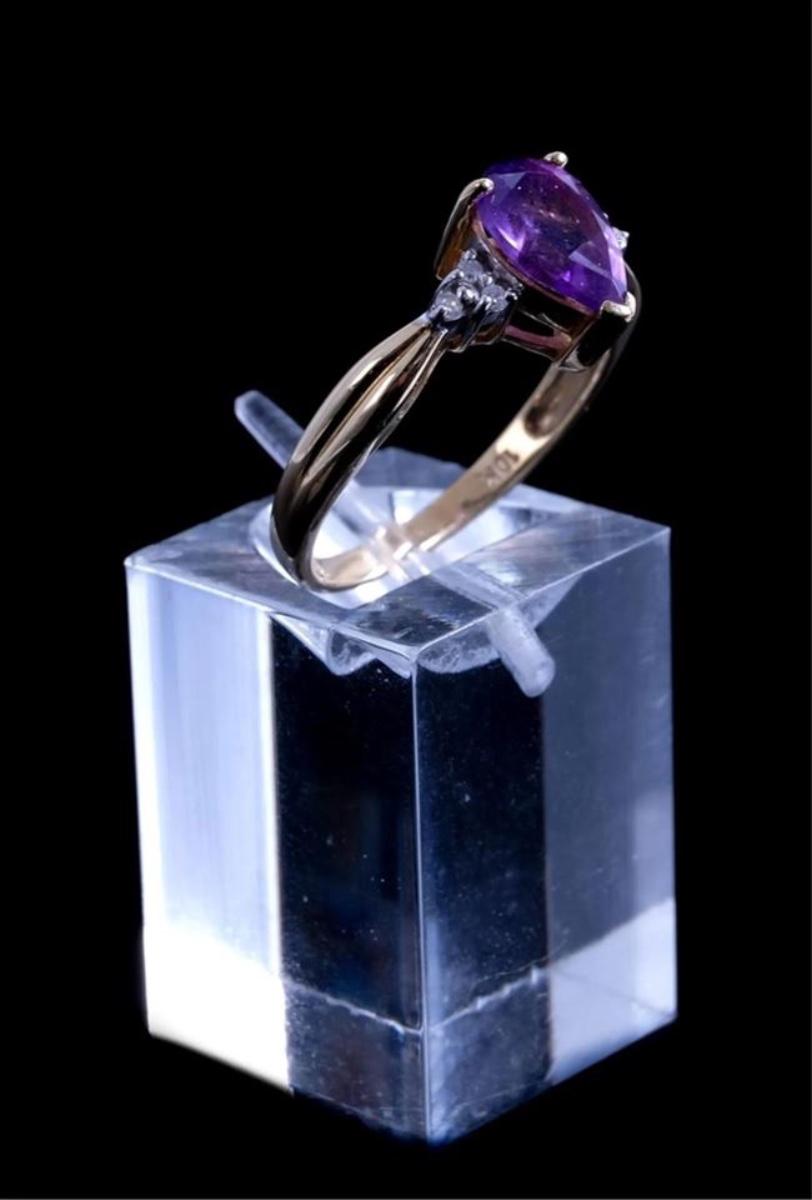 10k yellow gold ring having a faceted center teardrop shaped amethyst flanked to each side by three round brilliant cut diamonds. Ring size 7. Stamped 10k. Approx. overall weight 2.36 grams.