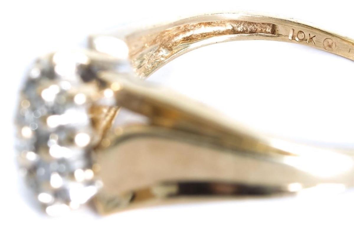 10K yellow gold and diamond cluster ring. Size 7.5. Stamped 10K. Approx. overall weight 2.78 grams.