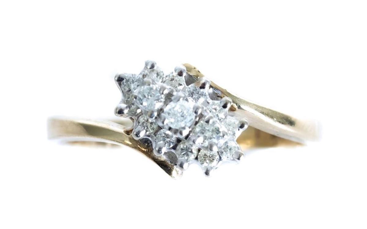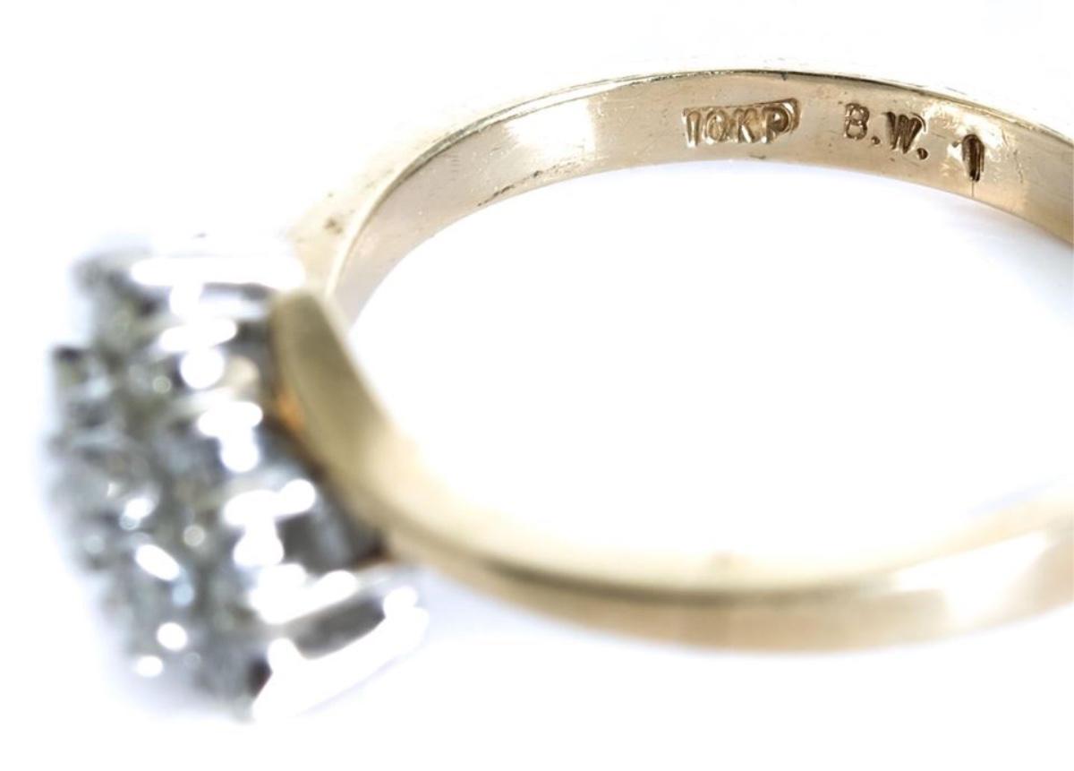 10K yellow gold and diamond cluster ring having fifteen round brilliant cut diamonds. Ring size 6 1/2. Stamped 10K P B.W. Approx. overall weight 2.17 grams.