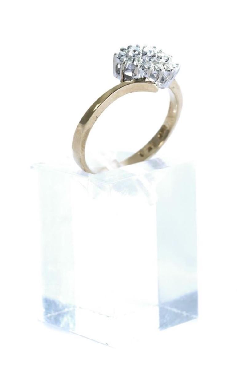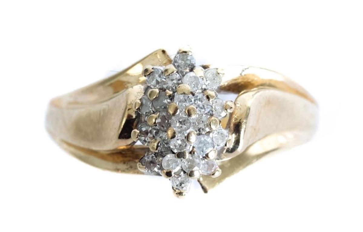 10K yellow gold and diamond cluster ring. Size 7.5. Stamped 10K. Approx. overall weight 2.78 grams.