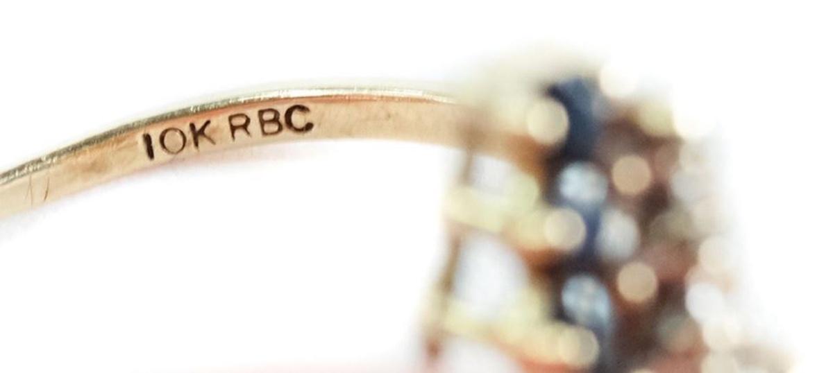 10k yellow gold 0.25ctw sapphire and 0.05ctw diamond ring, size 6.5. Stamped 10k RBC. Approx. overall weight 2.72 grams.