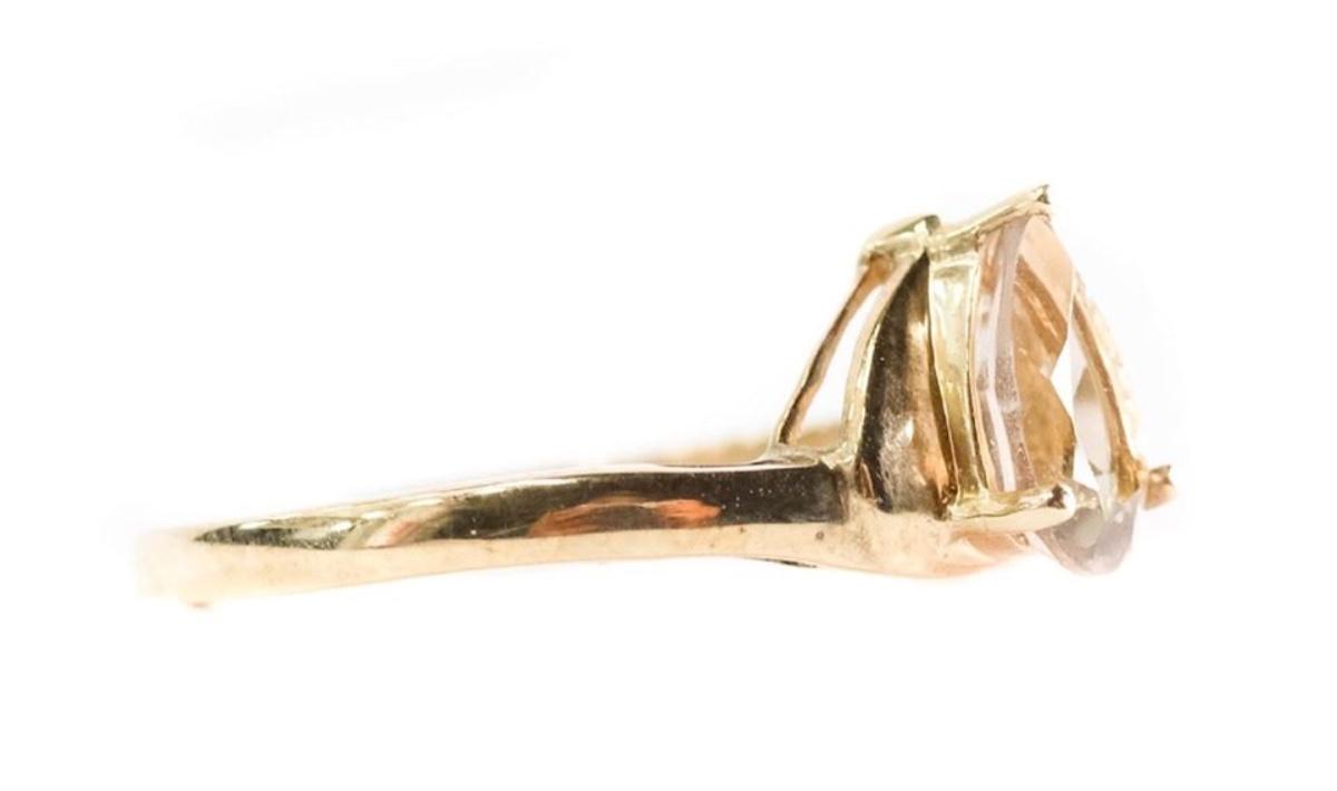 10k yellow gold ring having faceted teardrop shaped smokey quartz with three round brilliant cut diamond accents. Ring size 7. Approx. overall weight 1.7 grams.
