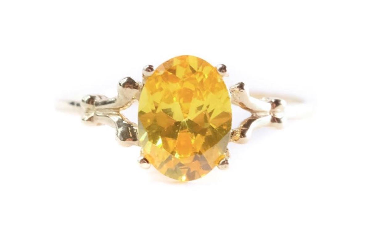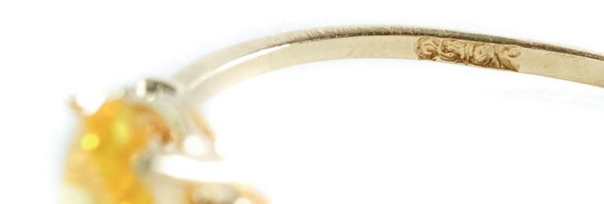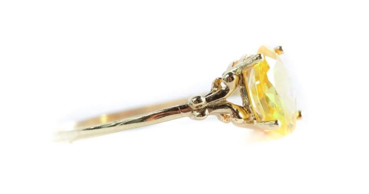 10k yellow gold ring with faceted yellow gemstone(likely Yellow Zircon), size 6 1/2. Stamped 10k. Approx. weight 1.2 grams.