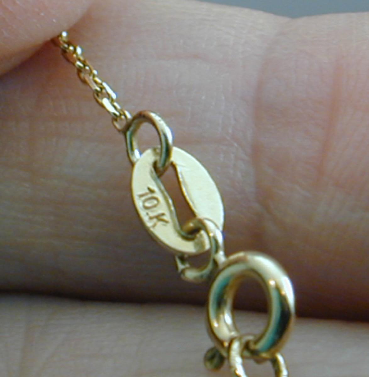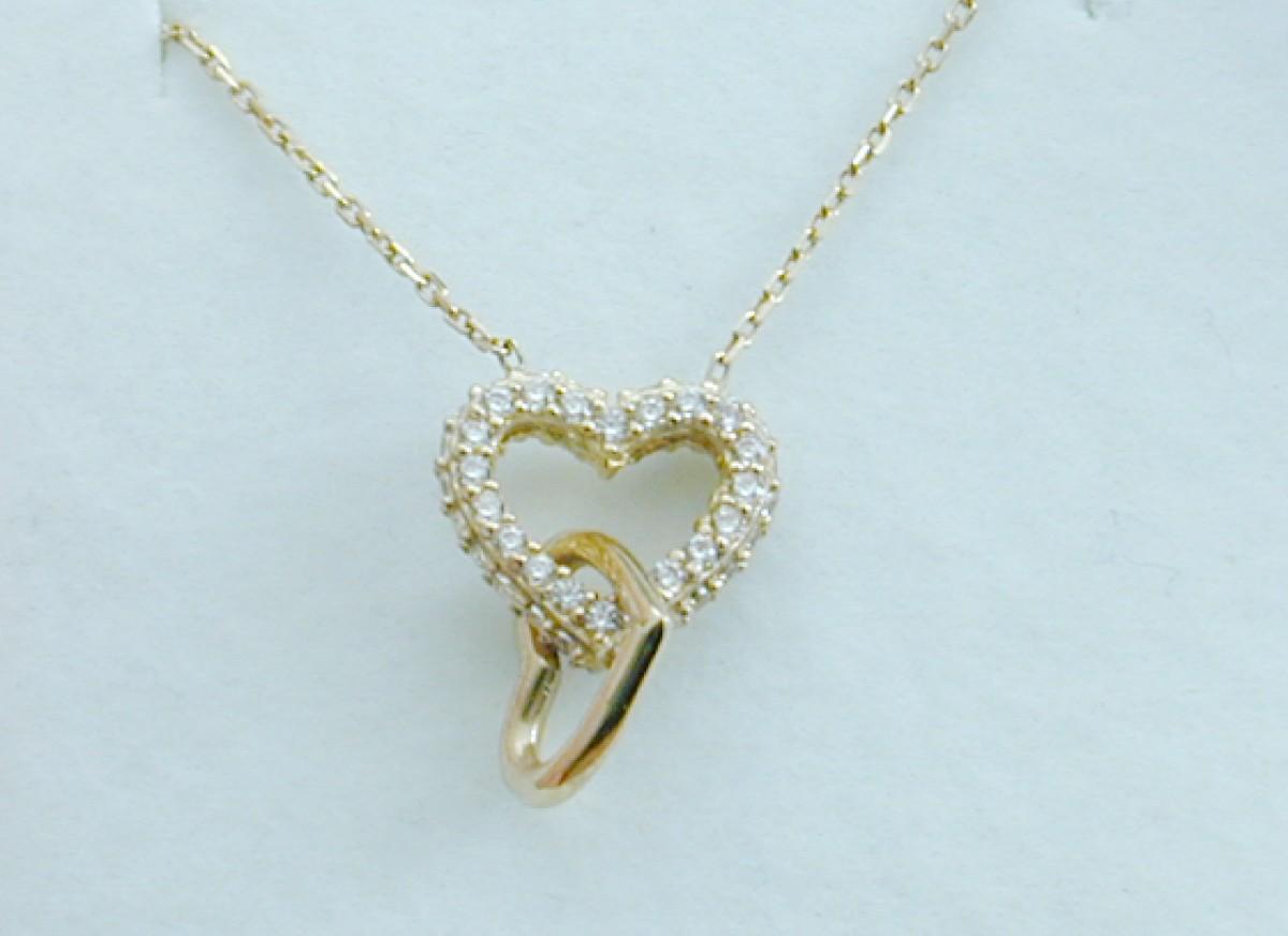 10k yellow gold intertwined heart necklace, super fine link chain measures 18 inches with heart pendant measuring 15mm tall. One of the hearts is set with 63 small round diamonds on all side, weighs 2.8 grams