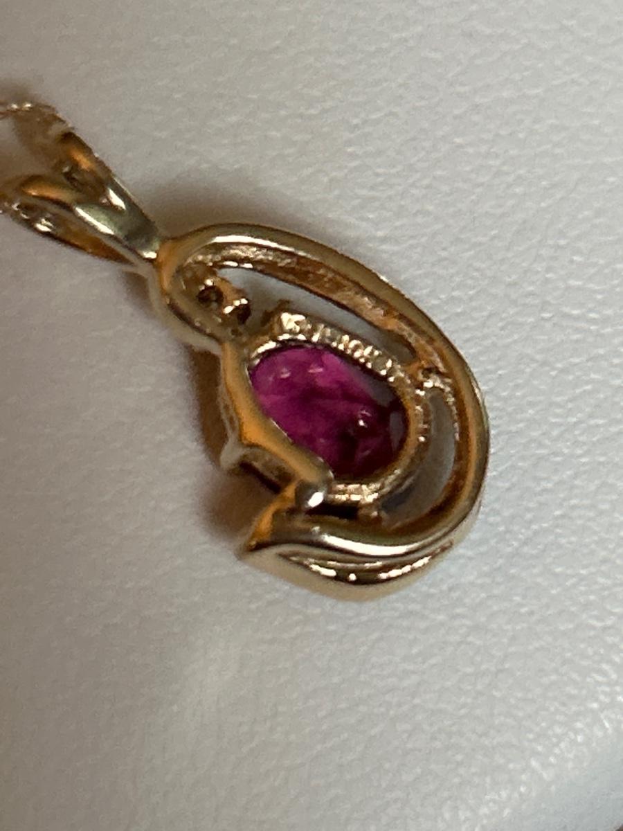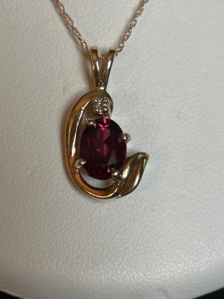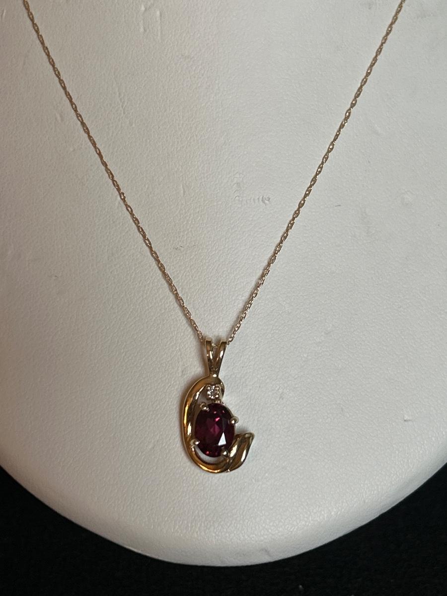 The chain and pendant are both 10K, the chain is 20”. It might be a Rodalite Garnet and a small diamond.