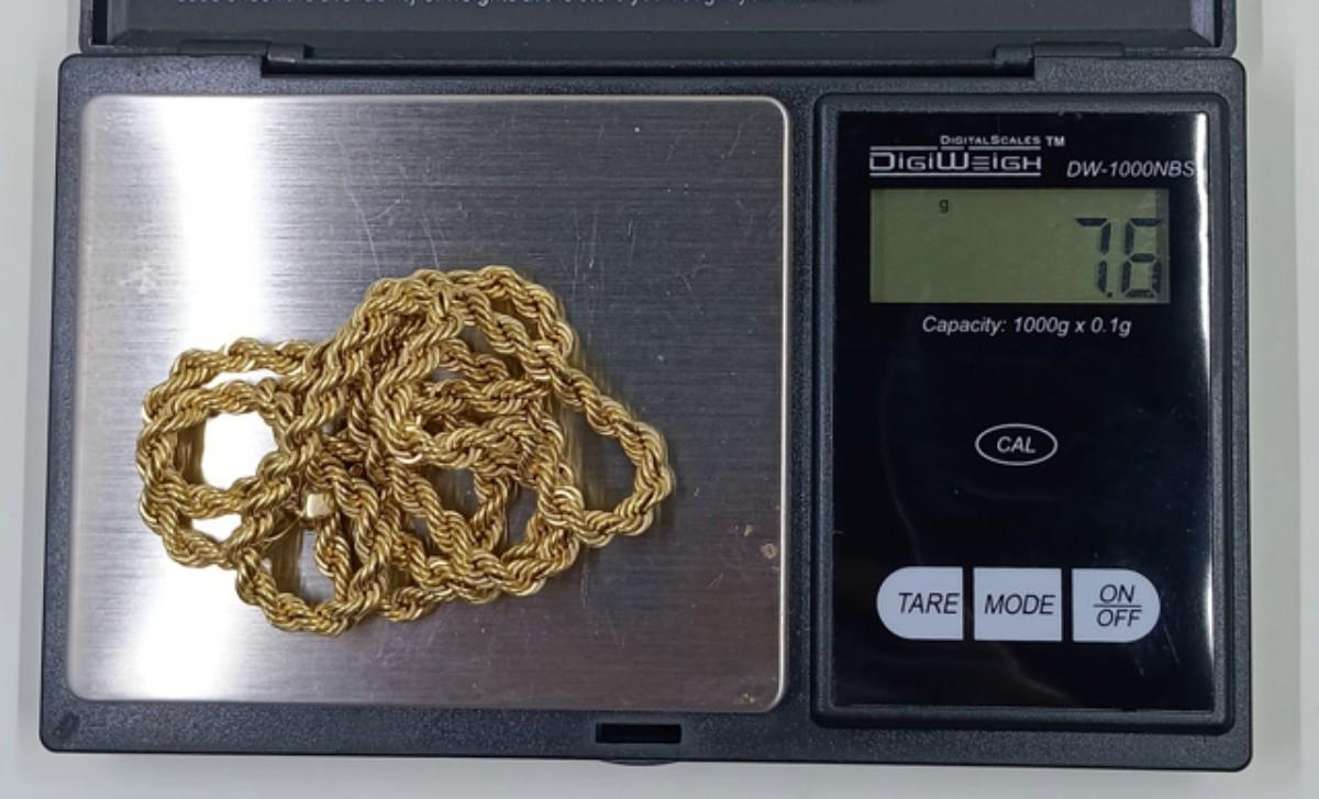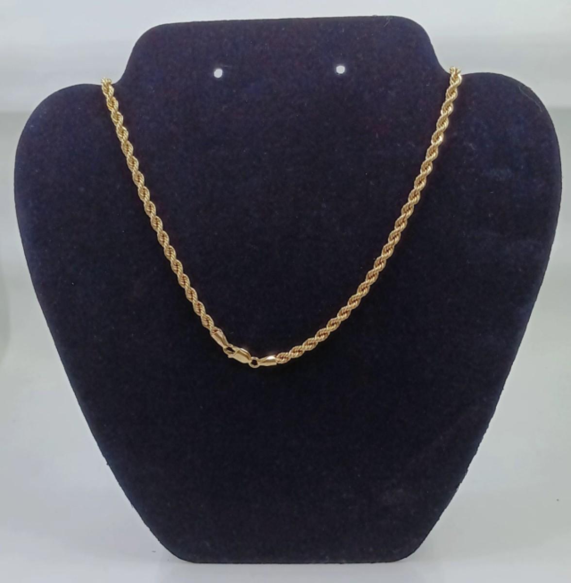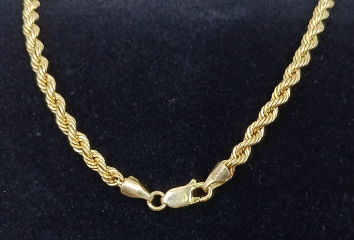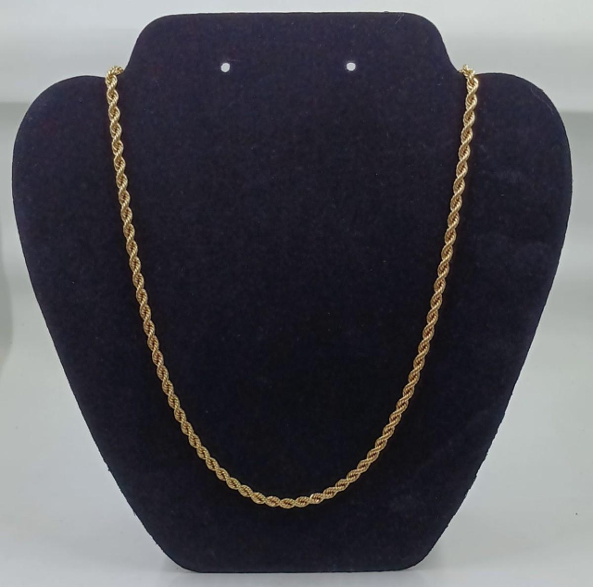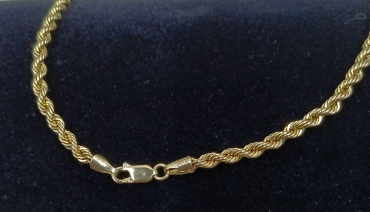 This 10K yellow gold rope chain is marked Turkey, 10K and PGDA. The chain measures approximately 22" long.