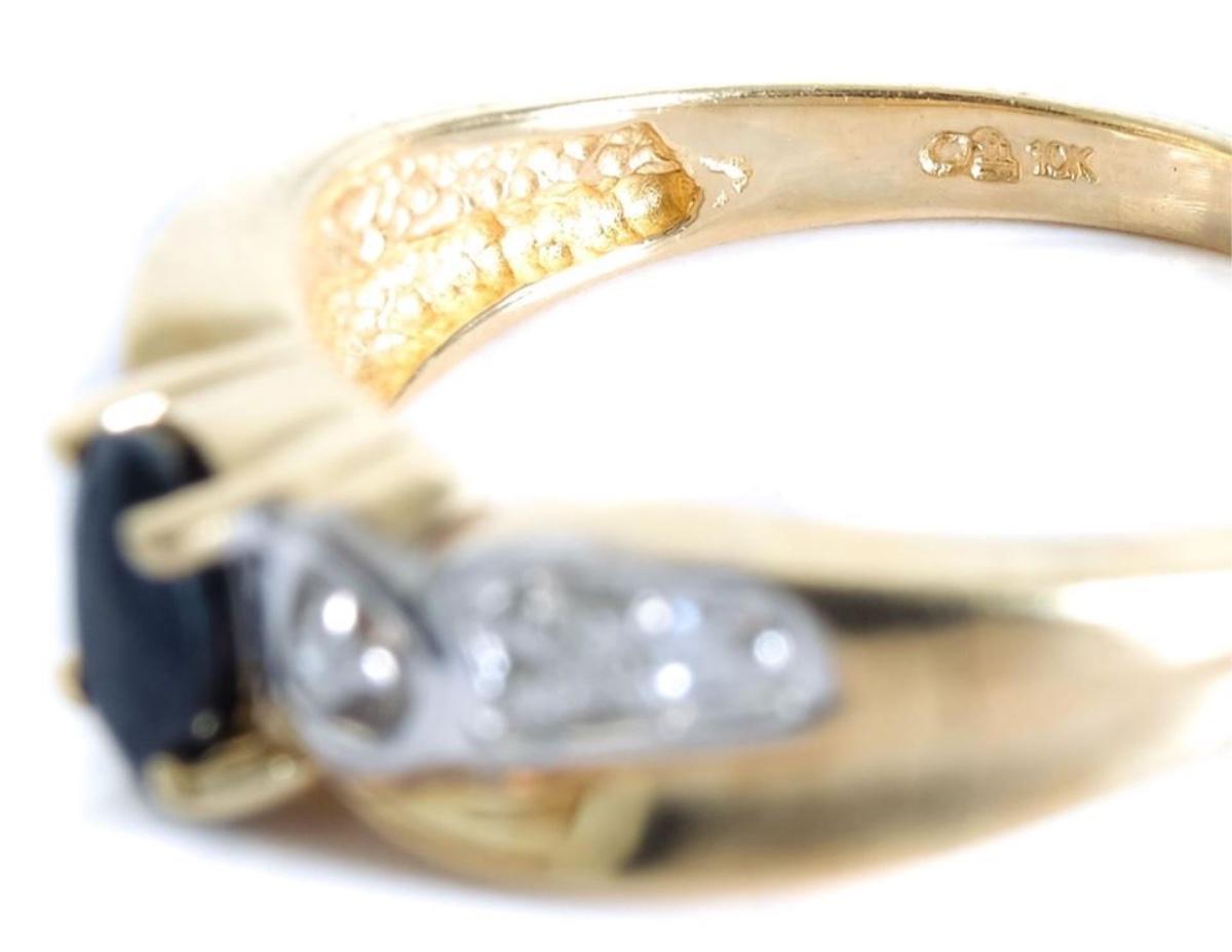 10K yellow and white gold ring having oval faceted sapphire and diamond accents. Ring size 7 1/2. Stamped 10K. Approx. overall weight 2.18 grams.