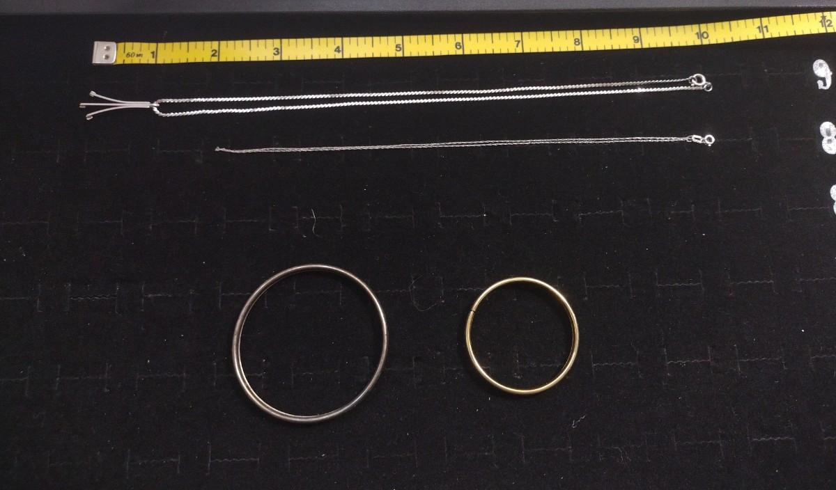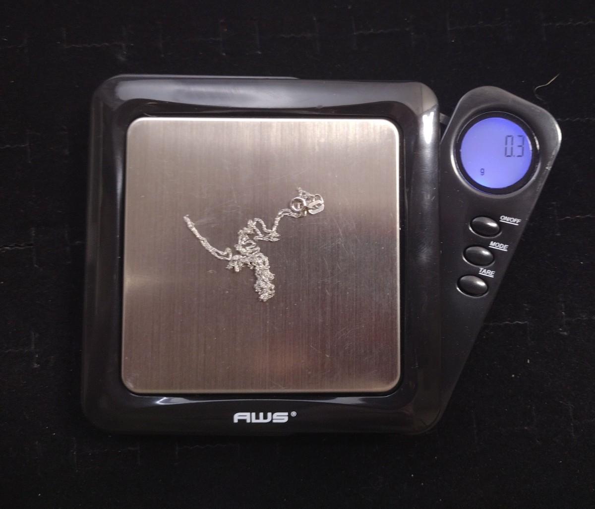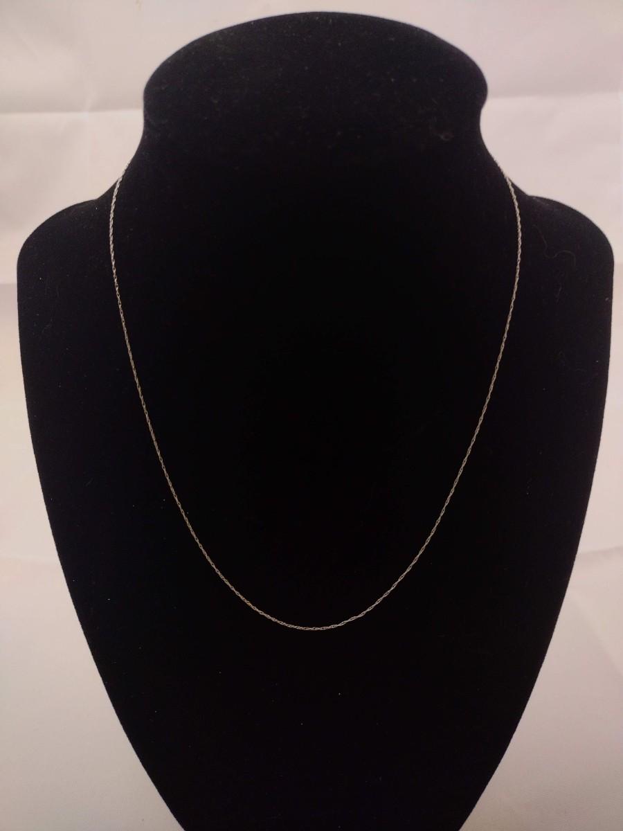 10KT gold chain weighs 0.3 grams, 16 inches long.