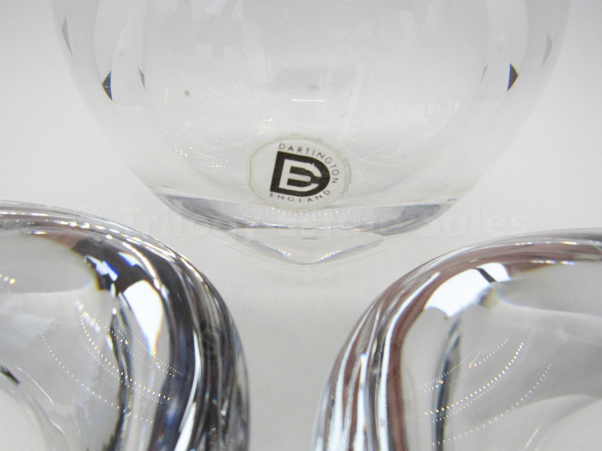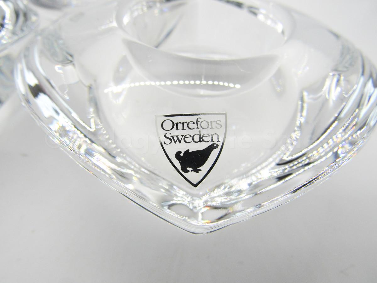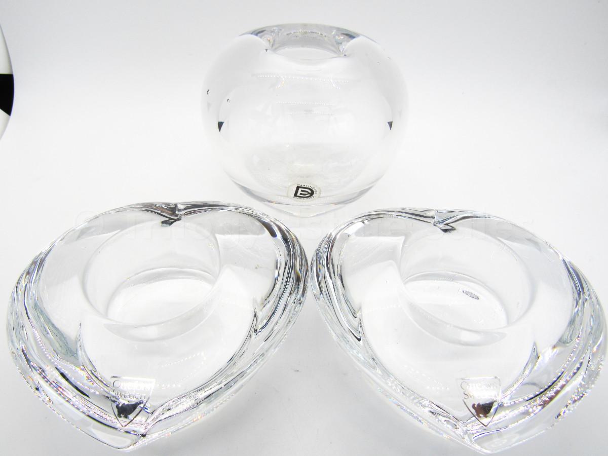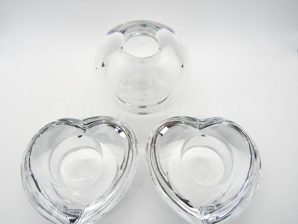 Oreforrs candlestick 4”w x 1.25”h; glass heart and darttington glass vase
