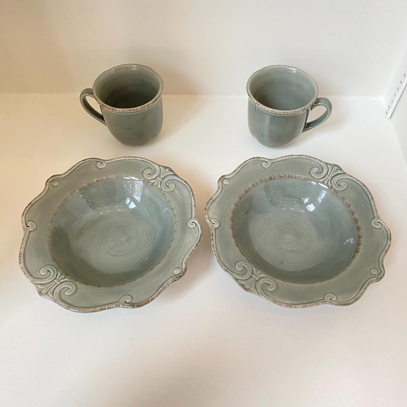No markings / Includes = 2 of 10.5” Plates , 2 of 8” Plates , 2 of 9” Bowl, 2 Coffee Cups, 1 of 12x9” Oval Serving Bowl , 1 of 15.5” Oval Serving Dish