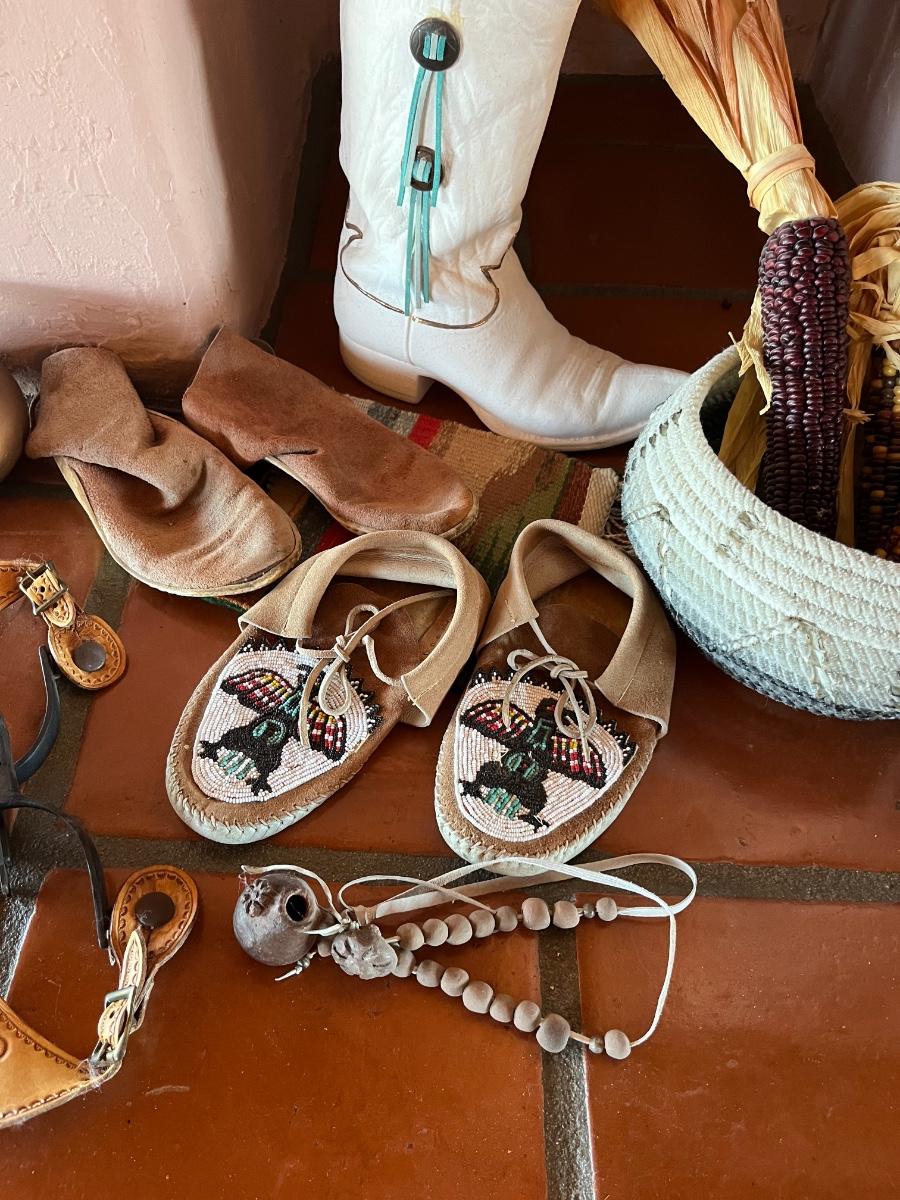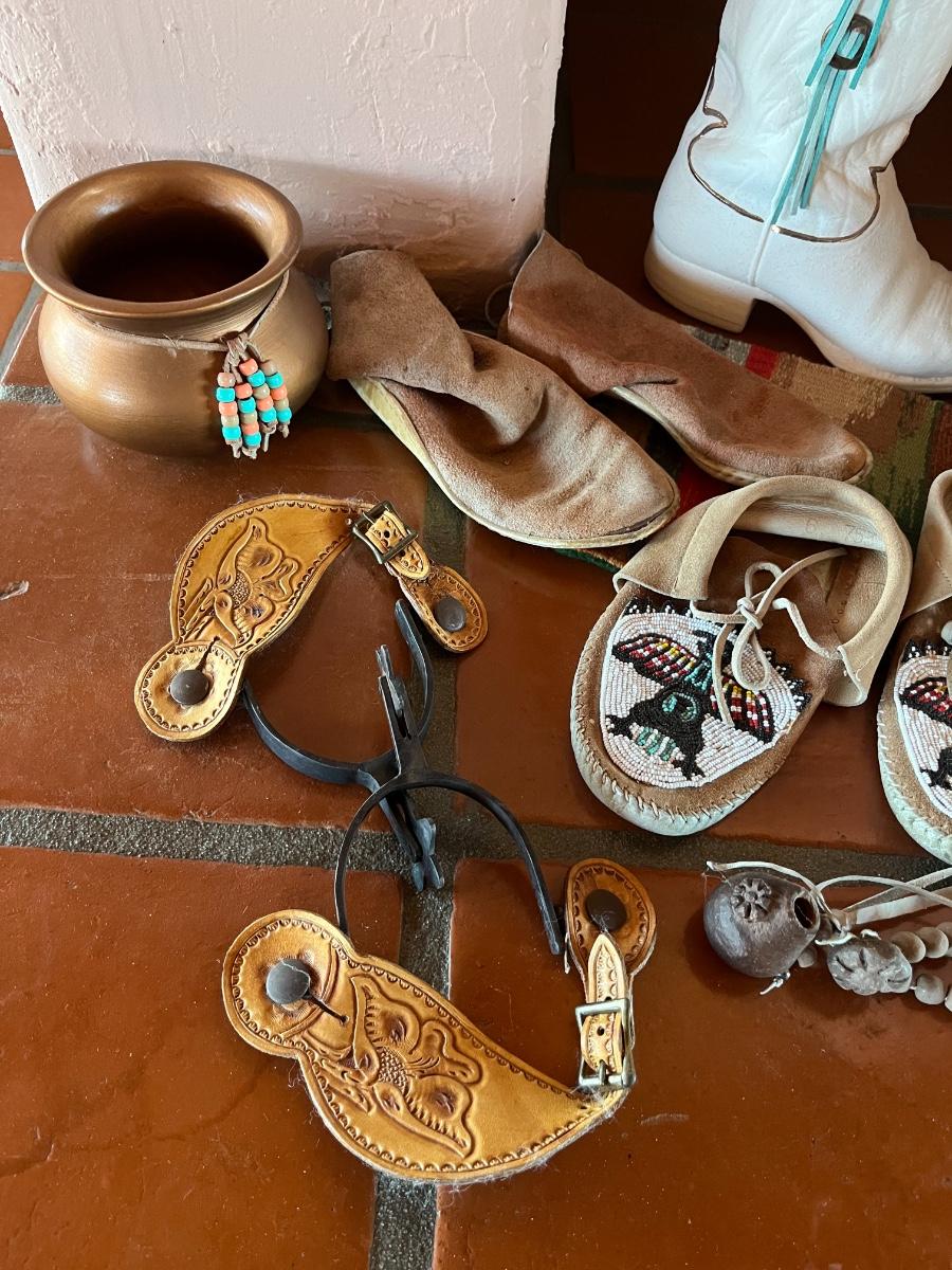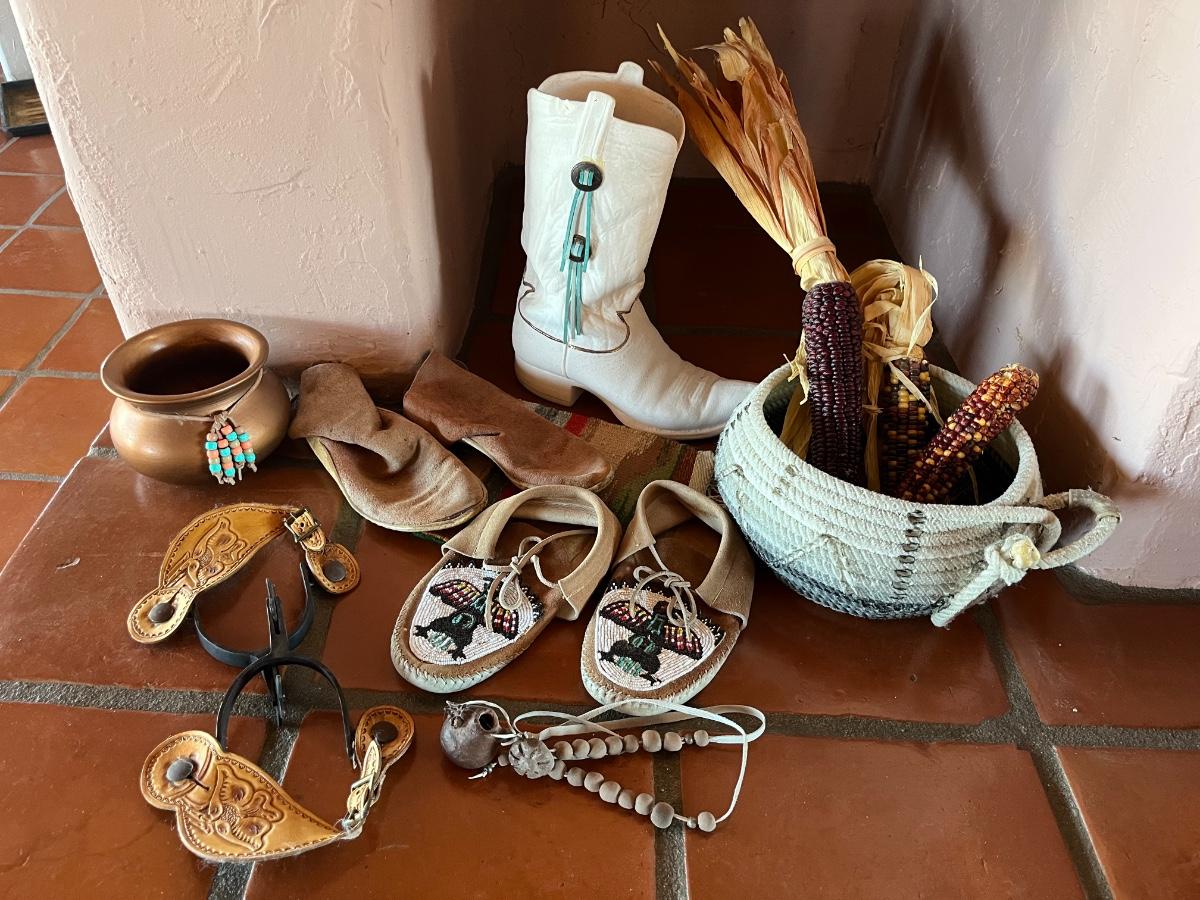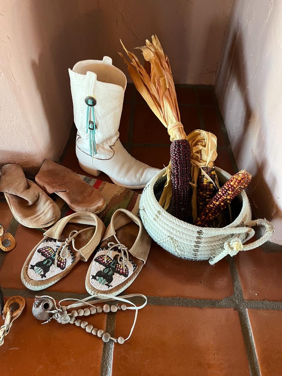 10pc Native American Collection Lot - 1 small sw woven quilt, 1 ceramic cowboy boot, 1 copper bowl, 2 pairs of NA moccasins, 1 NA beaded jewelry, 1 woven bowl (with 3 faux corn husks inside)
