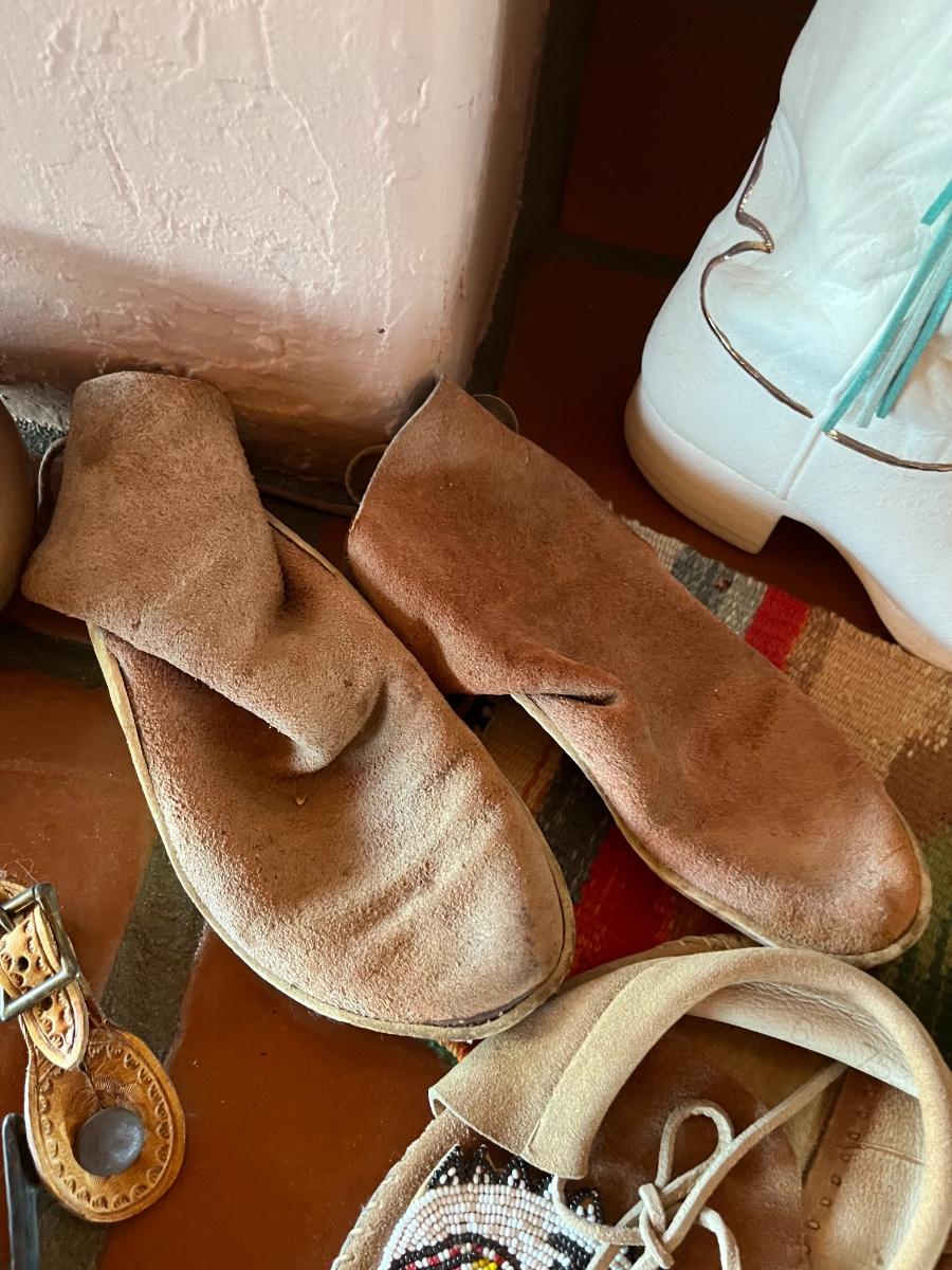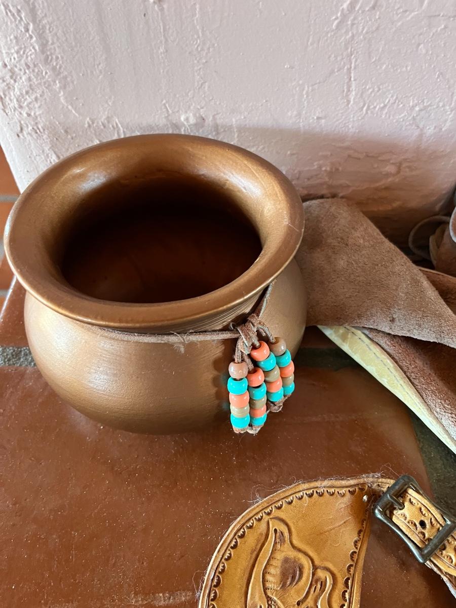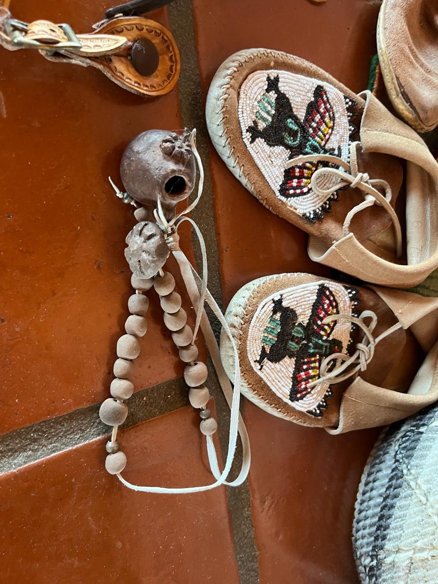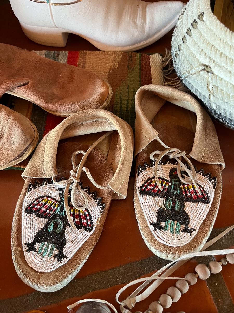 10pc Native American Collection Lot - 1 small sw woven quilt, 1 ceramic cowboy boot, 1 copper bowl, 2 pairs of NA moccasins, 1 NA beaded jewelry, 1 woven bowl (with 3 faux corn husks inside)