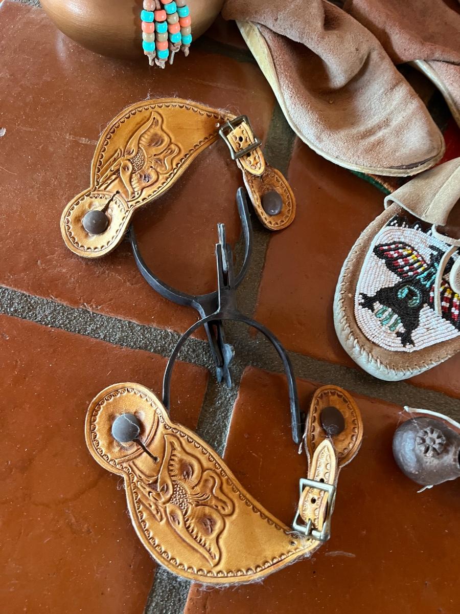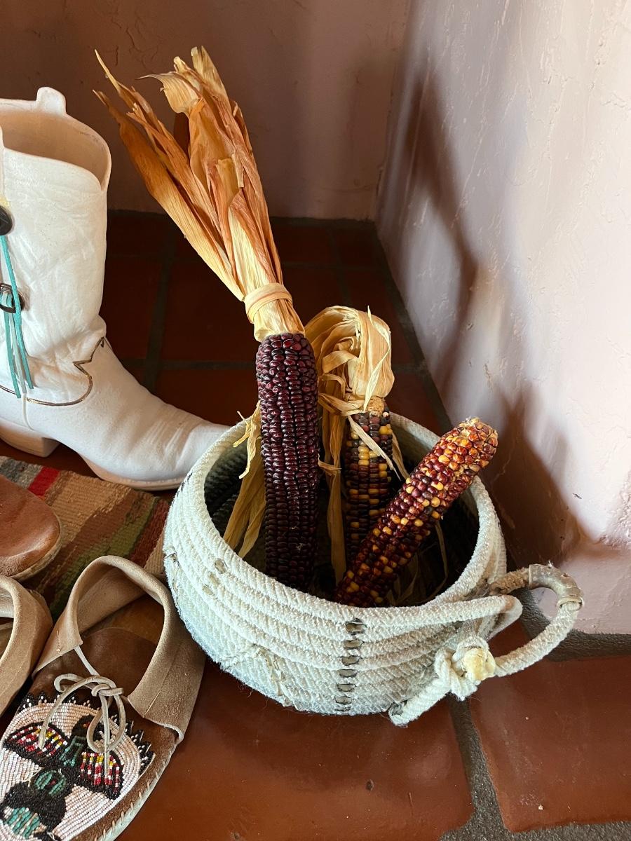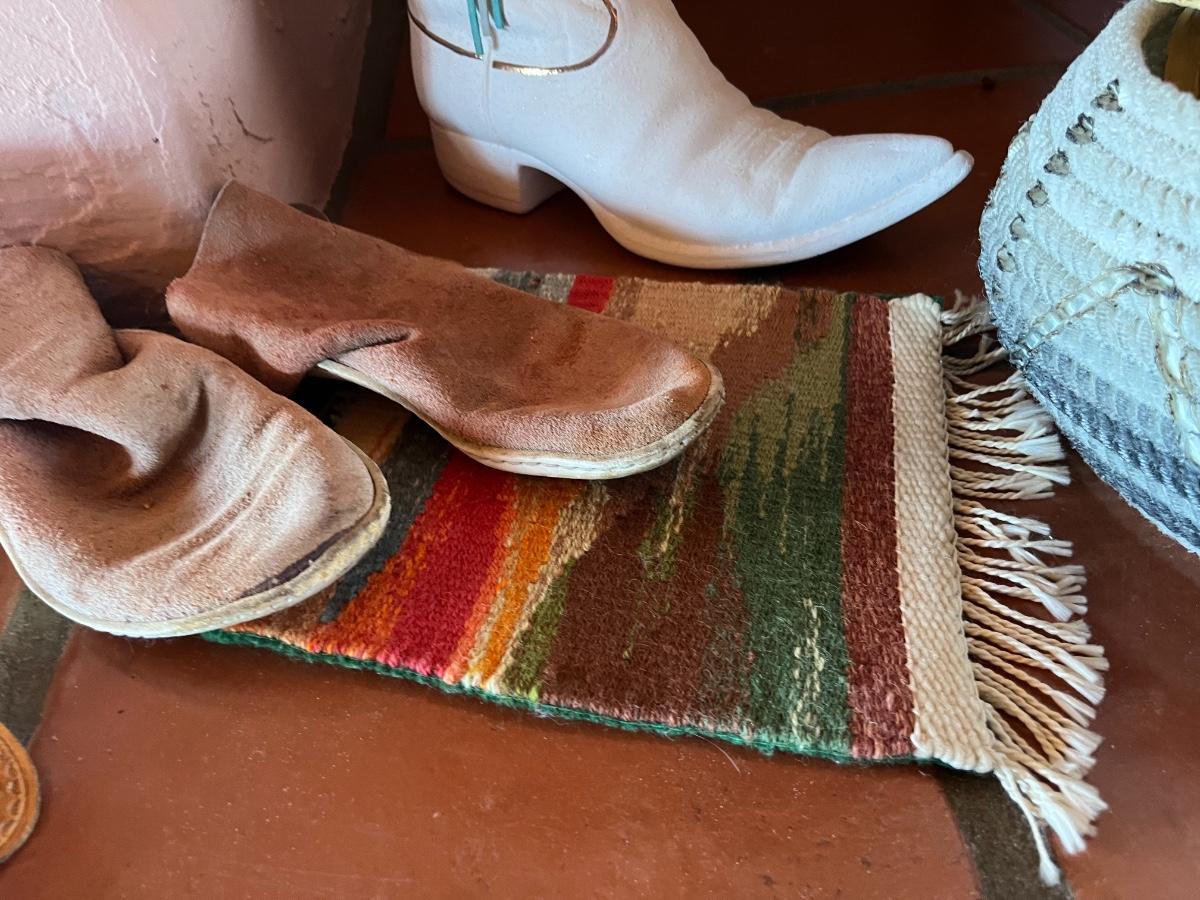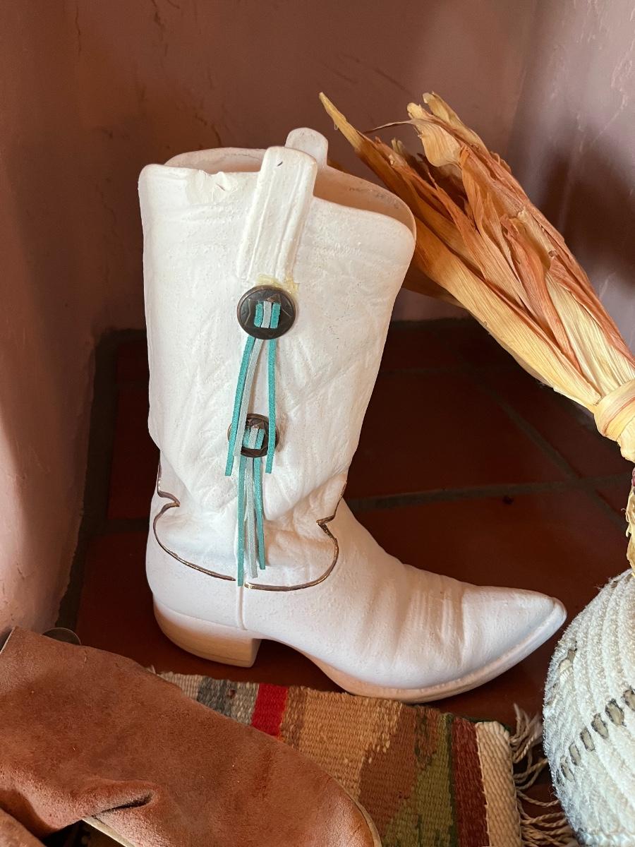 10pc Native American Collection Lot - 1 small sw woven quilt, 1 ceramic cowboy boot, 1 copper bowl, 2 pairs of NA moccasins, 1 NA beaded jewelry, 1 woven bowl (with 3 faux corn husks inside)