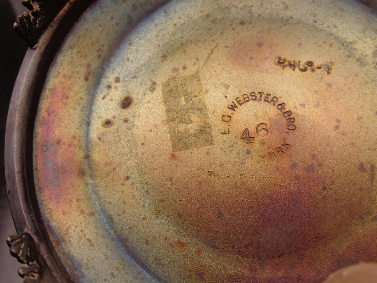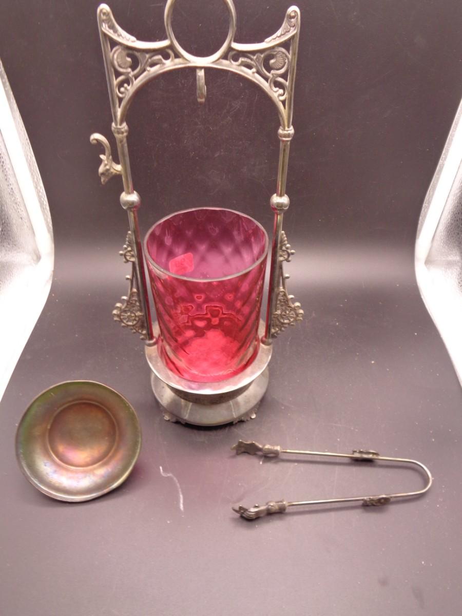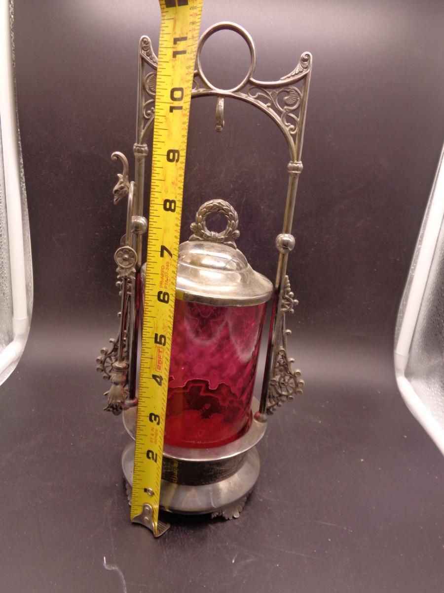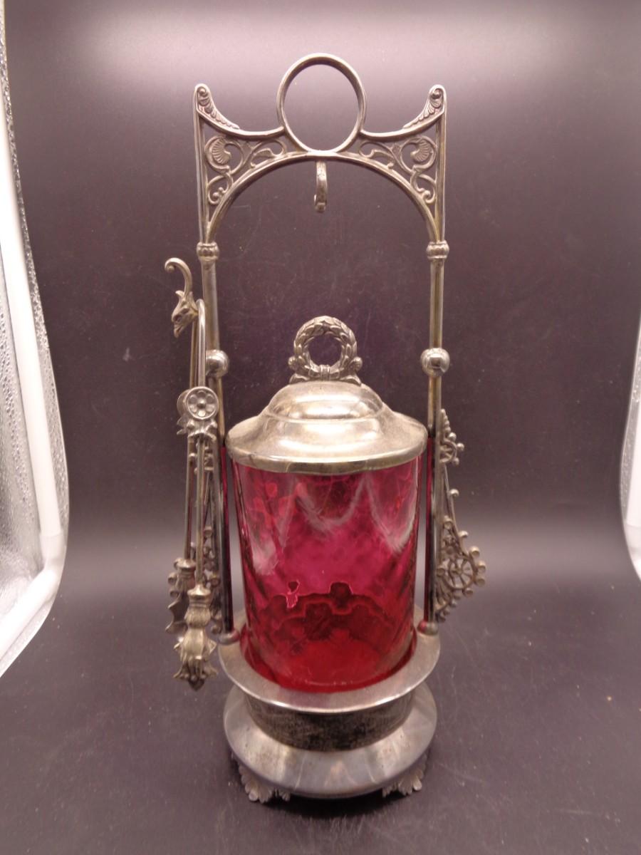 11 3/4" Webster Triple Plate Silverplate Pickle Castor w/Tongs Cranberry Diamond Cut #102