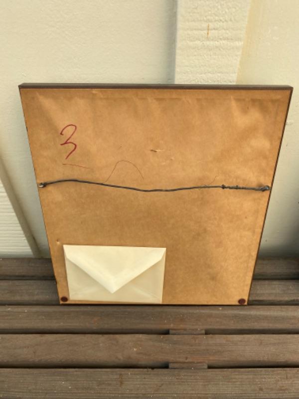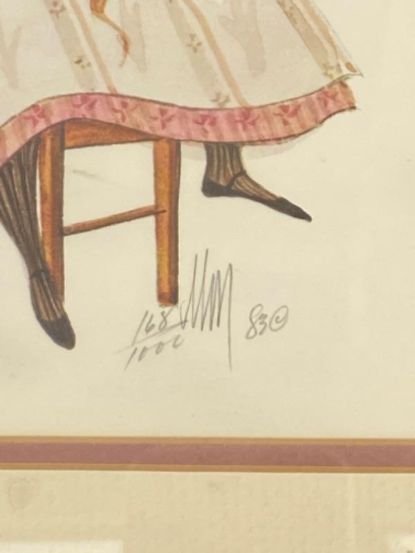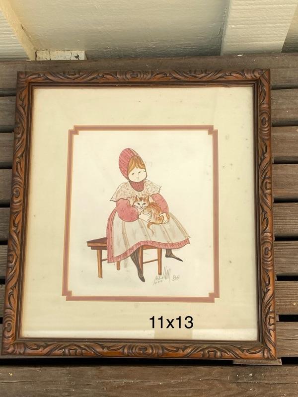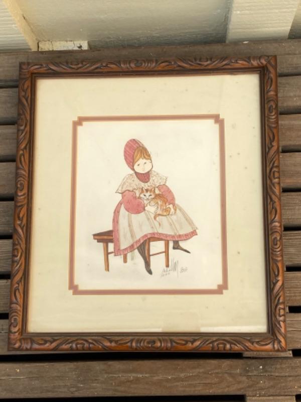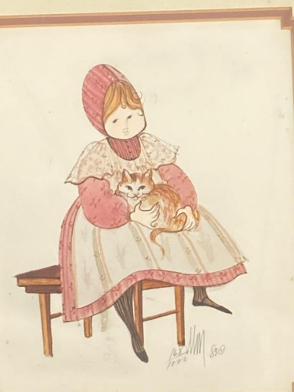 1983 Artwork #168/1000 Limited Edition P Buckley Moss print, framed, Amish girl on bench holding orange cat 11" x 13"