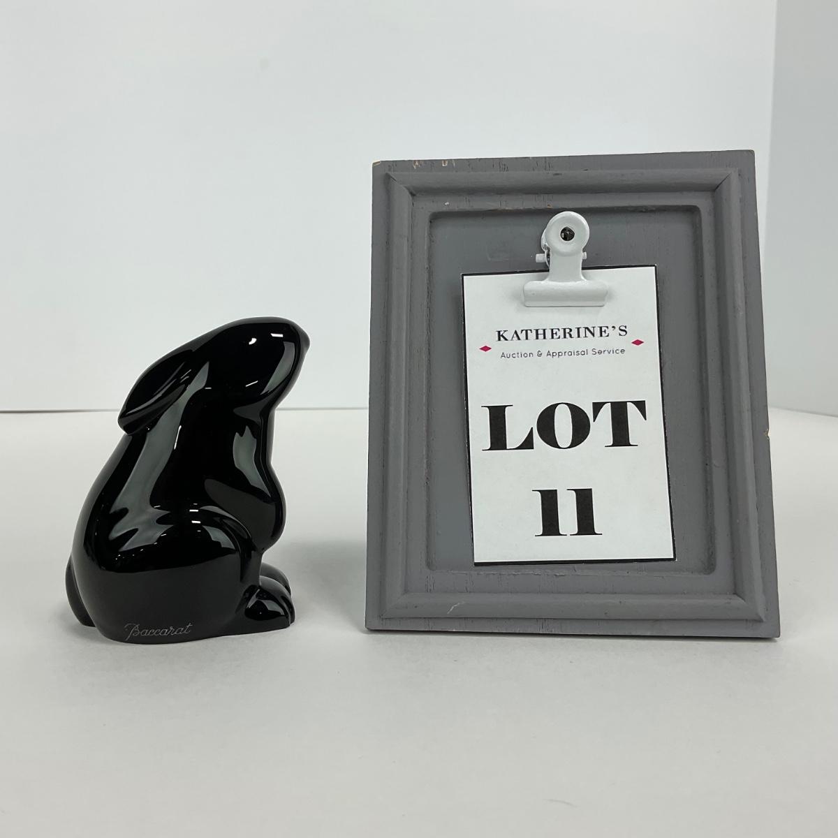 One Baccarat marked and signed black colored rabbit. 2.5 inches wide by 3 inches tall. This piece does have a few flea bite marks but otherwise appears to be in good shape. Please see photos for details and condition. Any condition statement is given as a courtesy to a client, is an opinion, and should not be treated as a statement of fact. Reference to condition written, oral or within a condition report shall not be regarded as a full account of condition and may not include all defects, alterations, or restorations. Absence of a condition report does not imply a lot is flawless or lacking imperfections or damage. Katherine’s Auction & Appraisal Service shall have no responsibility for any error or omission. Returns shall not be accepted on the basis of condition. ::: Shipping is available on this lot. If you require shipping you must let us know at the close of the auction. We will coordinate with you after the item has been won. Shipping fees will include insurance up to or exceeding the value of all items being mailed. If you have any questions regarding this lot please contact the auctioneer either via this website, by direct email or by phone. PICK UP TIMES and other important information can be found in the TERMS and DESCRIPTION of the auction. Please take a look for pertinent information. Thanks!