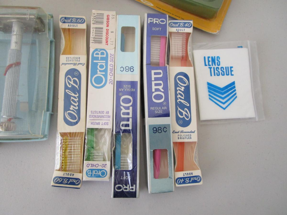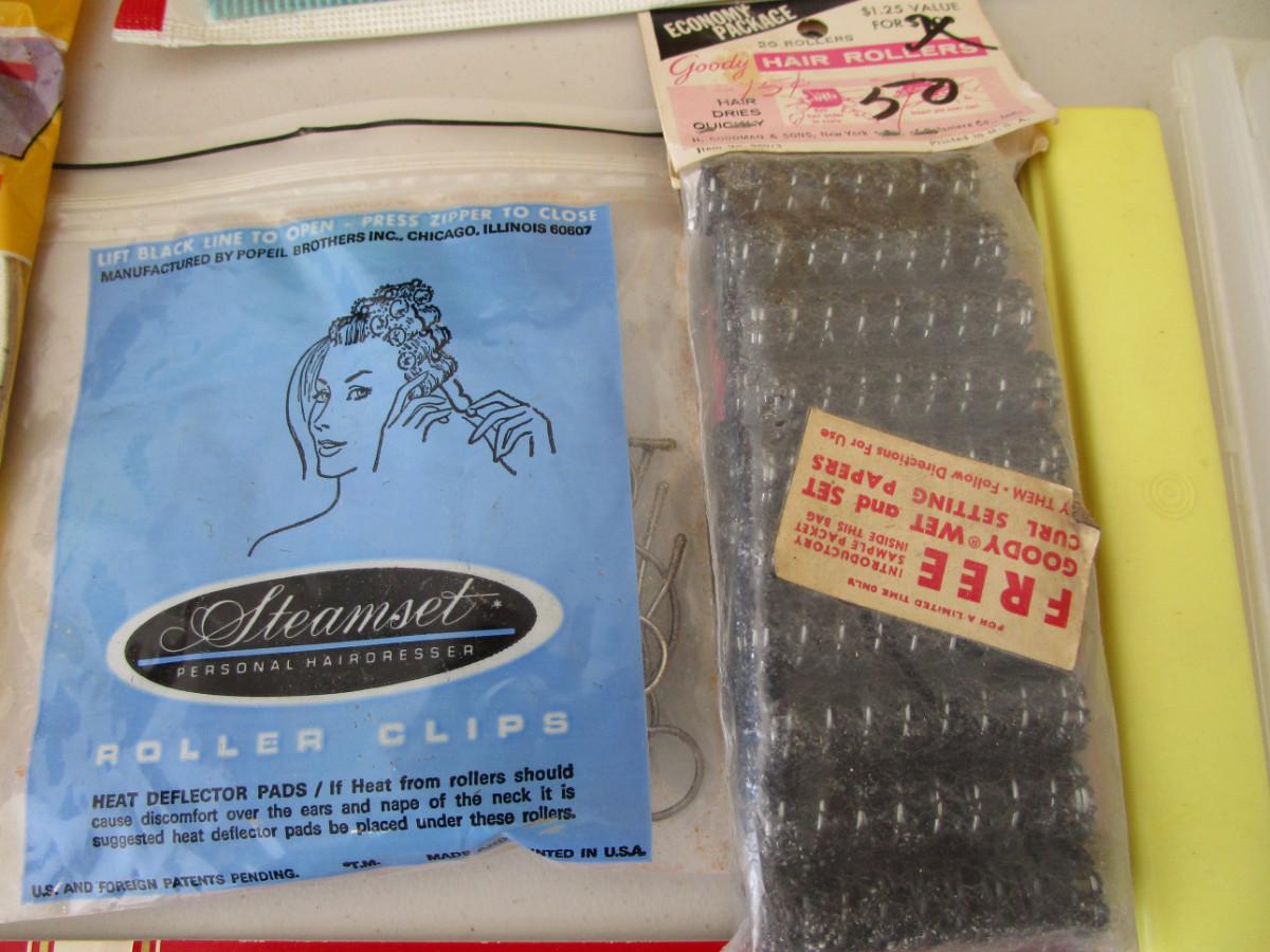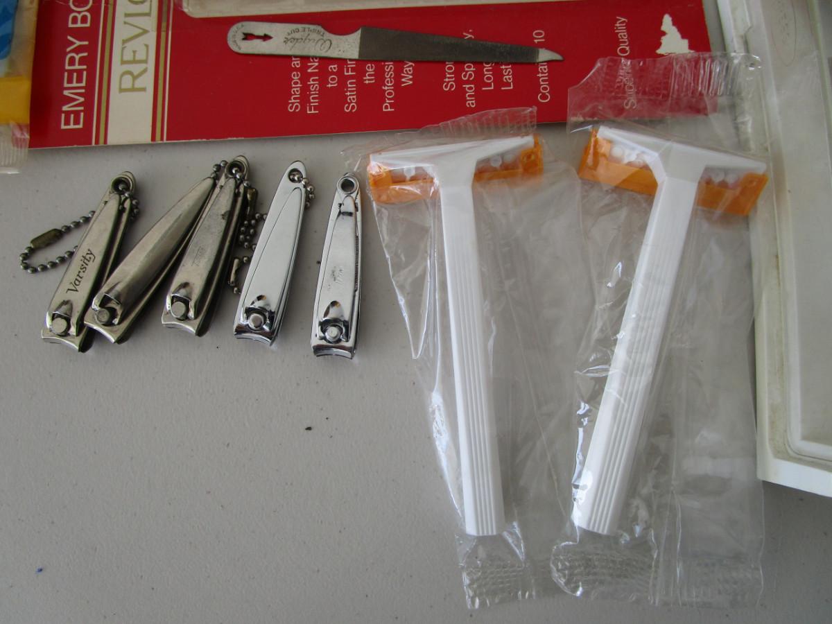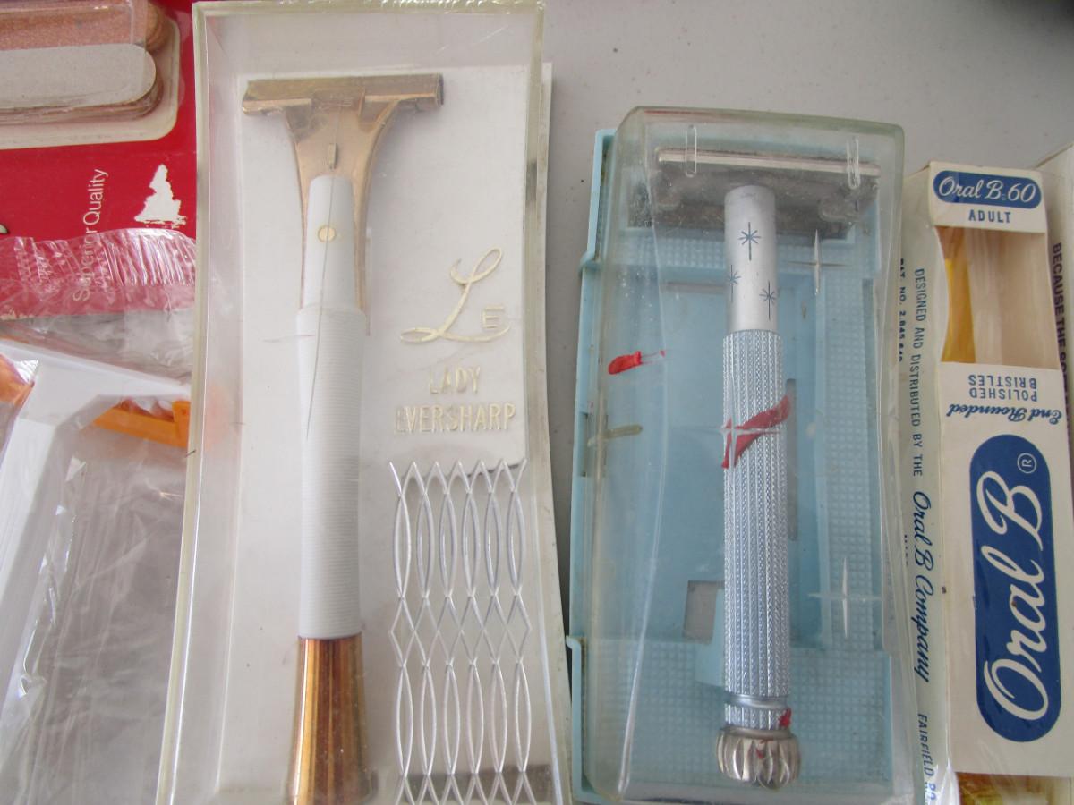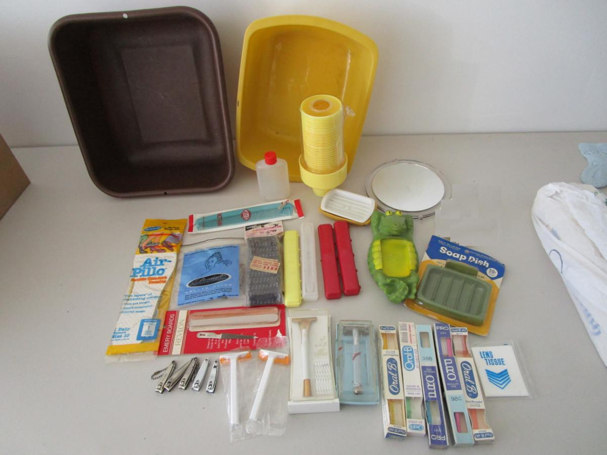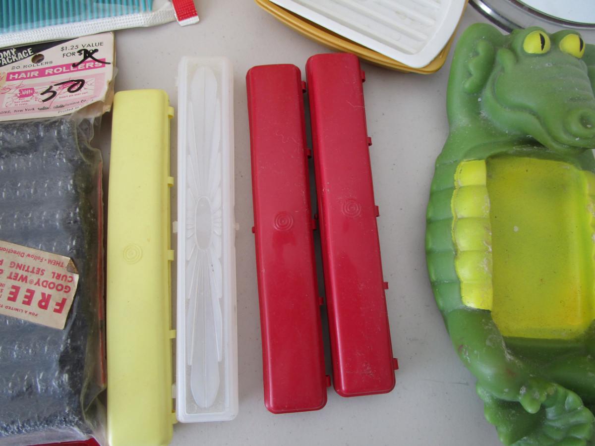 Soap dishes, new toothbrushes, toothbrush cases, cup dispenser with cups, 2 vintage razors, mirror, vintage brush curlers, fingernail clippers, comb, clothing brush with lady top and other misc.