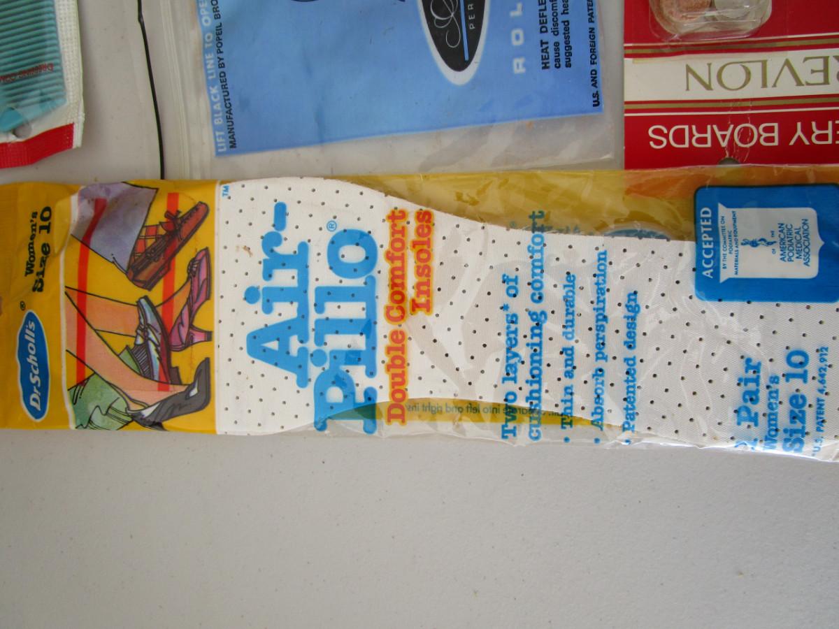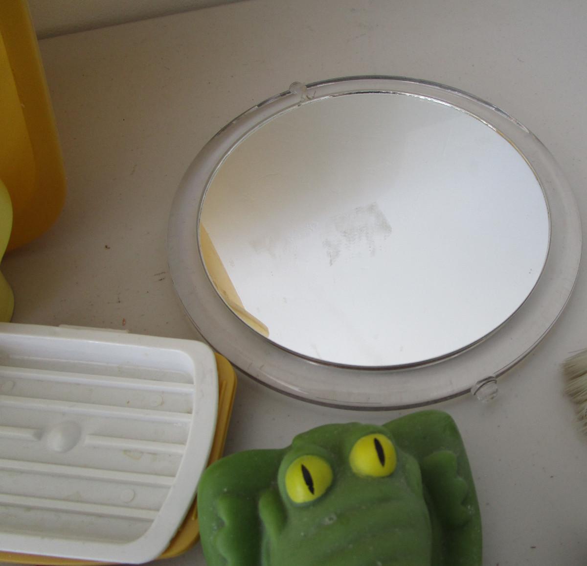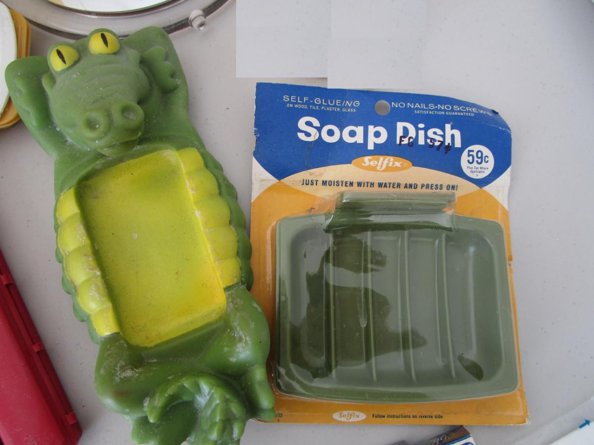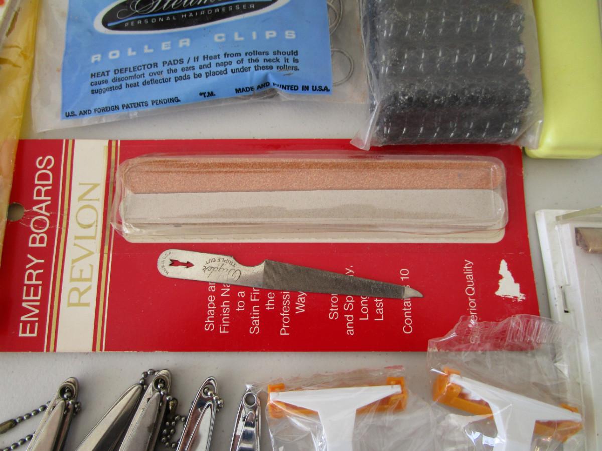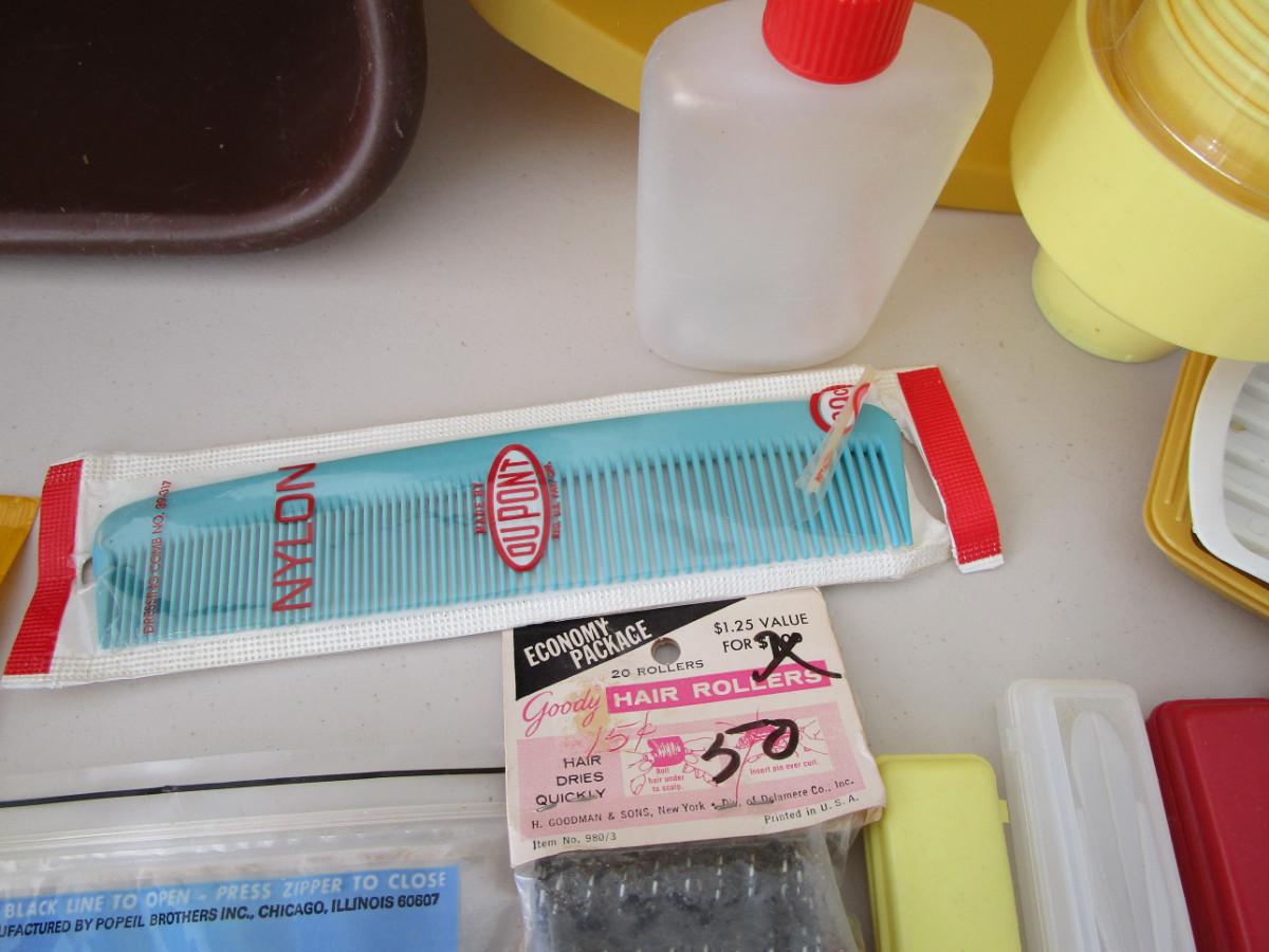 Soap dishes, new toothbrushes, toothbrush cases, cup dispenser with cups, 2 vintage razors, mirror, vintage brush curlers, fingernail clippers, comb, clothing brush with lady top and other misc.